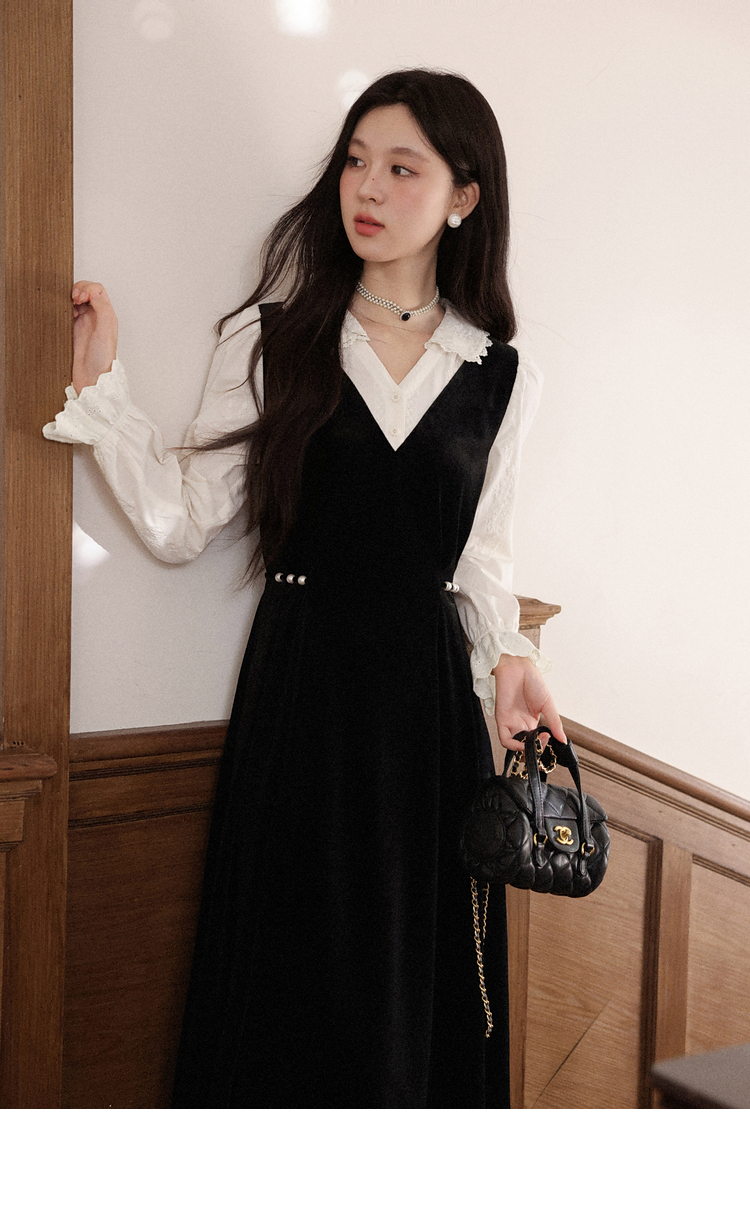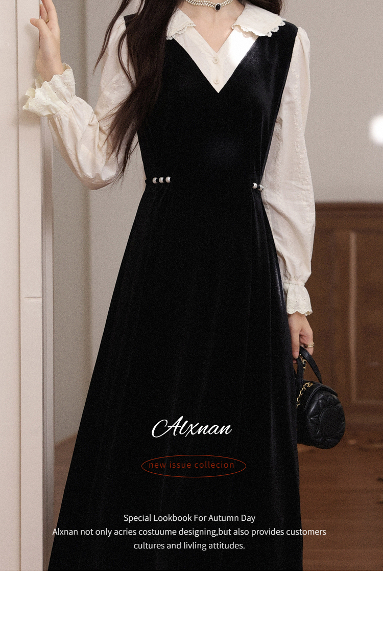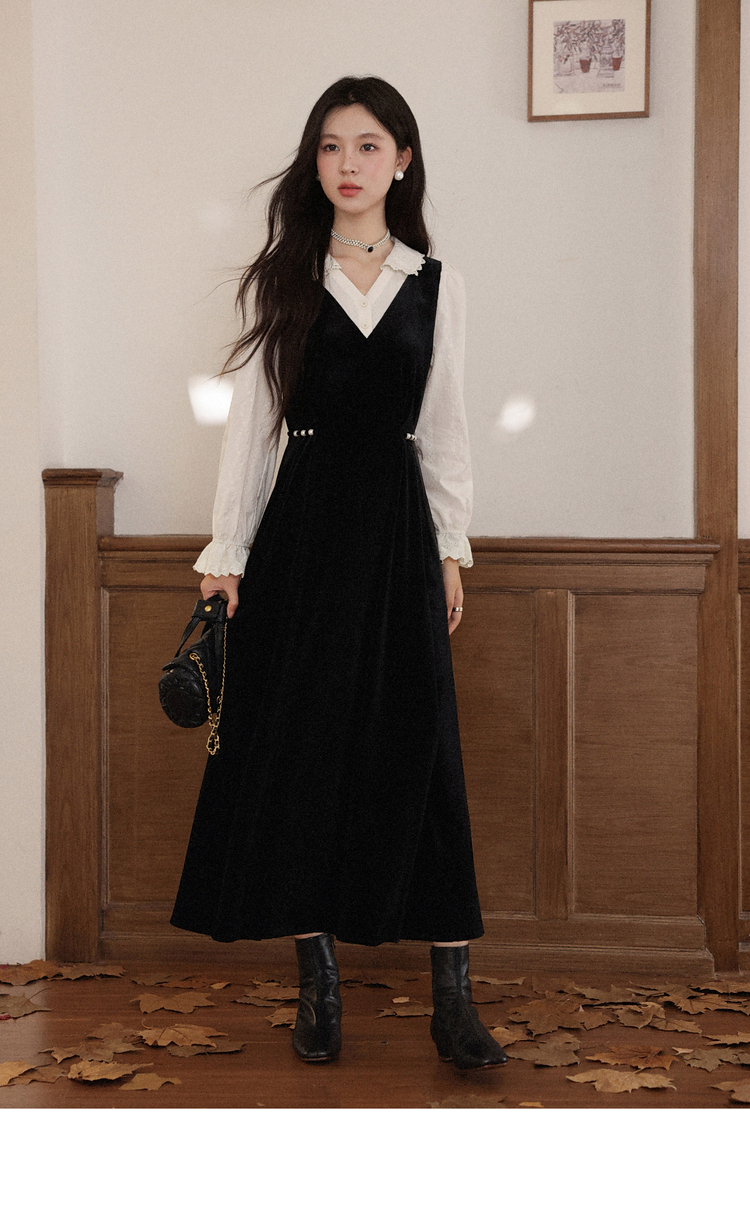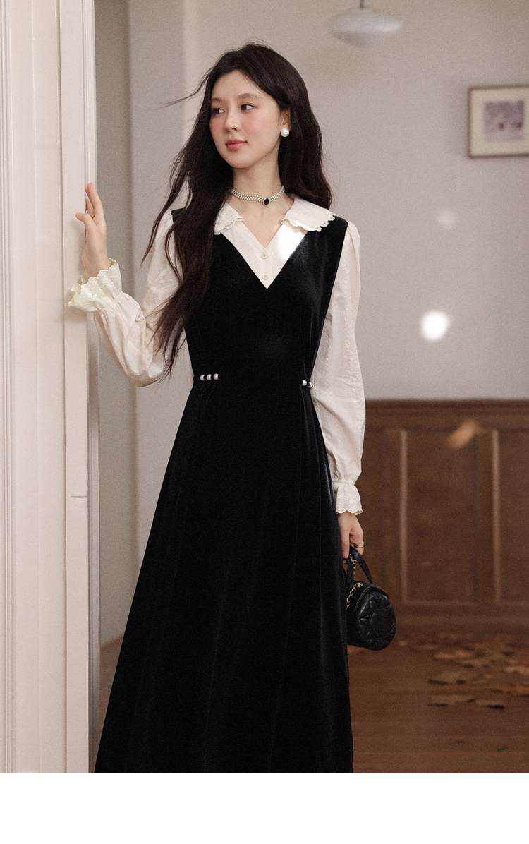 鹿向南「迷迭花园」法式假两件黑色连衣裙女秋季新款收腰显瘦长裙