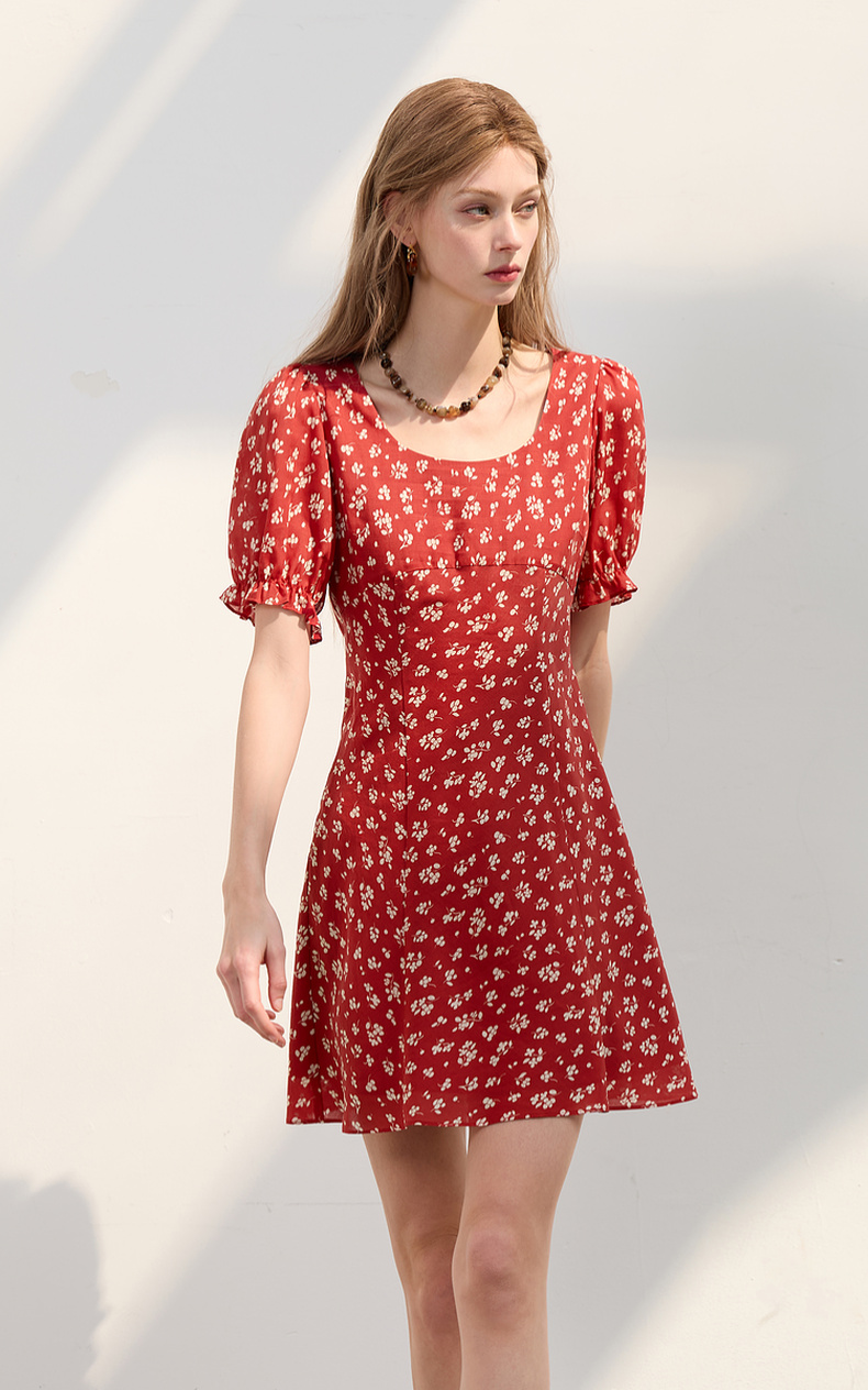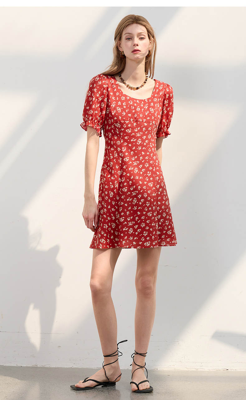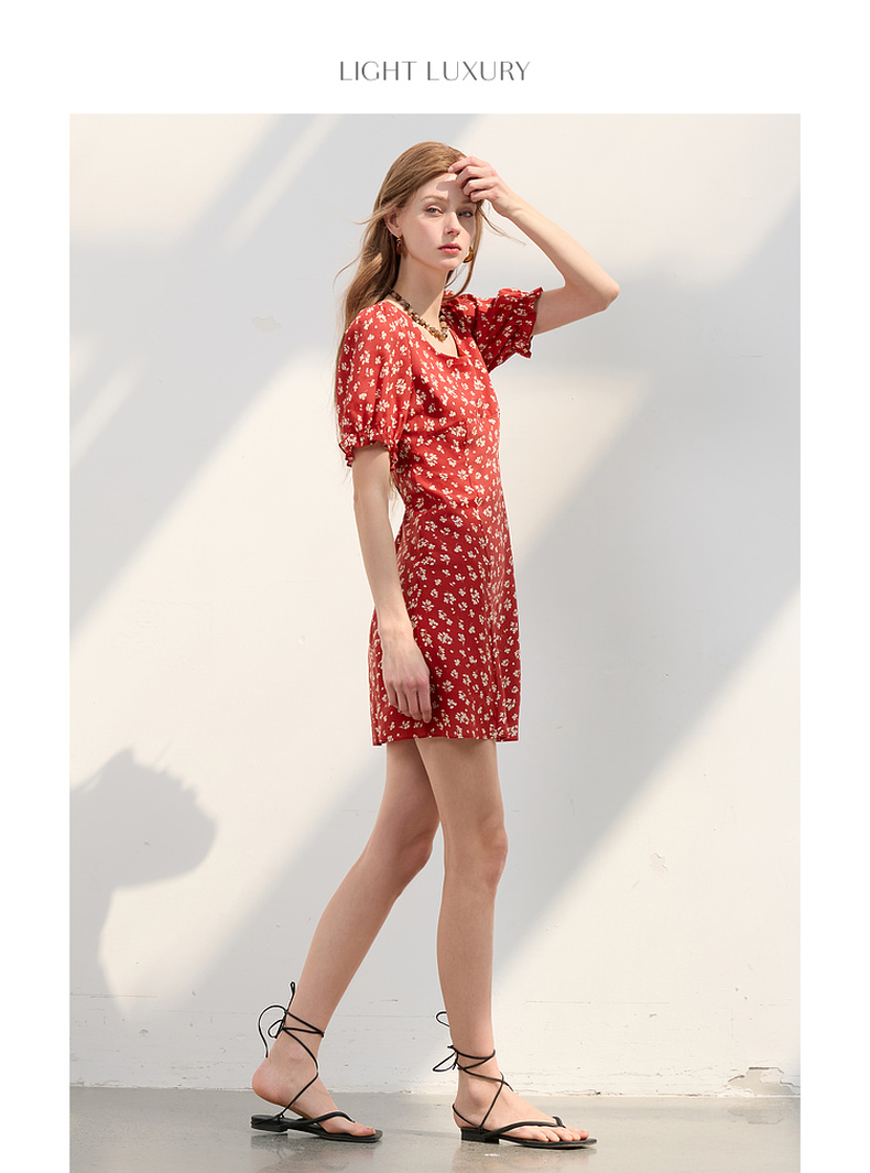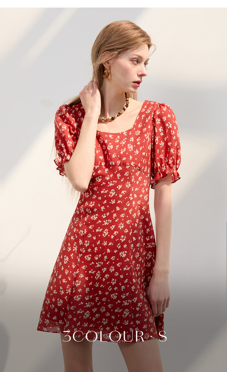 三彩2025夏季新款法式碎花裙泡泡袖收腰连衣裙短裙浪漫优雅S