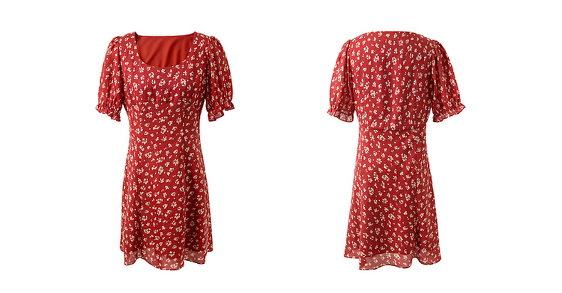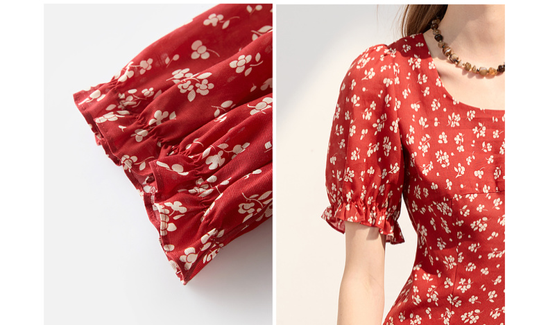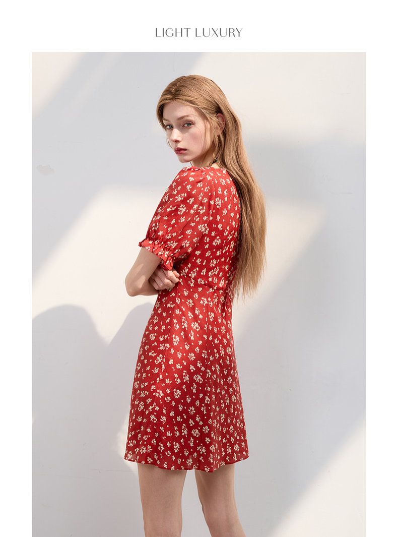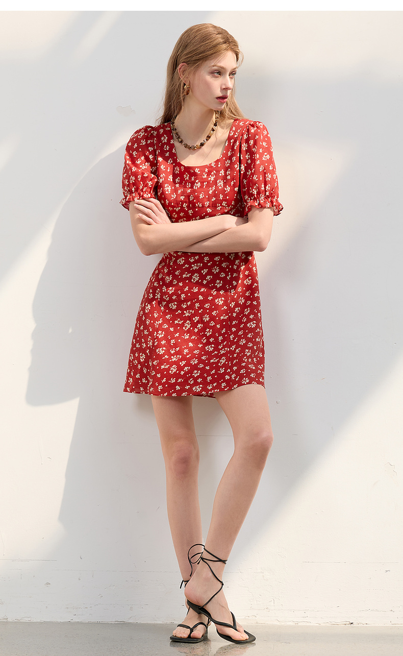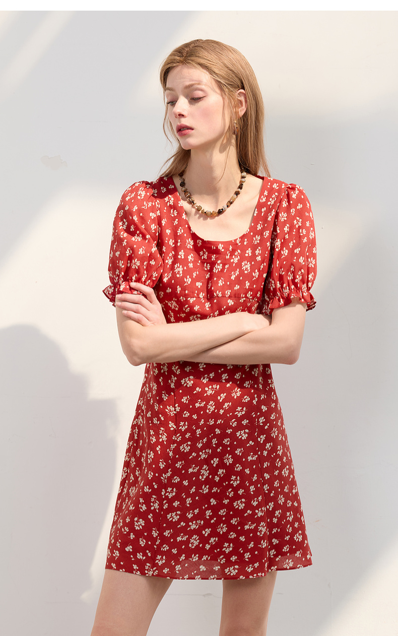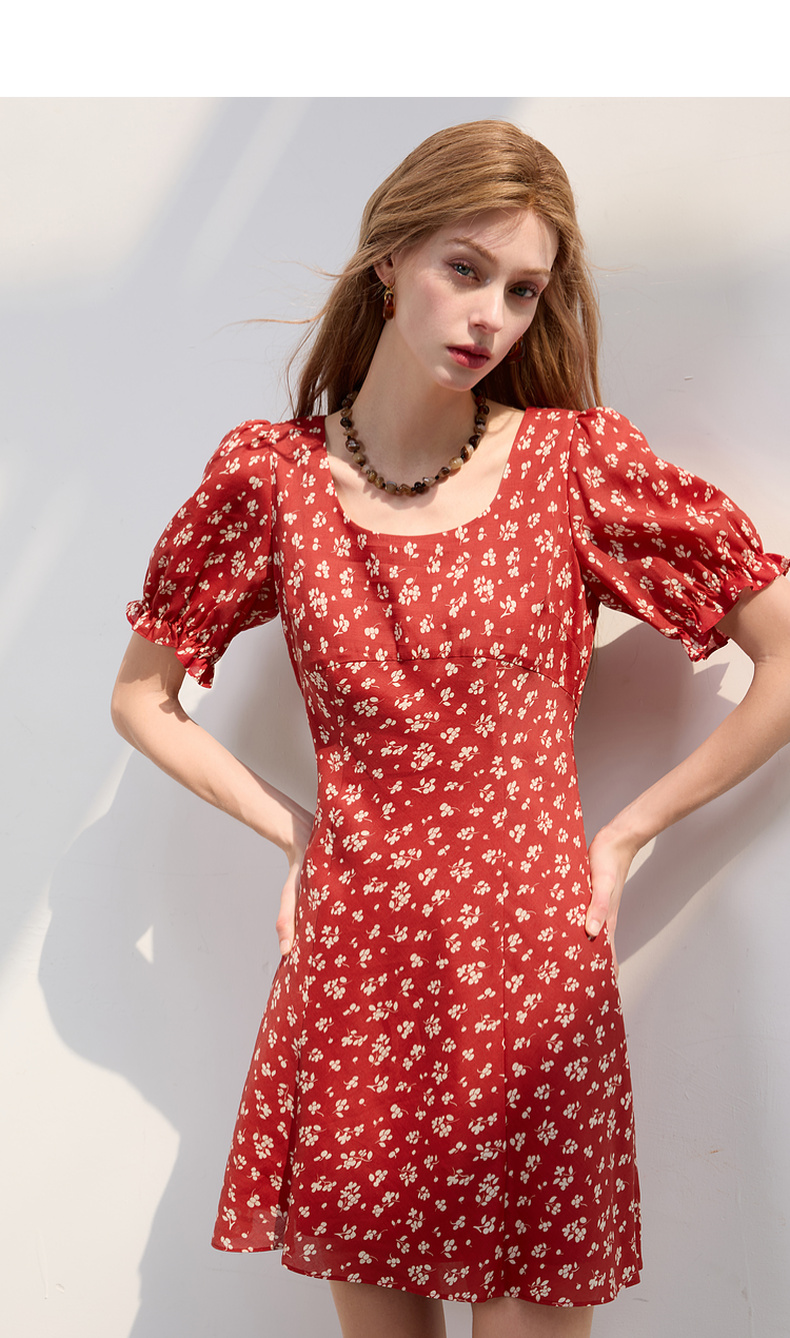 三彩2025夏季新款法式碎花裙泡泡袖收腰连衣裙短裙浪漫优雅S
