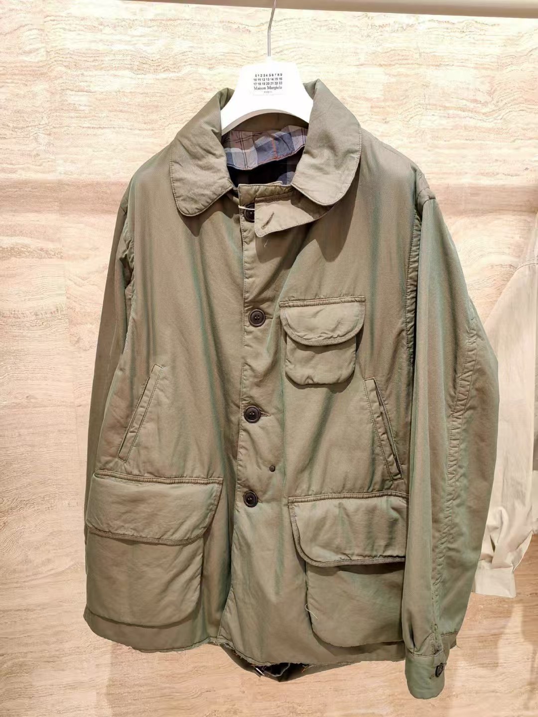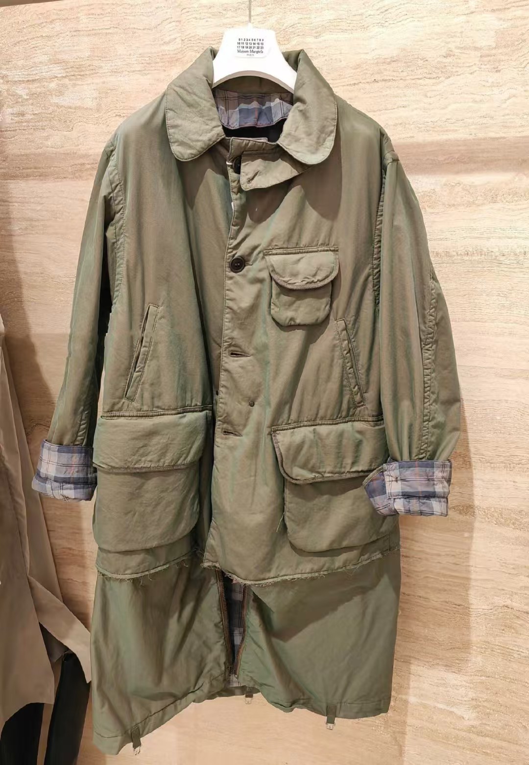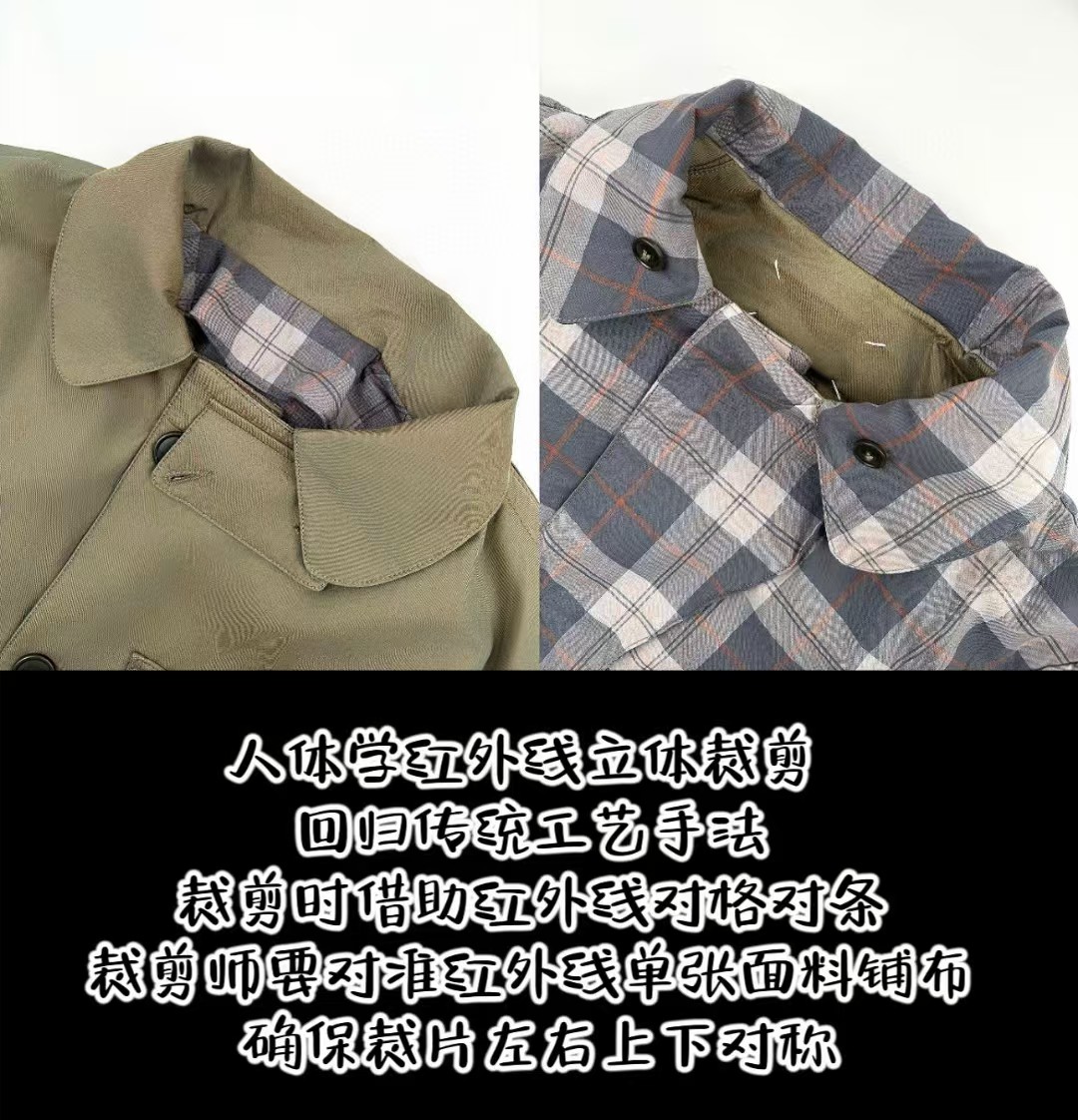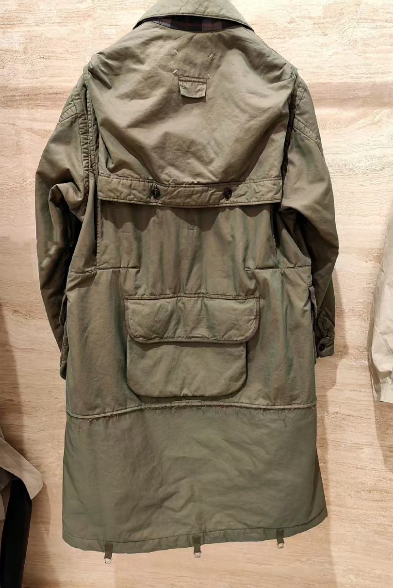 定制80支臻彩高密双色全棉精纺面料以及纯棉精梳格纹内衬绸缎 面料呈现渐变效果 从深绿色由不同角度层次过渡到浅绿色 (单单面料从定制到开发 足足花费90天多天) 肉眼可见得重工 以独特的军绿魅力为基调 以纯色口袋巧妙设计打造 后幅以标志性马吉拉品牌标识彰显品牌风范 加棉设计 给予你全方位的温暖守护 抵御寒冷侵袭 优雅大气 沉稳内敛 温暖与时尚的双重奏 以柔软的姿态成为跨界风尚的时尚先锋