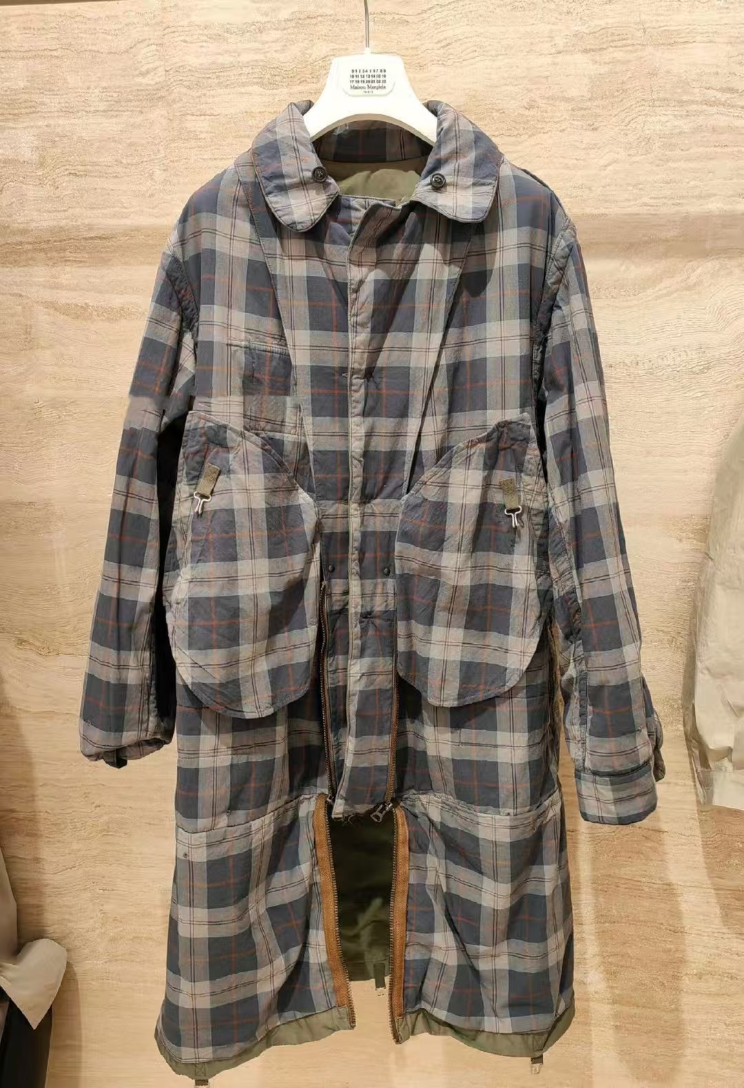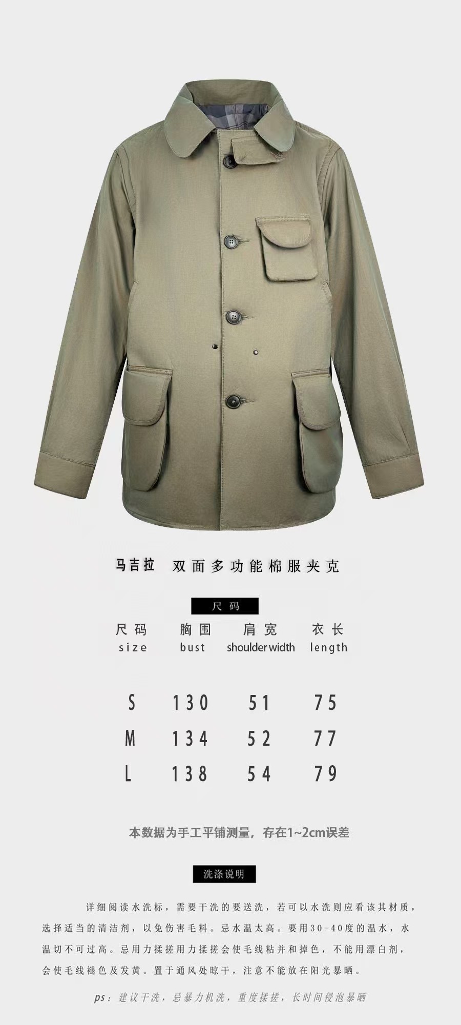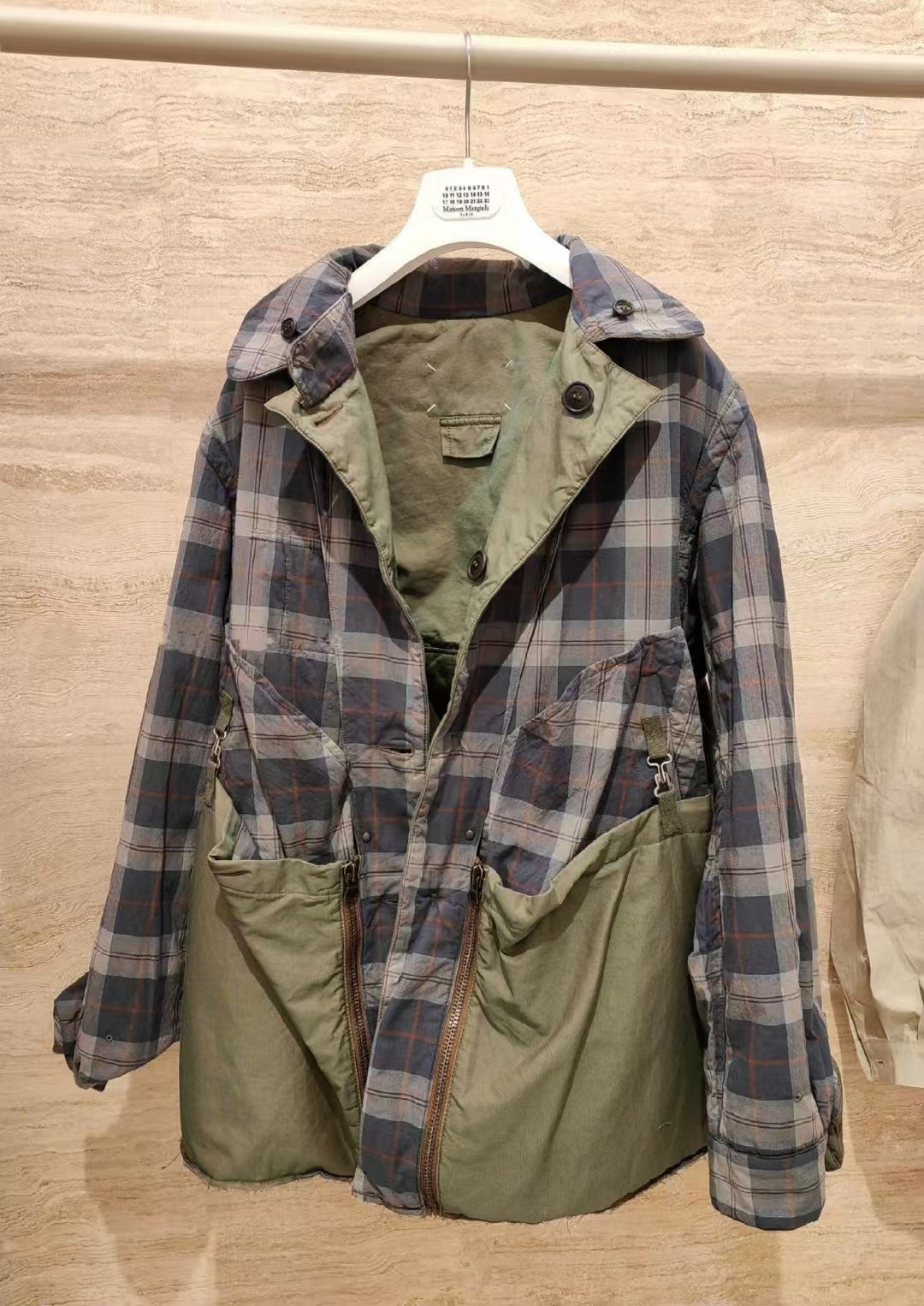 定制80支臻彩高密双色全棉精纺面料以及纯棉精梳格纹内衬绸缎 面料呈现渐变效果 从深绿色由不同角度层次过渡到浅绿色 (单单面料从定制到开发 足足花费90天多天) 肉眼可见得重工 以独特的军绿魅力为基调 以纯色口袋巧妙设计打造 后幅以标志性马吉拉品牌标识彰显品牌风范 加棉设计 给予你全方位的温暖守护 抵御寒冷侵袭 优雅大气 沉稳内敛 温暖与时尚的双重奏 以柔软的姿态成为跨界风尚的时尚先锋