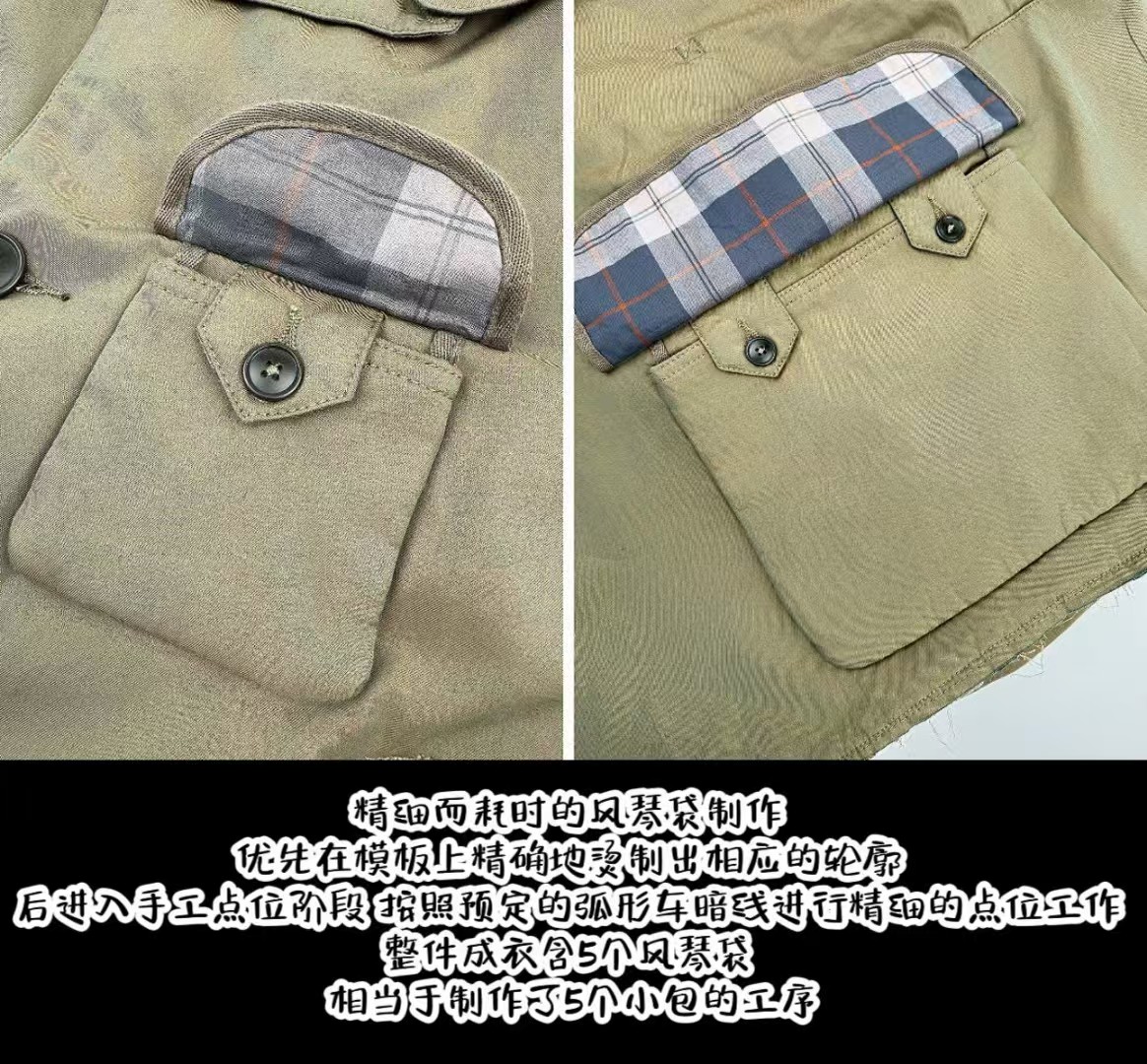 工艺3: 精细而耗时的风琴袋制作 优先在模板上精确地烫制出相应的轮廓 后进入手工点位阶段 按照预定的弧形车暗线进行精细的点位工作 (整件成衣含5个风琴袋 相当于制作了5个小包的工序)