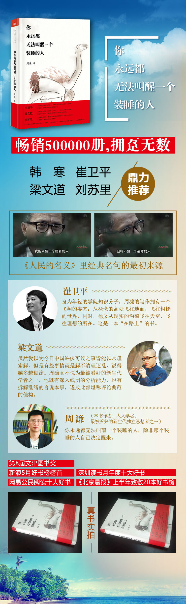 你永远都无法叫醒一个装睡的人,除非那个装睡的人自己决定醒来——周濂第8届文津图书奖 ,畅销500000册。深圳读书月年度十大好书 出版人杂志 凤凰网2012年度图书 城市晚报十大好书 新浪5月好书榜榜首 网易5月公民阅读书单 网易公民阅读十大好书 凤凰读书第19周好书榜 《北京晨报》上半年致敬20本好书榜 《新京报》夏季选书榜 蓝狮子图书7月好书推荐榜 北京万圣书园5月及6月销售排行榜榜首 上海季风书园5月及6月畅销榜 深圳书城6月推荐TOP 10