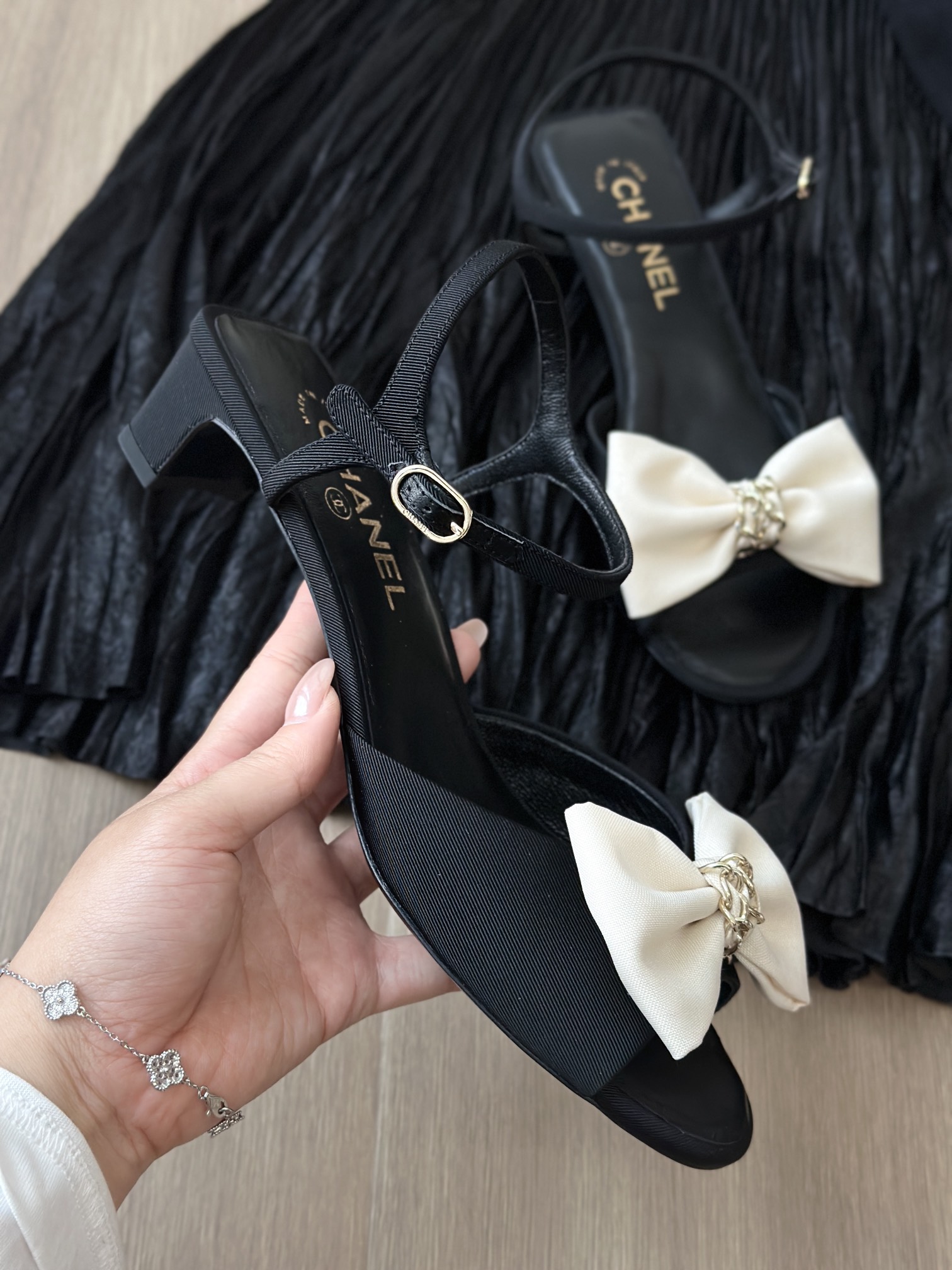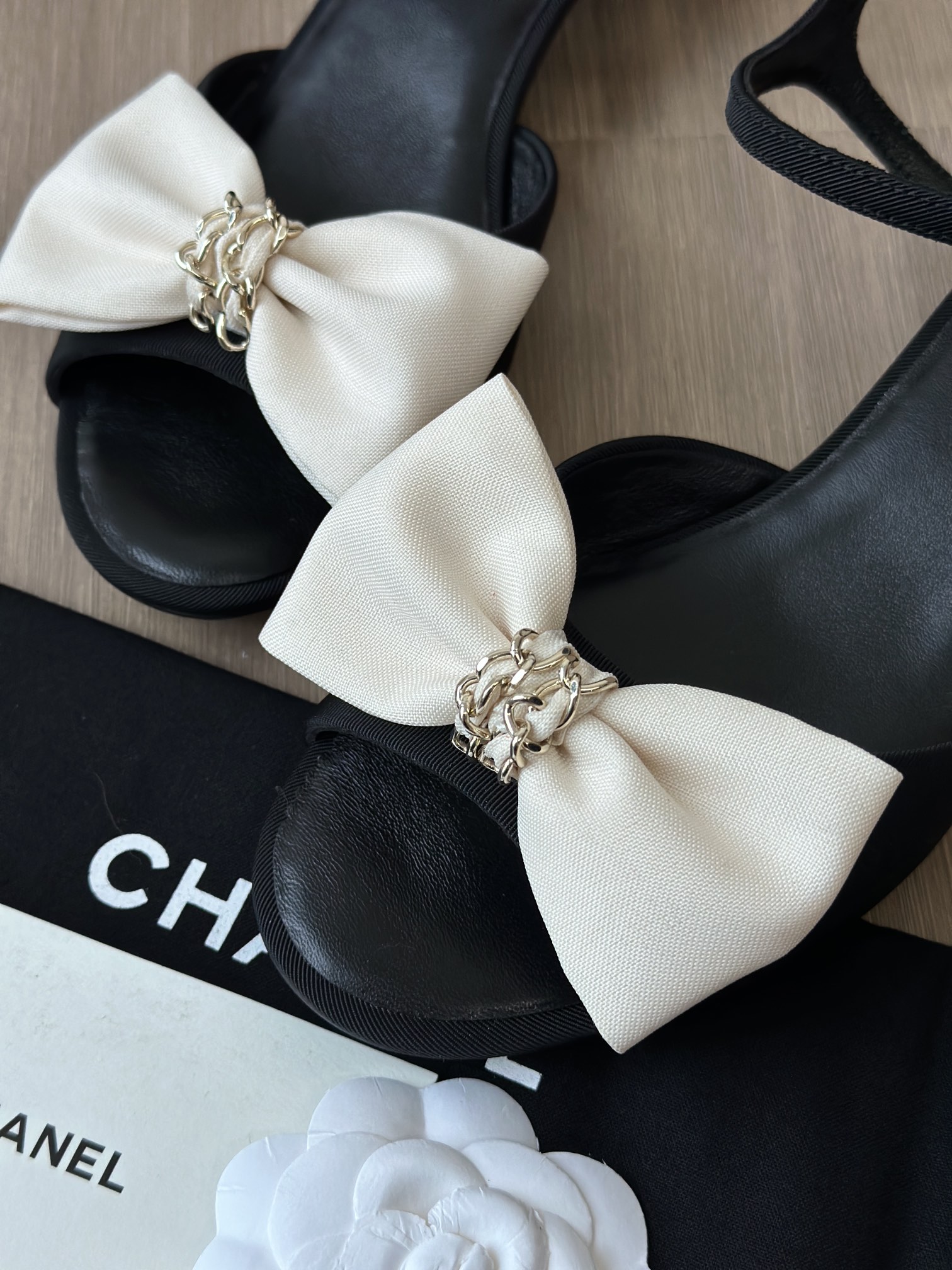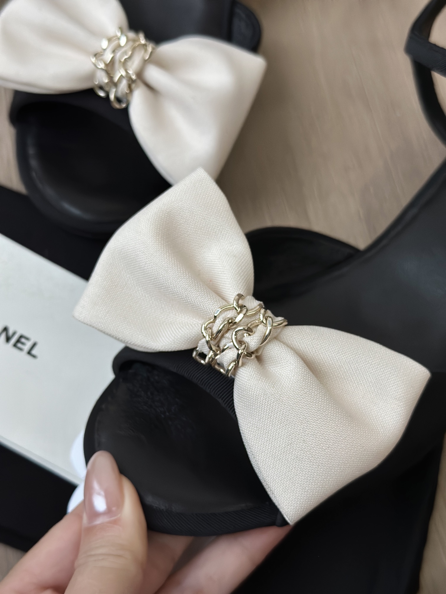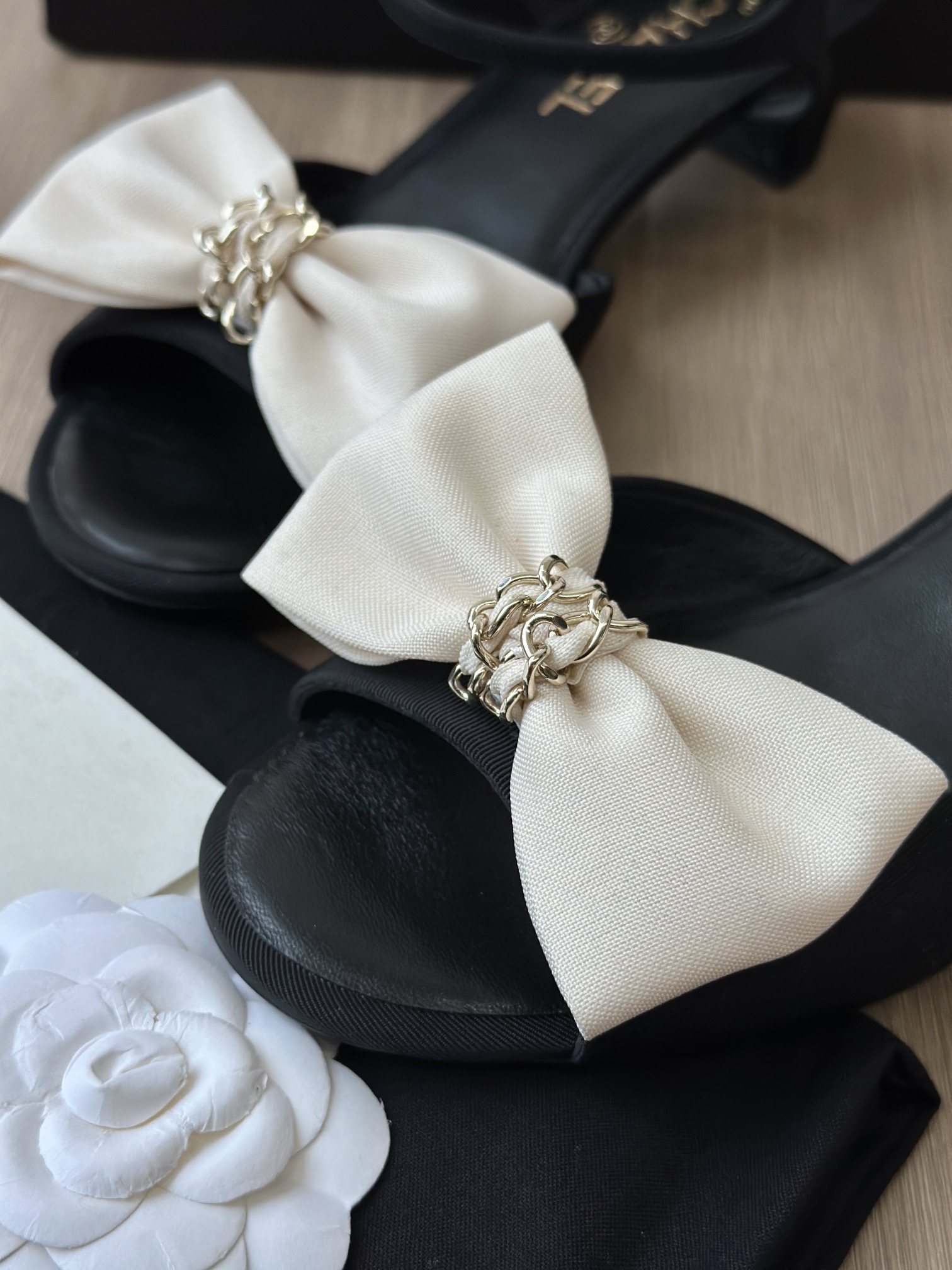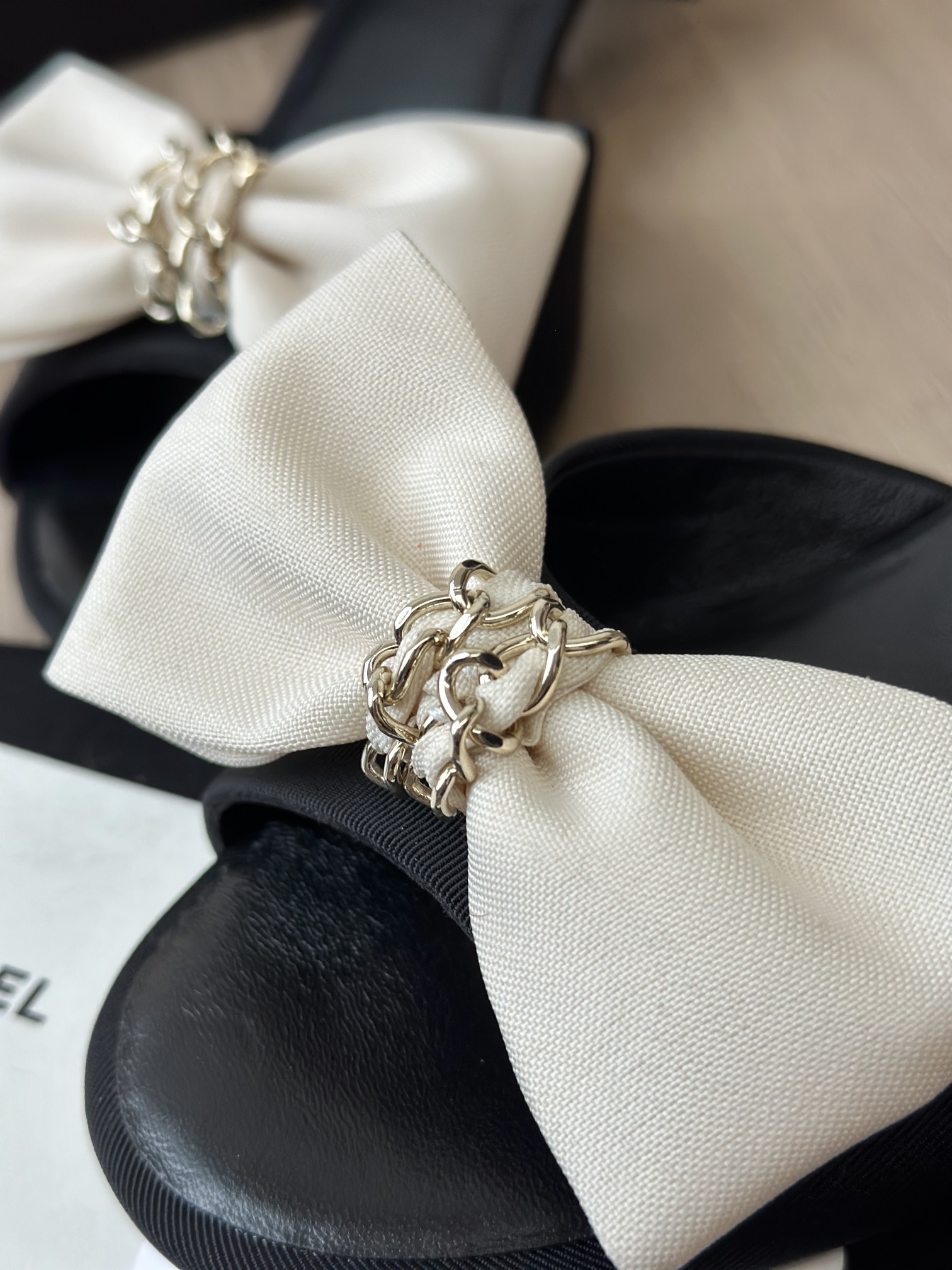 鞋面中央是立体的米白色缎面蝴蝶结,中心点缀金色链条装饰,甜美中带点复古高级感,是25K系列标志性设计之一