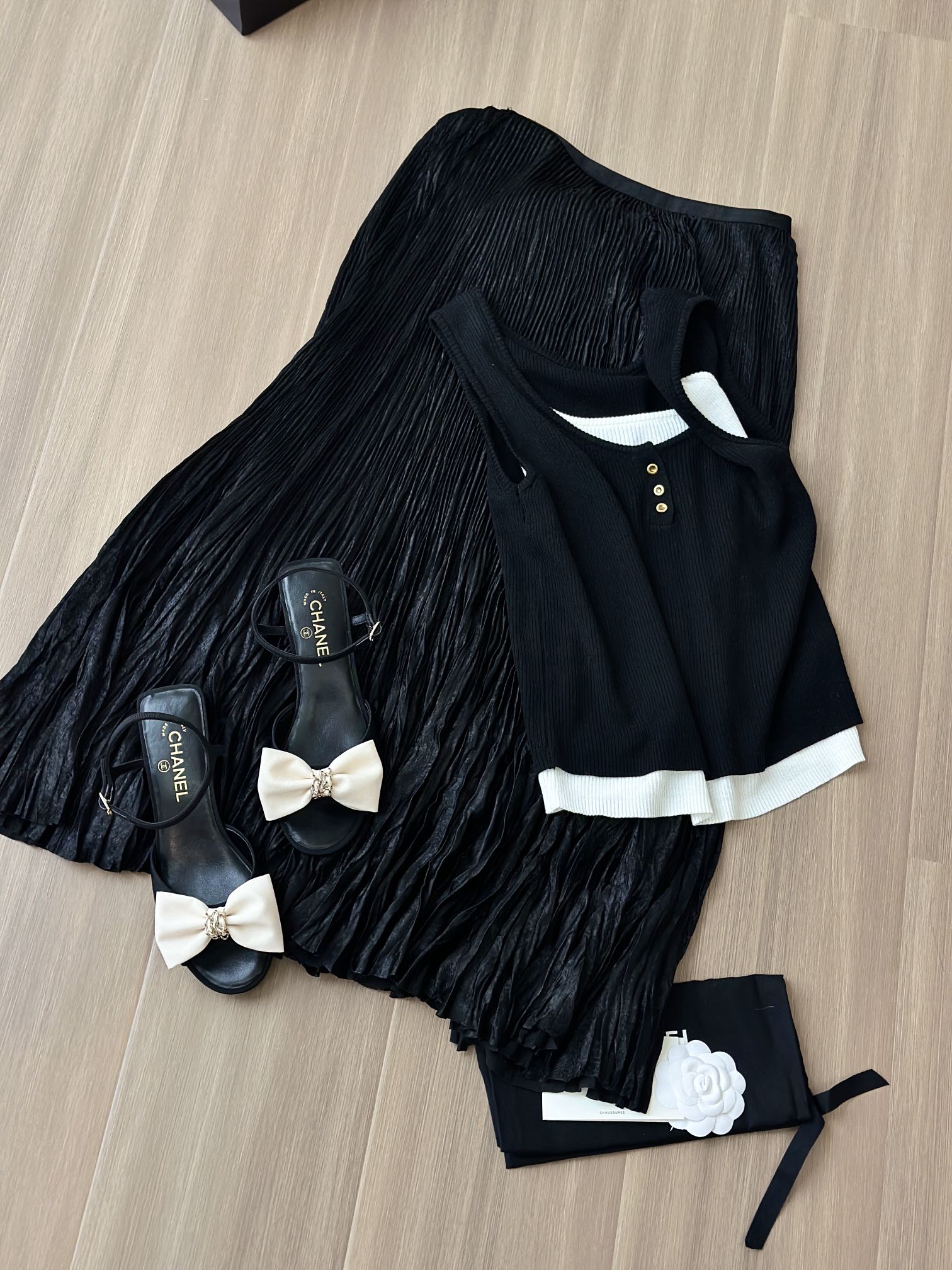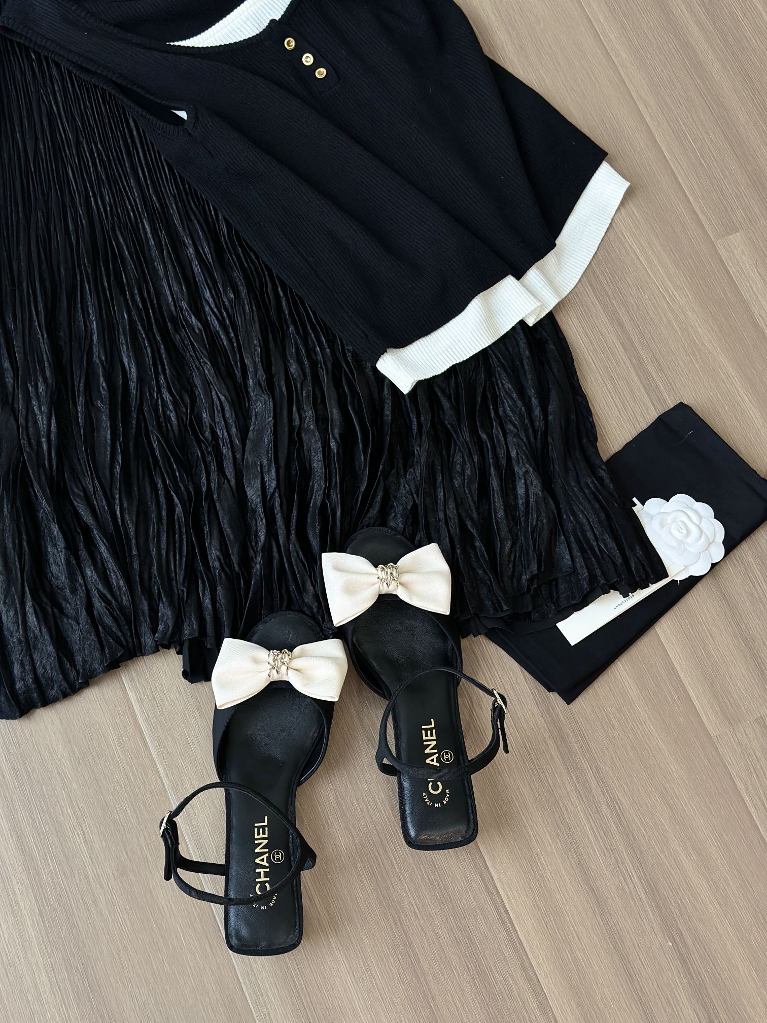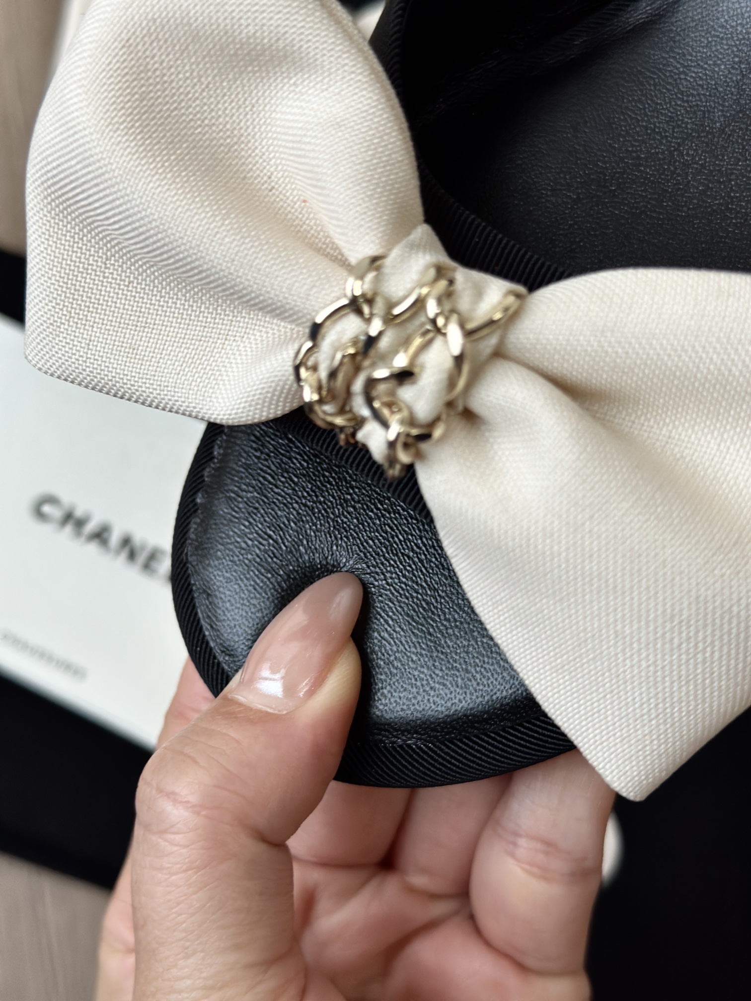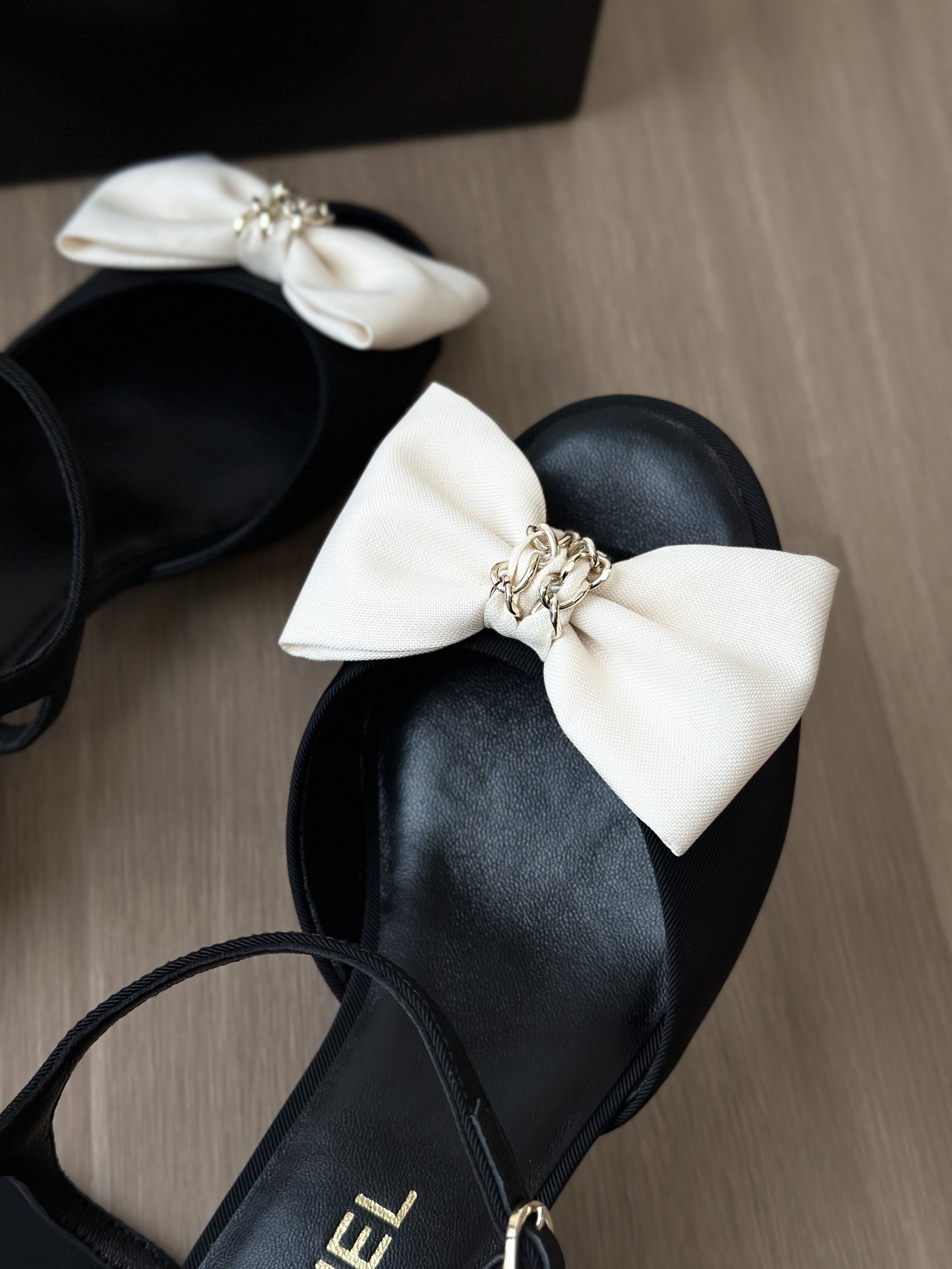 25K系列的黑色圆头低跟凉鞋,搭配米白色缎面大蝴蝶结装饰,设计精致且极具辨识度。 经典蝴蝶结元素:鞋面中央是立体的米白色缎面蝴蝶结,中心点缀金色链条装饰,甜美中带点复古高级感,是25K系列标志性设计之一。