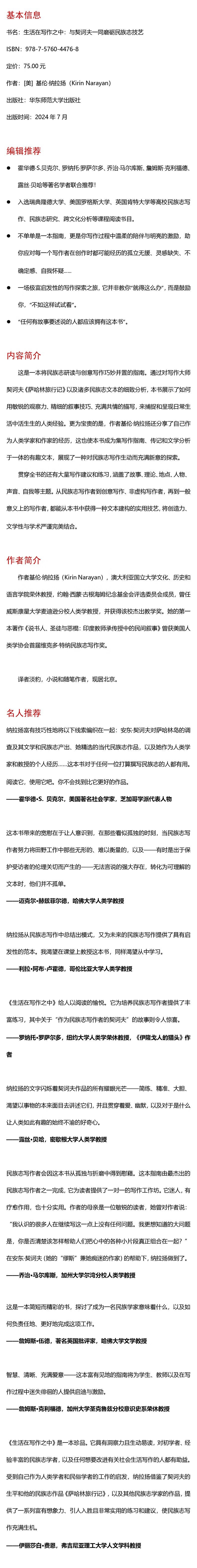 作家兼人类学家基伦·纳拉扬(Kirin Narayan)将民族志研究与文学写作巧妙地并置,通过对契诃夫的《萨哈林旅行记》以及多个民族志文本的细致分析,展示了如何用敏锐的观察力、精细的叙事技巧、充满共情的描写来捕捉和呈现人类生活经验。提供了有关故事,理论,地点,人物,声音和自我等主题的实践练习和建议,展现了一种生动的民族志写作的探索。适用于创意写作专业的非虚构写作学习。其中,纳拉扬也分享了自己作为人类学家和作家的经历,以及契诃夫的作品如何影响了她的写作方法,使本书成为集写作指南、传记和文学分析于一体的有趣书籍。