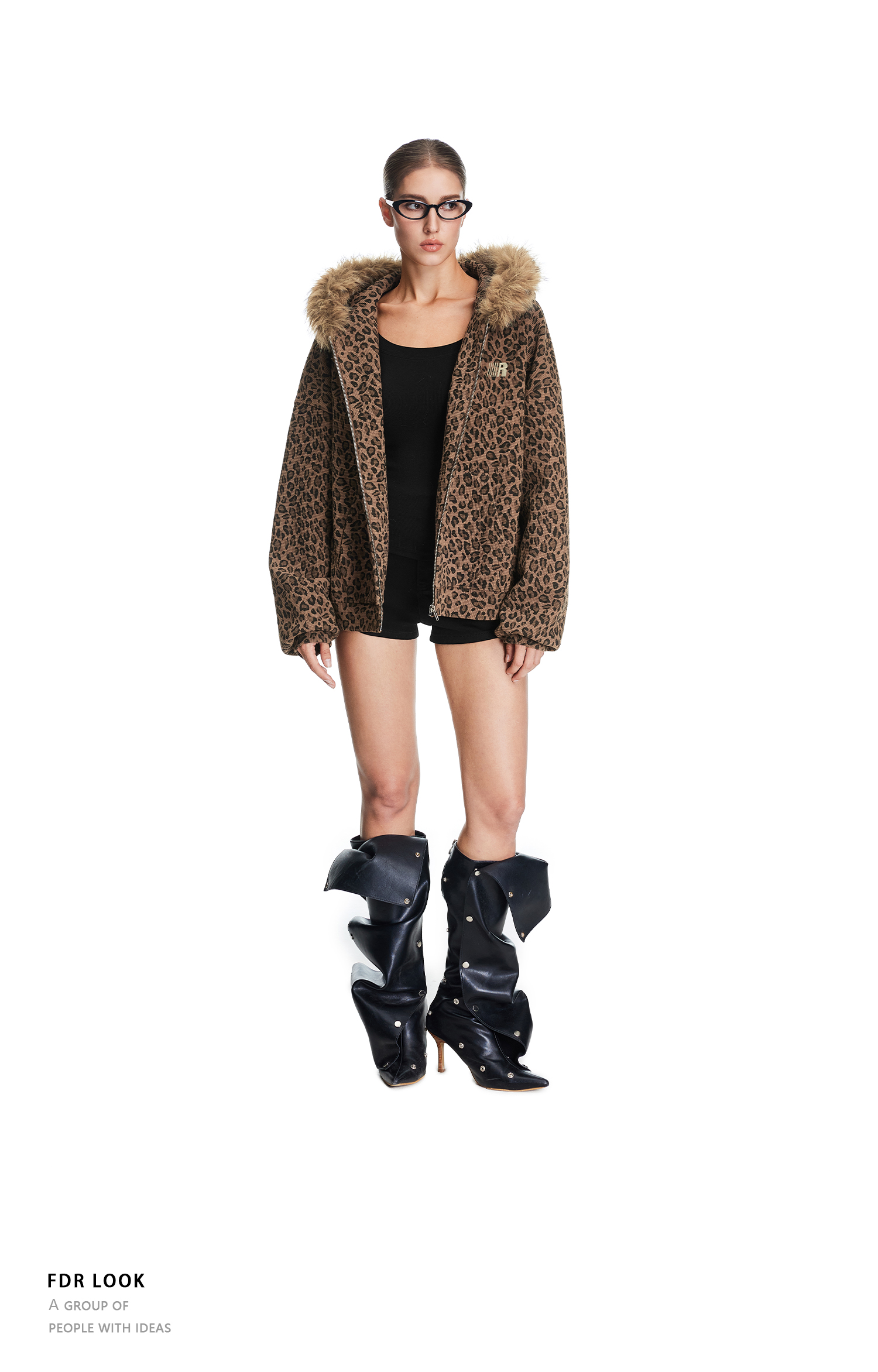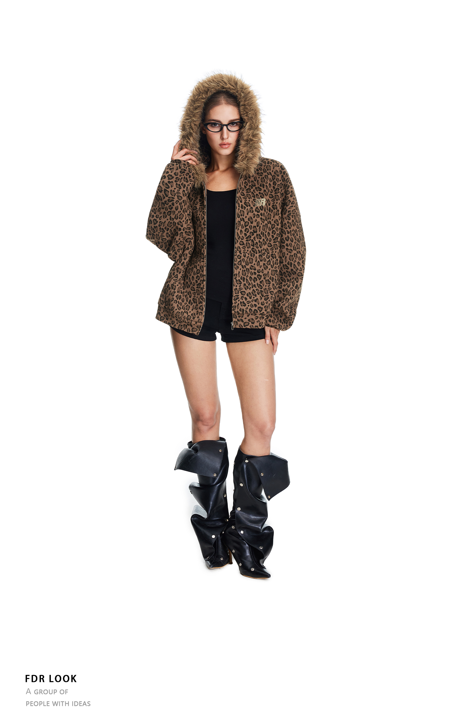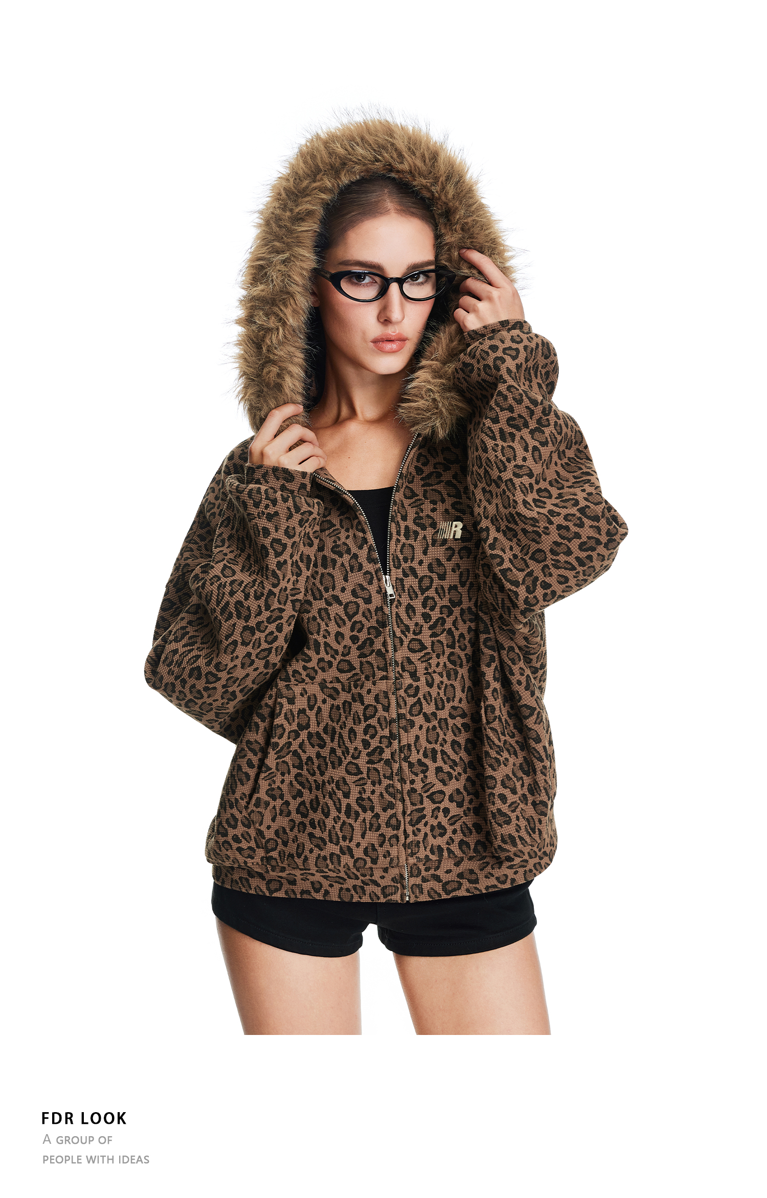 FDR官方店 辣妹豹纹毛领连帽卫衣外套男女秋冬保暖情侣开衫上衣