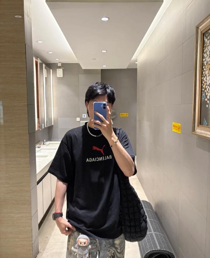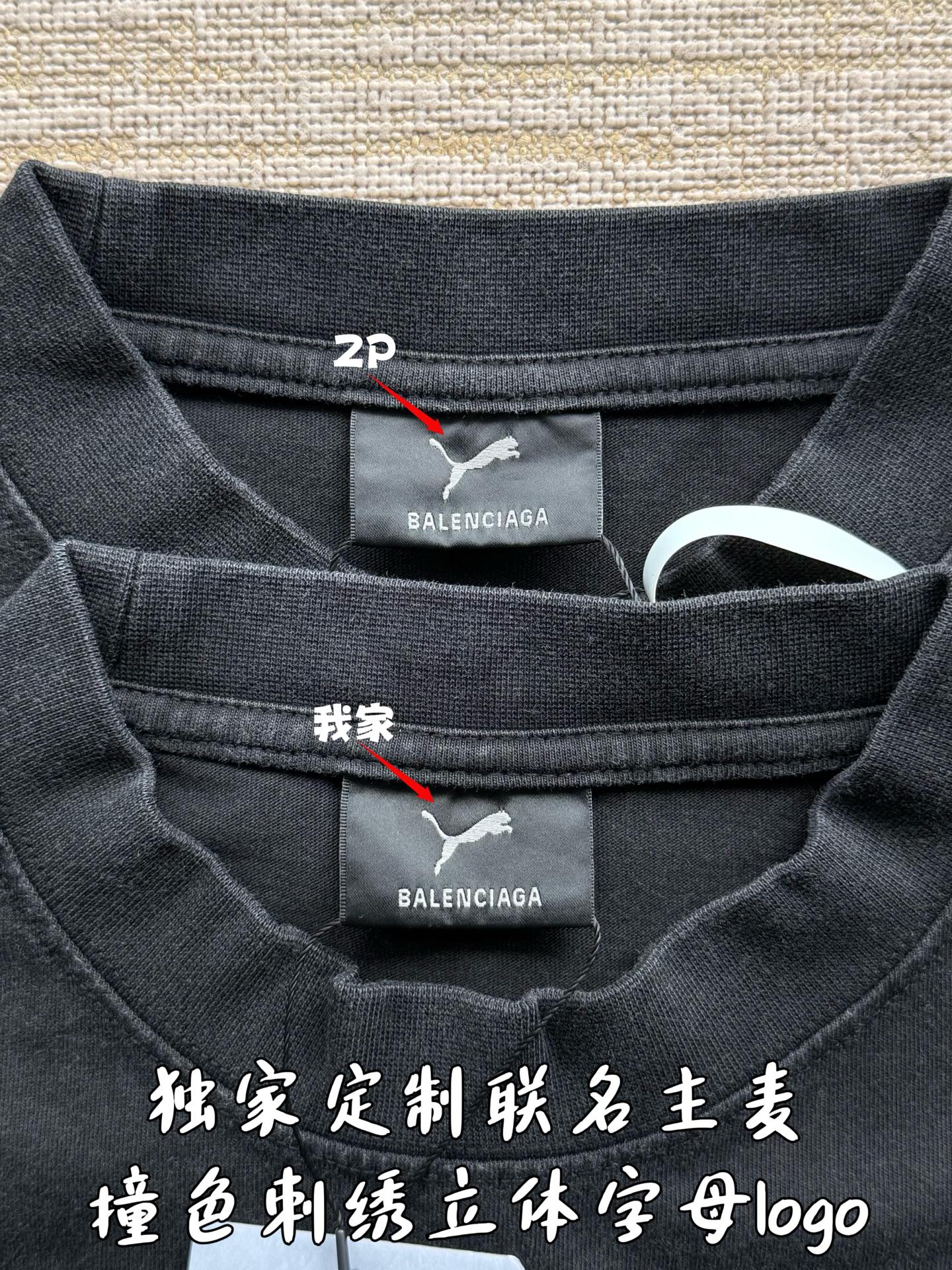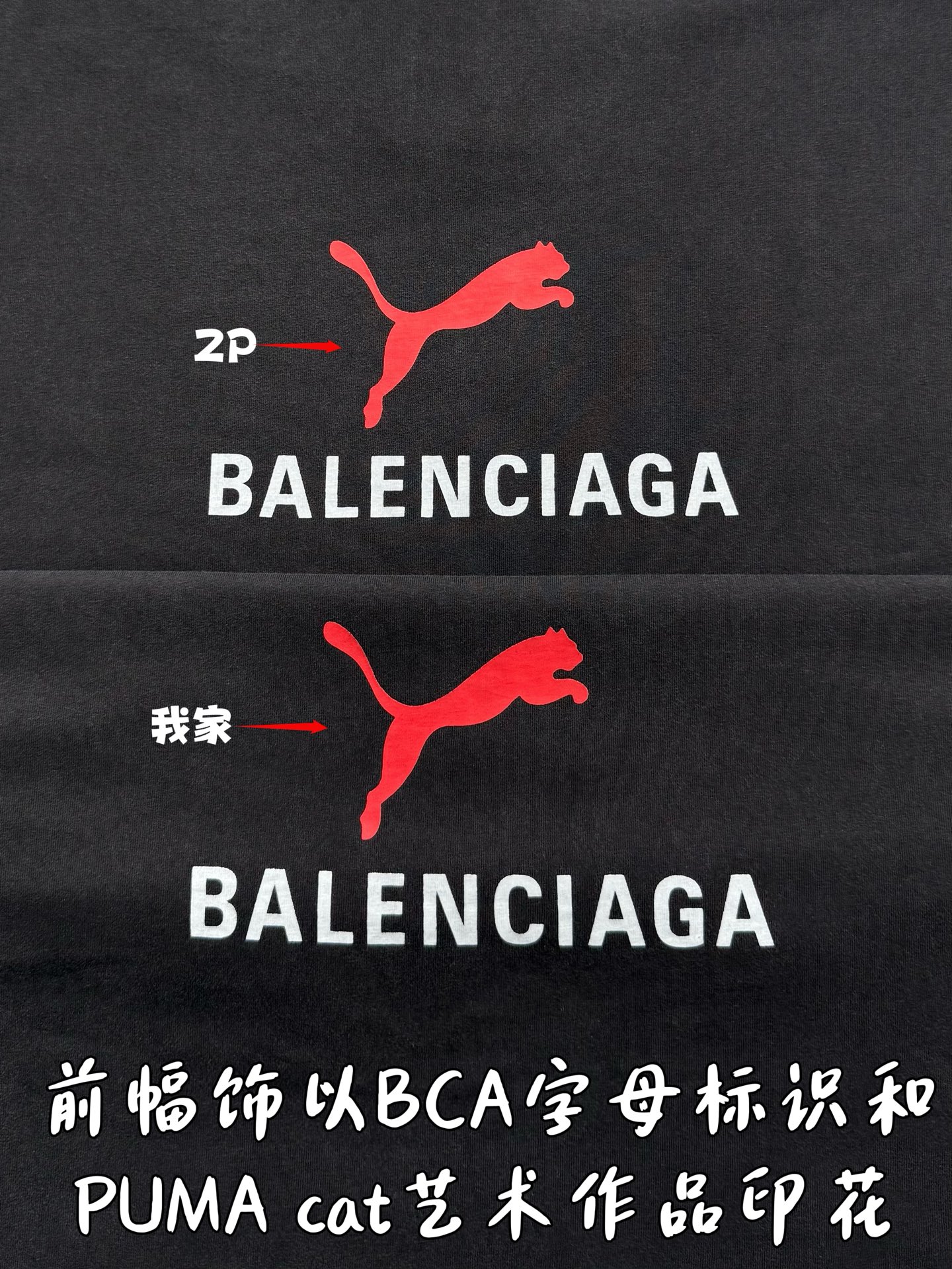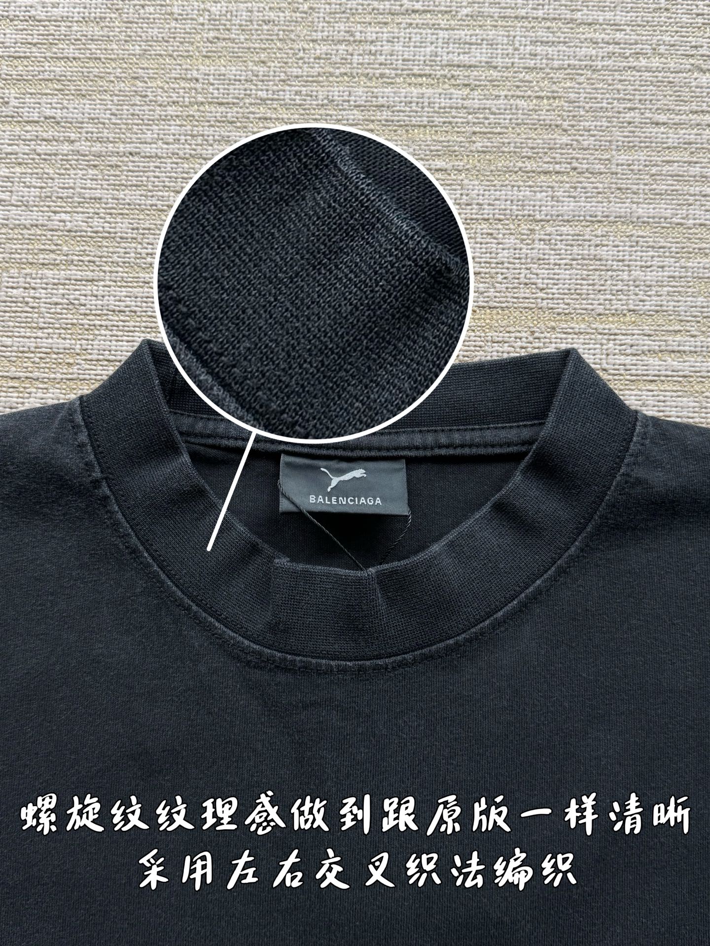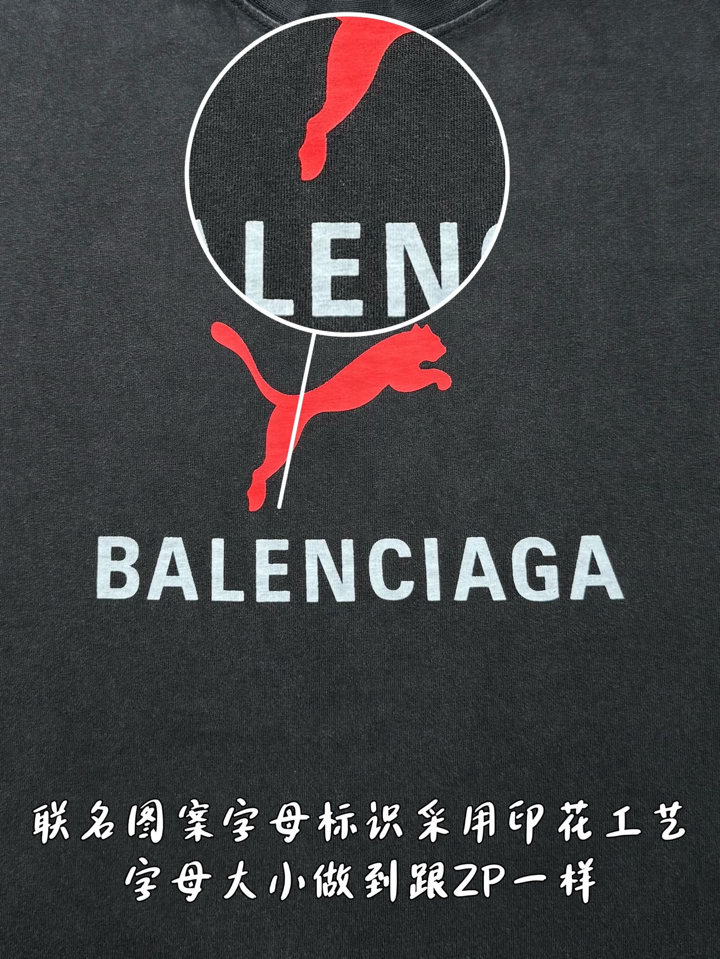 整件衣服5500购买ZP拆解打造,定制水洗黑色做旧平纹针织面料,做到100%全棉进口纱线,前幅饰以Blalenciaga字母标识和PUMA cat艺术作品印花,定制同色系领口 袖口 下摆,双层锁边超高密度走线,真正做到1:1copy 闭眼入