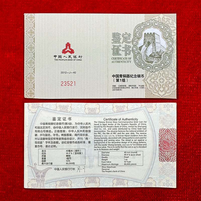 龙头!2012年青铜器(第一组)银币 商·弦纹盉一盎司封装带盒