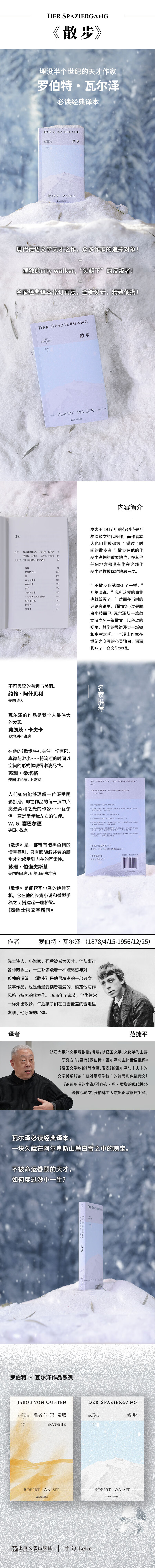 罗伯特·瓦尔泽(1878.4.15-1956.12.25),瑞士诗人、小说家,死后被誉为天才。他从事过各种卑微的职业——管家、职员、图书管理员助理和书商,他的一生弥漫着一种疏离感与对孤独的渴望。《散步》是他最精彩的一部散文叙事作品,也是他最受读者喜爱的、确定他写作风格与特色的代表作。他于1905年搬到柏林,1913年回到贝尔后继续写作,1929年住进伯尔尼的瓦尔道精神病院。1933年,他被转移到黑里绍的另一家精神病院,彻底停止写作。1956年圣诞节,他像往常一样外出散步,午后孩子们在白雪覆盖的雪地里发现了他冰冻的尸体。