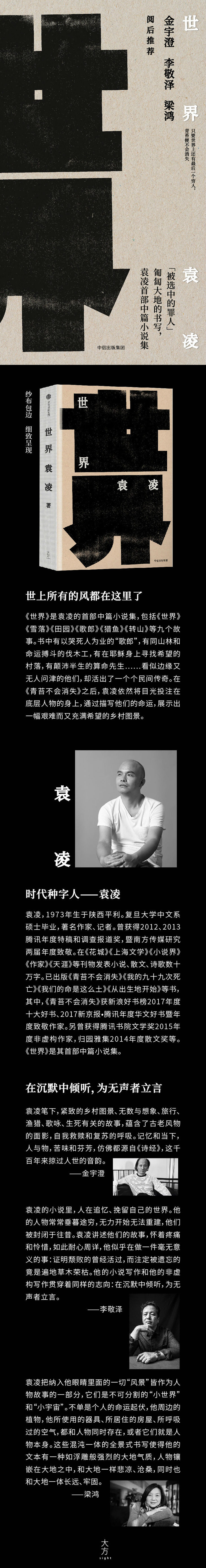 袁凌,1973年生于陕西平利。复旦大学中文系硕士毕业,著名作家、记者。曾获得2012、2013腾讯年度特稿和调查报道奖,暨南方传媒研究两届年度致敬。在《花城》《上海文学》《小说界》《作家》《天涯》等刊物发表小说、散文、诗歌数十万字。已出版《青苔不会消失》《我的九十九次死亡》《我们的命是这么土》《从出生地开始》等书,其中,《青苔不会消失》获新浪好书榜2017年度十大好书、2017新京报·腾讯年度华文好书暨年度致敬作家。另曾获得腾讯书院文学奖2015年度非虚构作家,归园雅集2014年度散文奖等。《世界》是其首部中篇小说集。