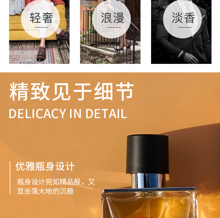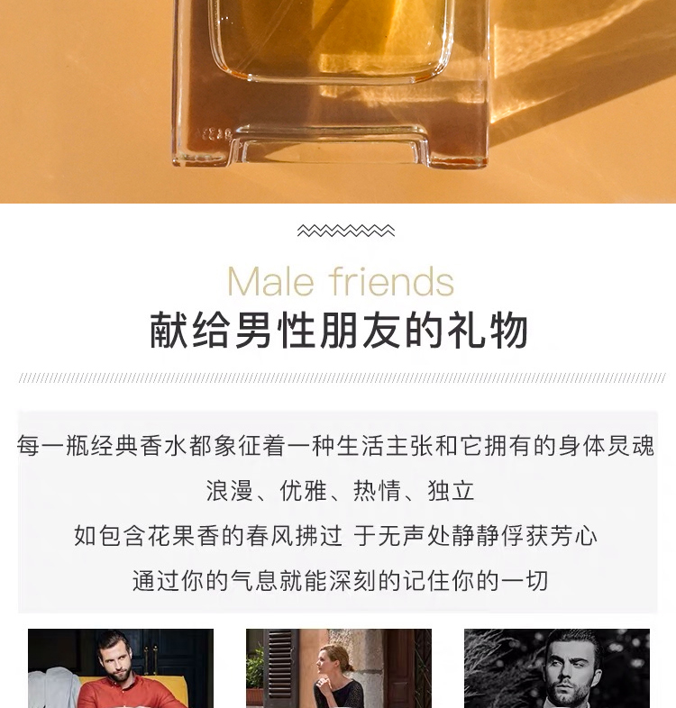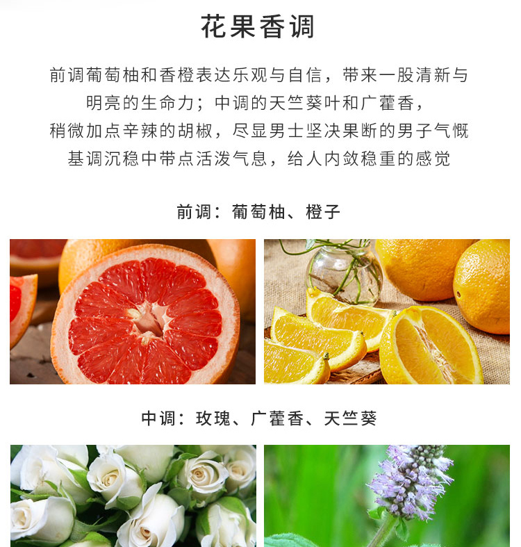 前调:葡萄柚、橙中调:玫瑰、广藿香、天竺葵后调:香根、甜椒、安息香、西洋杉他名作大地,叫人心生暖意与安定。初见倾情,外形方正质感厚重,瓶口是旋转上升的设计,简单又少许特别。一出来就是清新柑橘调,仿佛是具有生命的味道,能牢牢抓住你的发肤衣物,随着体温慢慢发酵,缓缓安静下来,沉睡在你身上,给你力量。