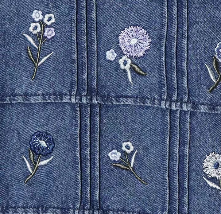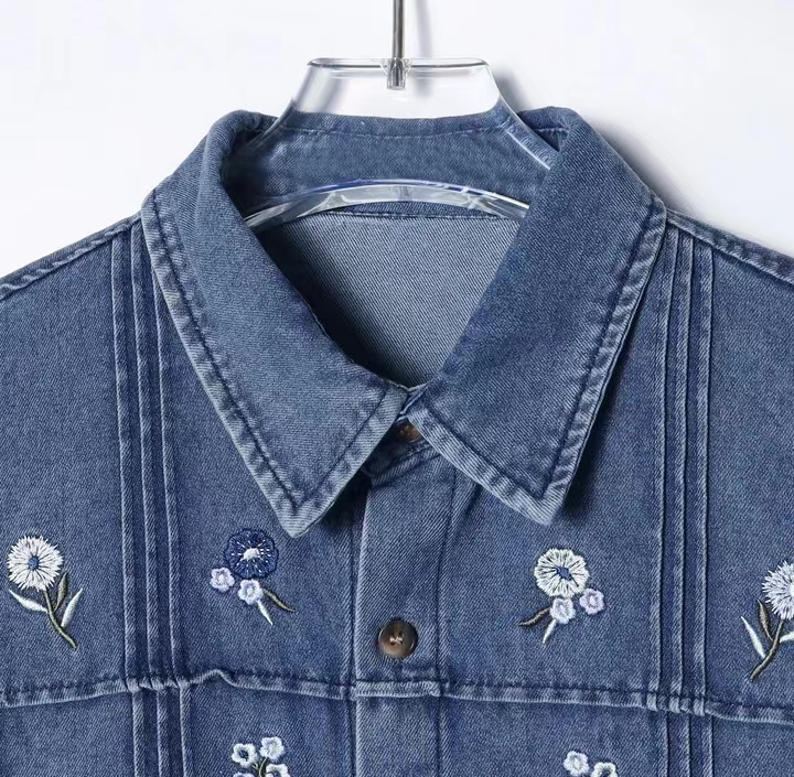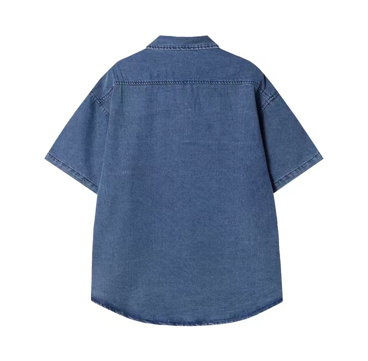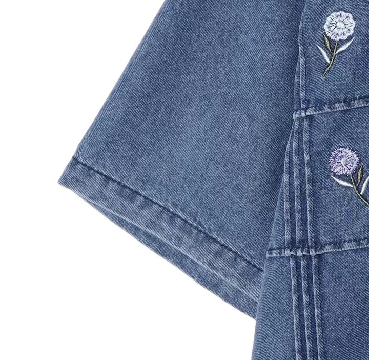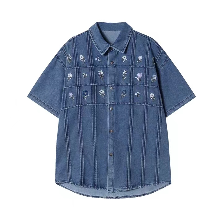 夏季新款牛仔男士衬衫百搭小小花朵刺绣上衣潮流宽松休闲短袖