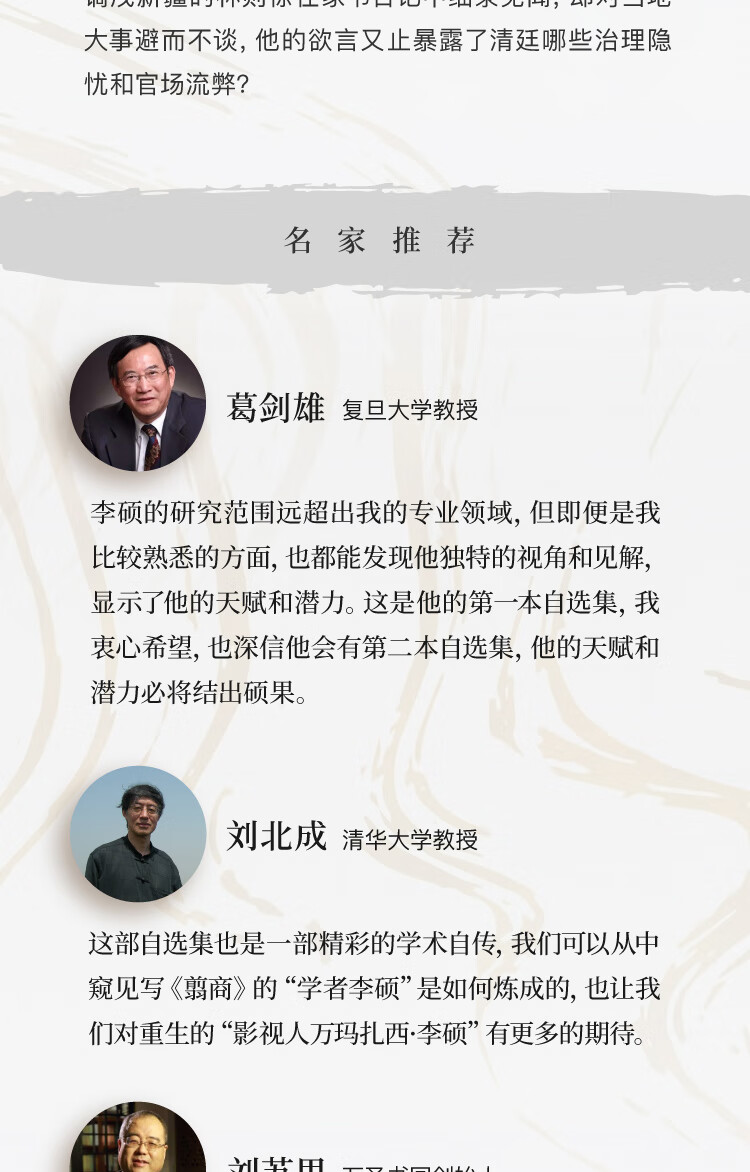 李硕的研究范围远超出我的专业领域,但即便是我比较熟悉的方面,也都能发现他独特的视角和见解,显示了他的天赋和潜力。这是他的第一本自选集,我衷心希望,也深信他会有第二本自选集,他的天赋和潜力必将结出硕果。——葛剑雄