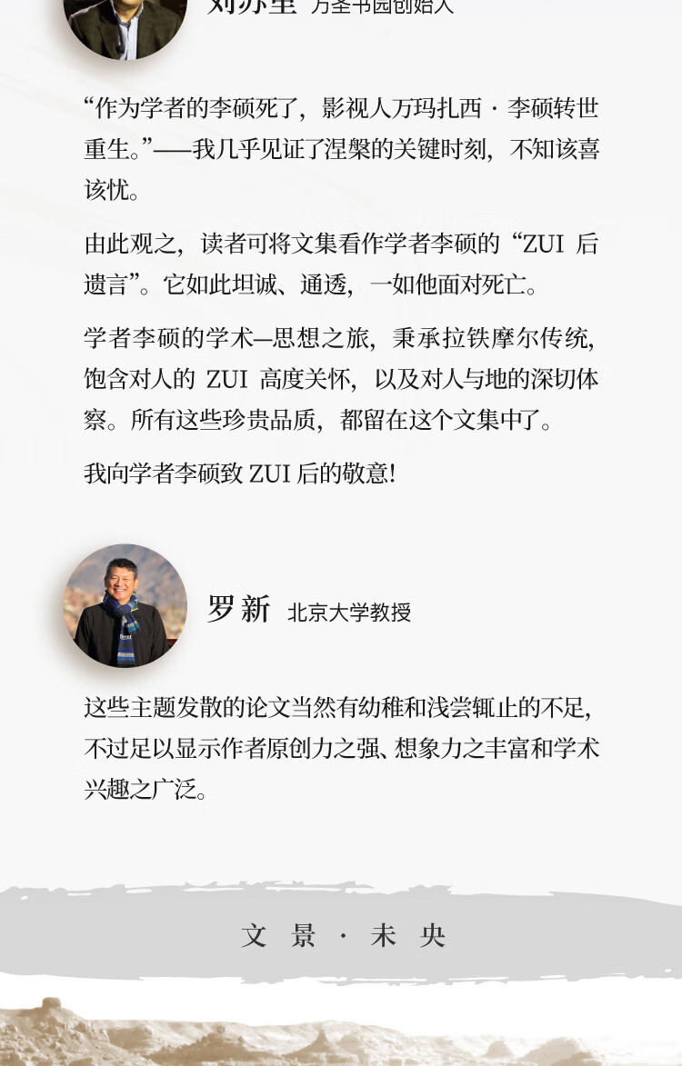 “作为学者的李硕死了,影视人万玛扎西•李硕转世重生。”——我几乎见证了涅槃的关键时刻,不知该喜该忧。由此观之,读者可将文集看作学者李硕的“最后遗言”。它如此坦诚、通透,一如他面对死亡。学者李硕的学术—思想之旅,秉承拉铁摩尔传统,饱含对人的最高度关怀,以及对人与地的深切体察。所有这些珍贵品质,都留在这个文集中了。我向学者李硕致最后的敬意!——刘苏里