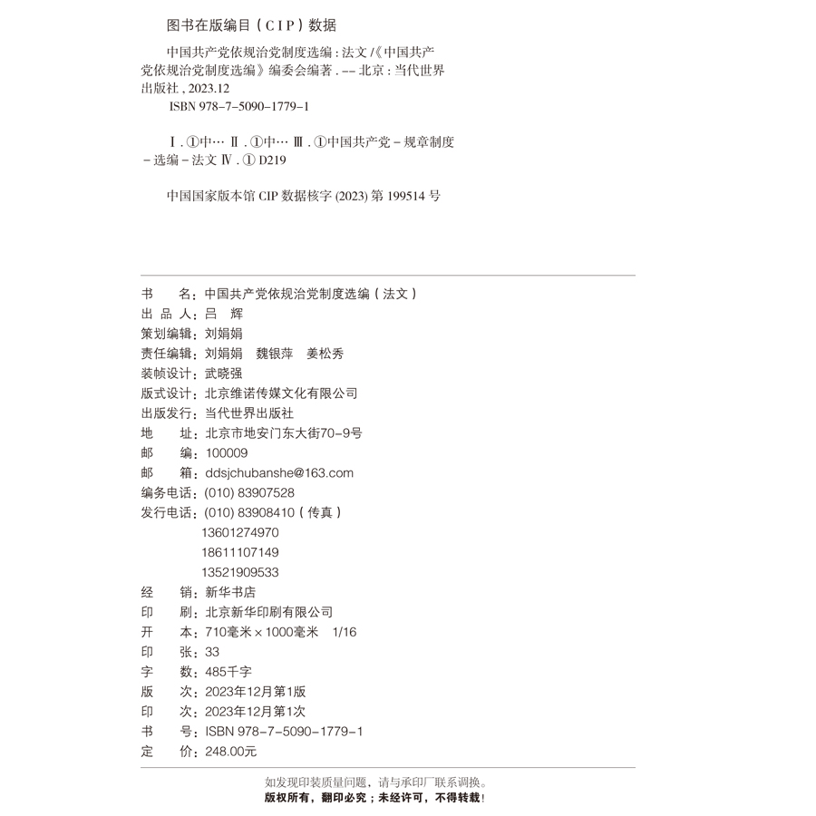 《中国共产党依规治党制度选编》(法文)属于《中国共产党依规治党制度选编》外文版系列,该套书摘录了习近平总书记关于依规治党的部分重要论述,选取了中共十八大之后制定、修订并颁布施行的23部重要党内法规制度,内容包括《中国共产党章程》,以及党的组织、领导、自身建设、监督保障等五个方面法规制度,全面系统介绍了中国共产党以党章为根本、若干配套党内法规为支撑的党内法规制度体系。