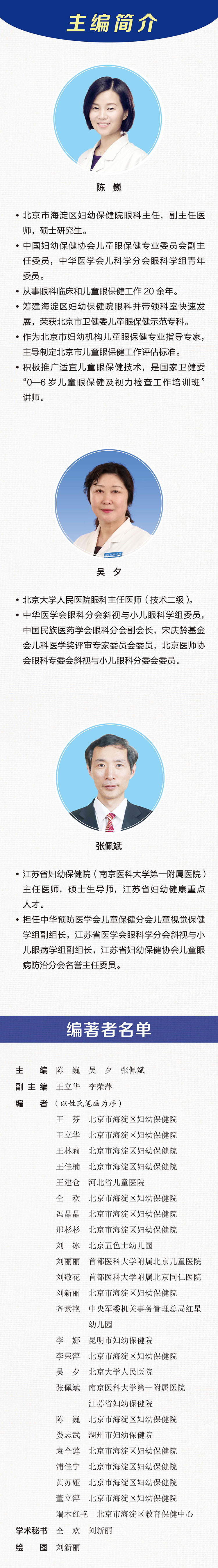 陈巍 ·北京市海淀区妇幼保健院眼科主任,副主任医师,硕士研究生。 ·中国妇幼保健协会儿童眼保健专业委员会副主任委员,中华医学会儿科学分会眼科学组青年员。 ·从事眼科临床和儿童眼保健工作20余年。 ·筹建海淀区妇幼保健院眼科并带领科室快速发展,荣获北京市卫健委儿童眼保健示范专科。 ·作为北京市妇幼机构儿童眼保健专业指导专家,主导制定北京市儿童眼保健工作评估标准。 ·积极推广适宜儿童眼保健技术,是国家卫健委“0—6岁儿童眼保健及视力检查工作培训班”讲师。 吴夕 ·北京大学人民医院眼科主任医师(技术二级)。 ·中华医学会眼科分会斜视与小儿眼科学组委员,中国民族医药学会眼科分会副会长,宋庆龄基金会儿科医学奖评审专家委员会委员,北京医师协会眼科专委会斜视与小儿眼科分委会委员。 张佩斌 ·江苏省妇幼保健院(南京医科大学第一附属医院)主任医师,硕士生导师,江苏省妇幼健康重点人才。 ·担任中华预防医学会儿童保健分会儿童视觉保健学组副组长,江苏省医学会眼科学分会斜视与小儿眼病学组副组长,江苏省妇幼保健协会儿童眼病防治分会名誉主任委员。