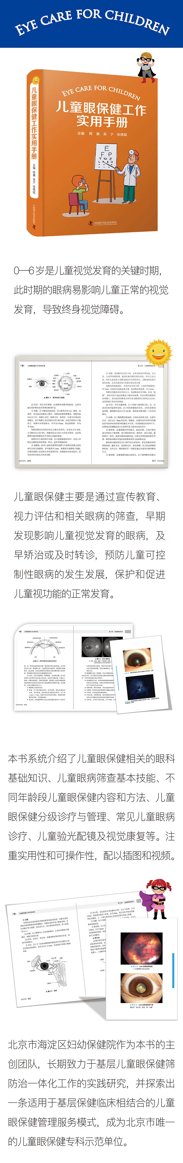本书编者根据自身多年工作实践经验,结合国家卫生健康委员会对儿童眼保健工作的相关要求,对儿童眼保健的内容及方法进行了细致的介绍。全书分 9 章,系统阐述了儿童眼保健工作的基本理论和相关知识。开篇先详细介绍了眼病筛查技术、不同年龄儿童眼保健内容和不同医疗保健机构分级诊疗及管理,方便各级眼保健工作者参照开展工作及对眼保健工作进行管理。接下来简要介绍了眼保健工作所需的眼科基础知识及常见眼病的诊疗原则,方便眼保健工作者和小儿眼科医生掌握基本理论,提高眼保健工作质量,然后详细讲解了儿童验光配镜和视觉训练,为开展这两项工作的眼保健专科提供参考。此外,书中还专门介绍了儿童眼保健的健康教育内容和方法。本书内容系统,语言通俗,图片丰富,可为各级医疗保健机构儿童眼保健和小儿眼科医生日常工作提供借鉴参考,也可供儿童保健医生、幼儿园保健医生和儿童家长阅读。