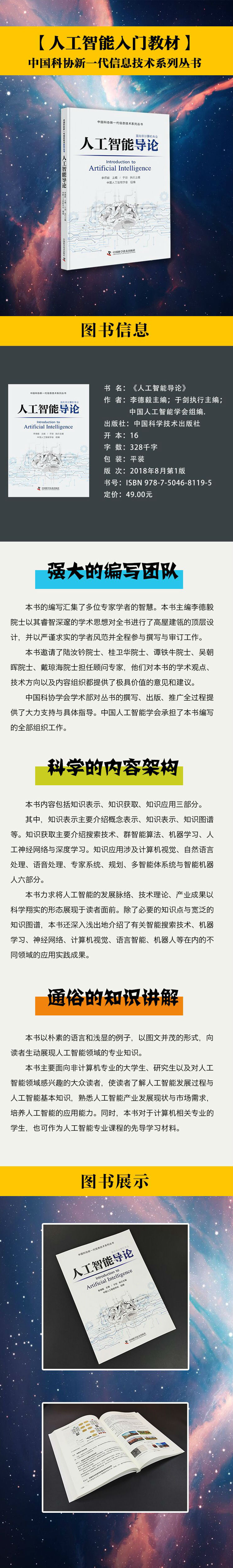 本书是中国科协新一代信息技术系列丛书之一。 本书内容包括知识表示、知识获取、知识应用三部分。其中,知识表示主要介绍概念表示、知识表示、知识图谱;知识获取主要介绍搜索技术、群智能算法、机器学习、人工神经网络与深度学习;知识应用涉及计算机视觉、自然语言处理、语音处理、专家系统、规划、多智能体系统与智能机器人六部分。力求将人工智能的发展脉络、技术理论、产业成果以翔实的形态展现于人前。除了必要的知识点与宽泛的知识图谱,本书还深入浅出地介绍了有关智能搜索技术、机器学习、神经网络、计算机视觉、语言智能、机器人等在内的不同领域的应用实践成果。 本书主要面向大学非计算机类的工科专业的高年级学生与研究生,帮助学生了解人工智能的发展过程与基本知识,熟悉人工智能产业的发展现状与市场需求,培养人工智能应用能力。同时,对于计算机相关专业的学生,本书也可作为人工智能专业课程的先导学习材料。