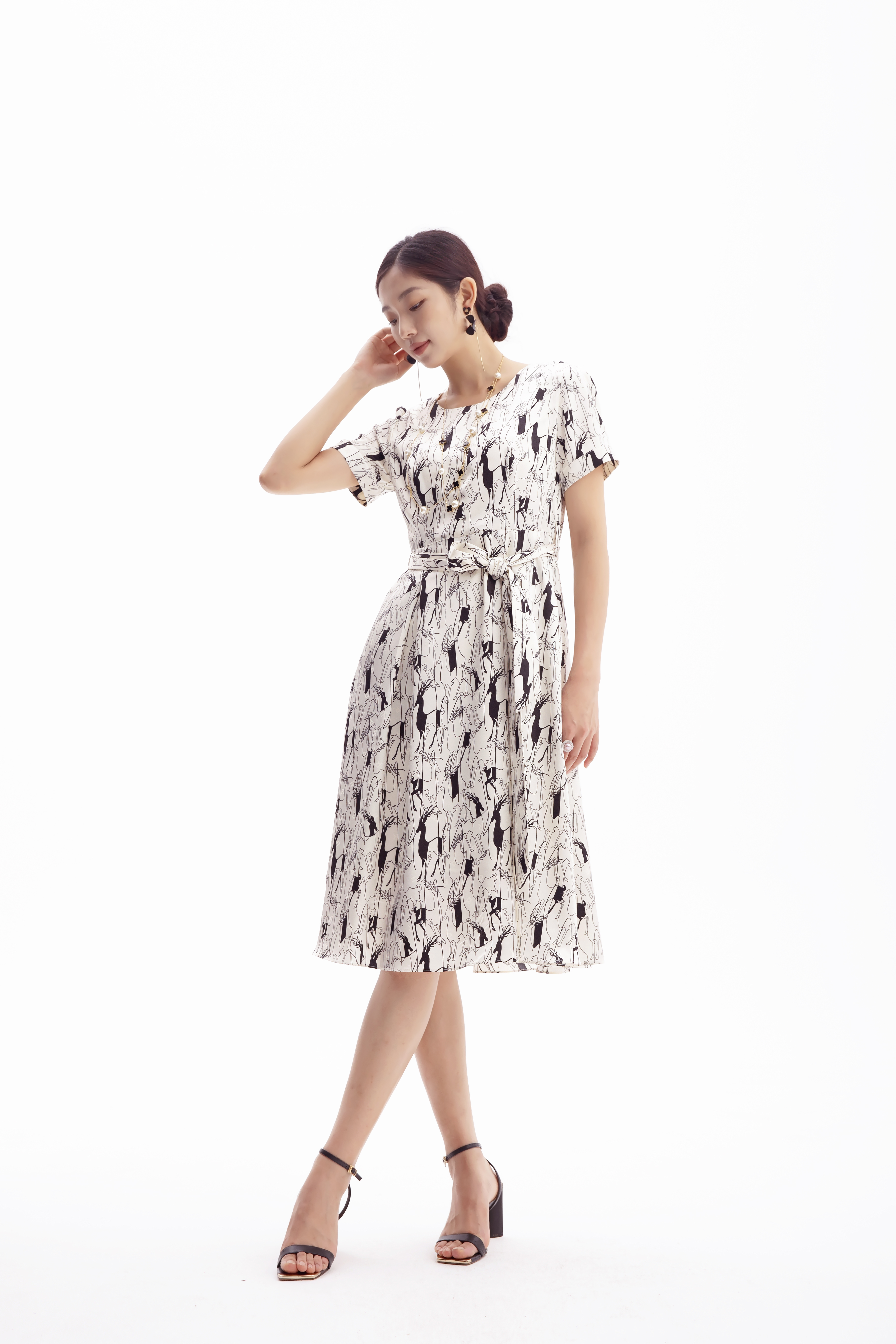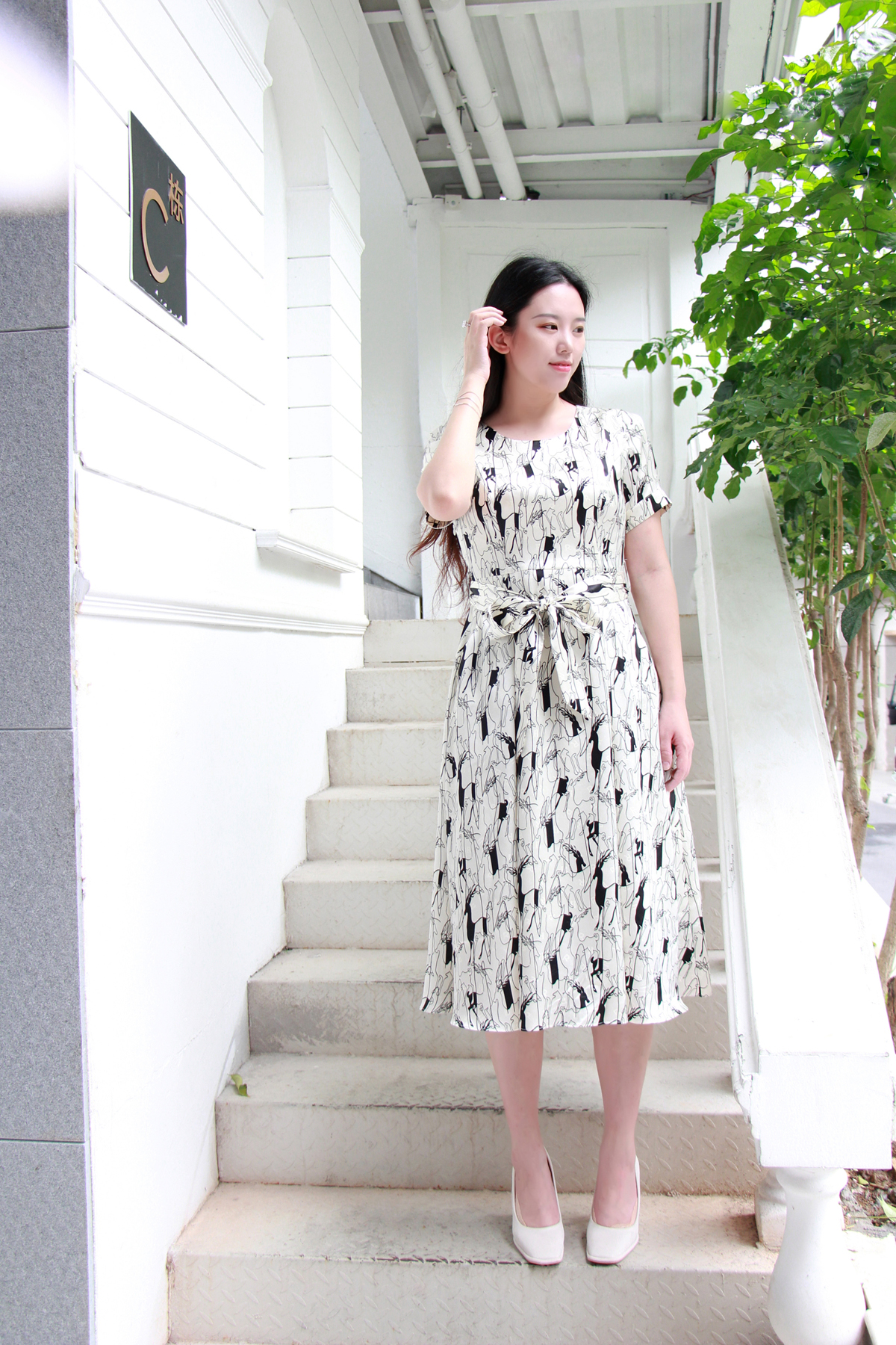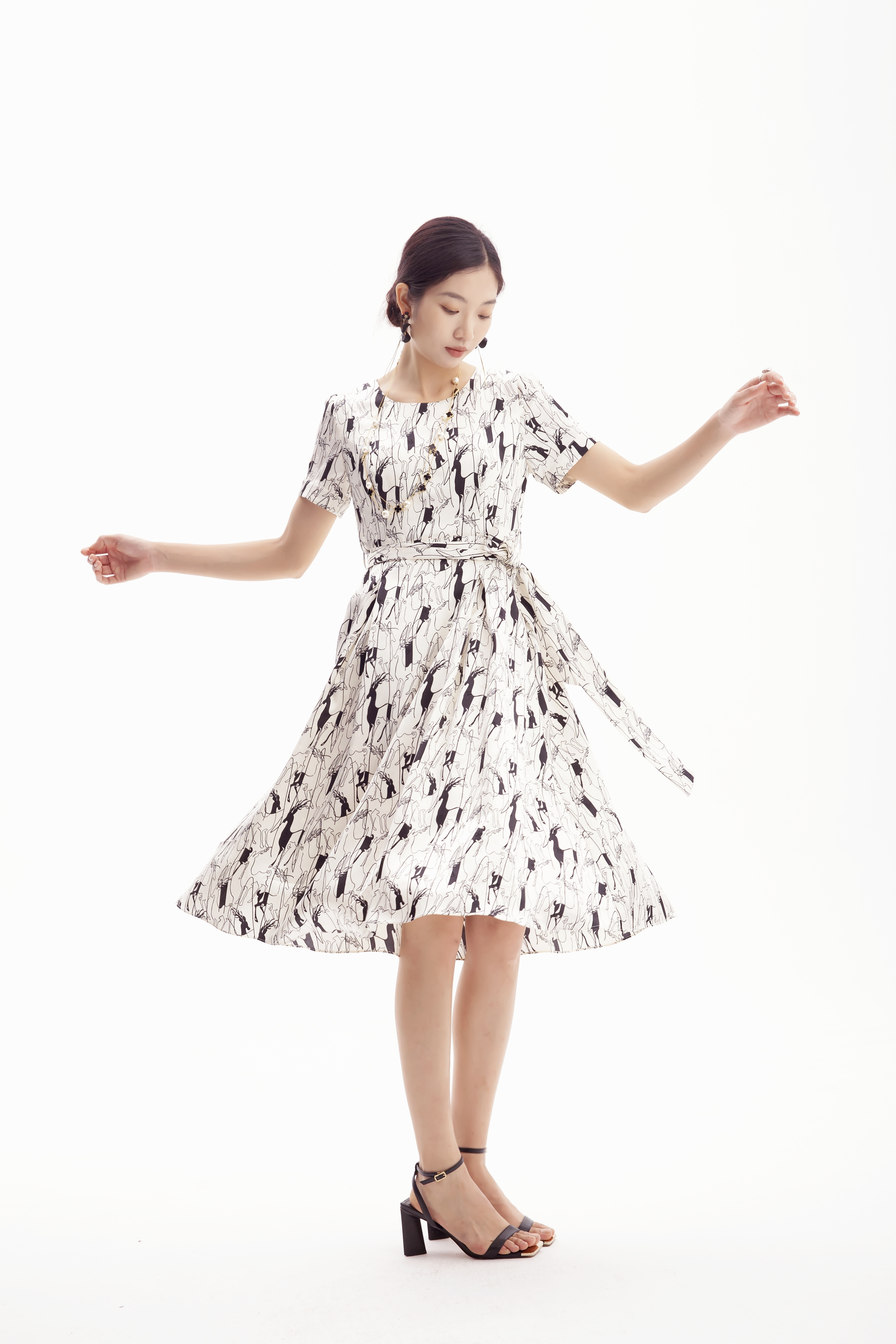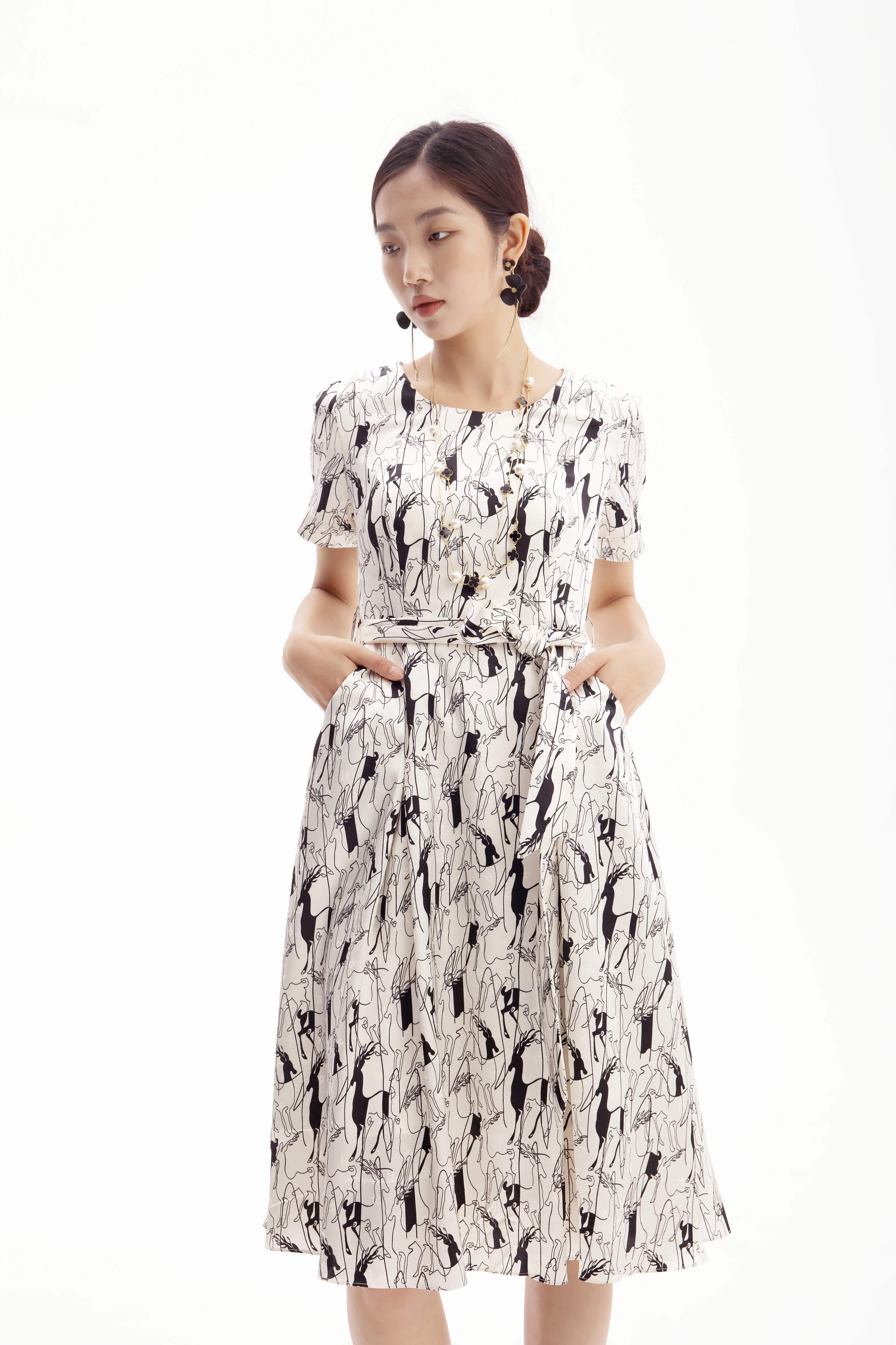 浅杏色的底调宛如夏日清晨的柔和阳光,为整体氛围增添了一份温暖与宁静。而黑色的动物印花图案,则以艺术线条的形式呈现,仿佛在裙身上舞动,充满了生机与活力。
