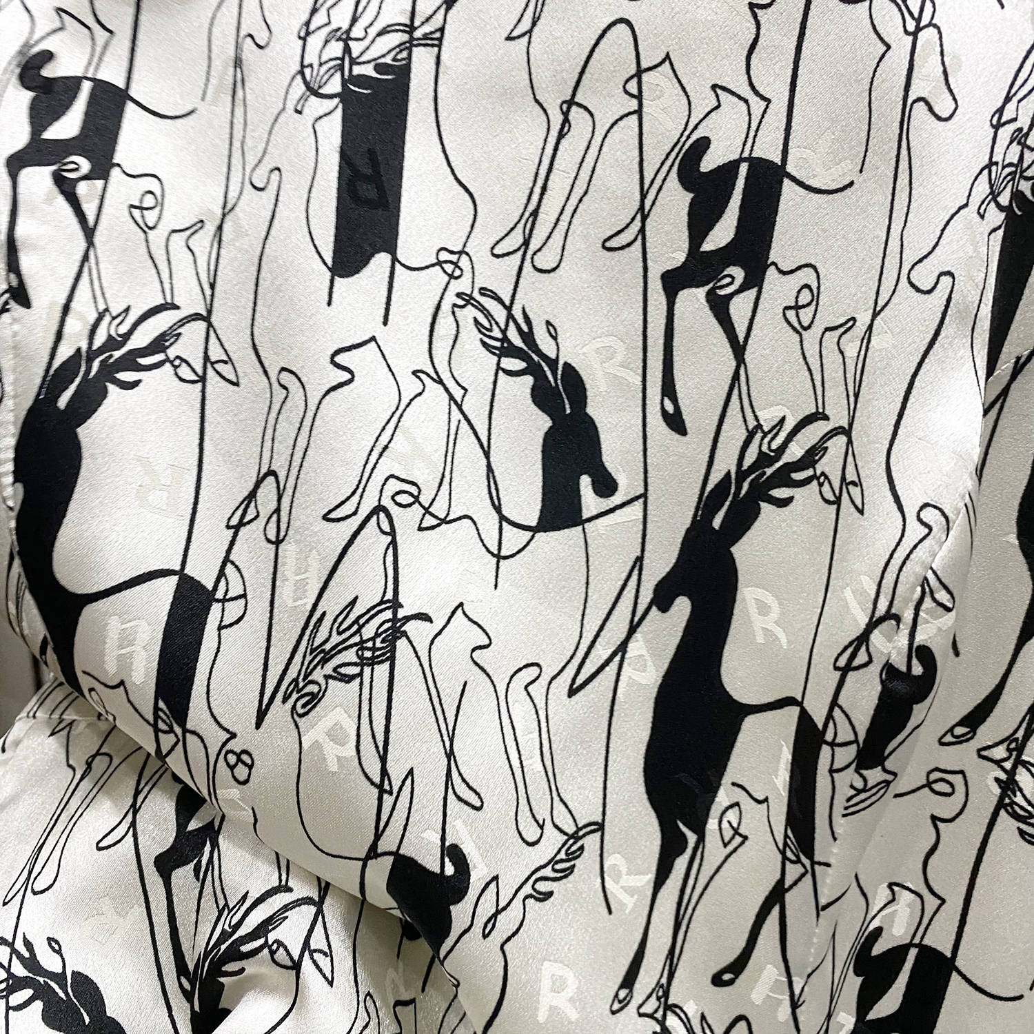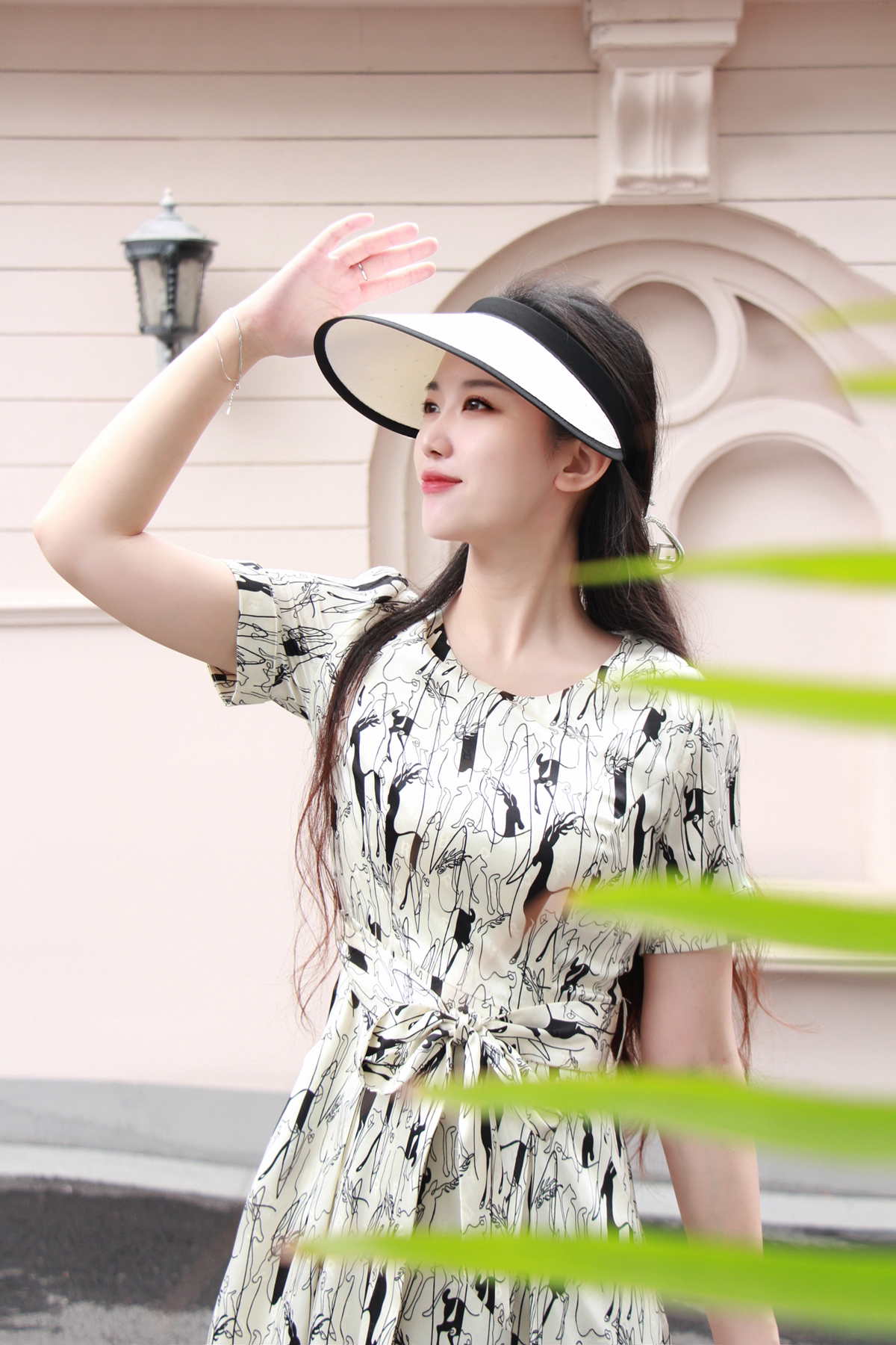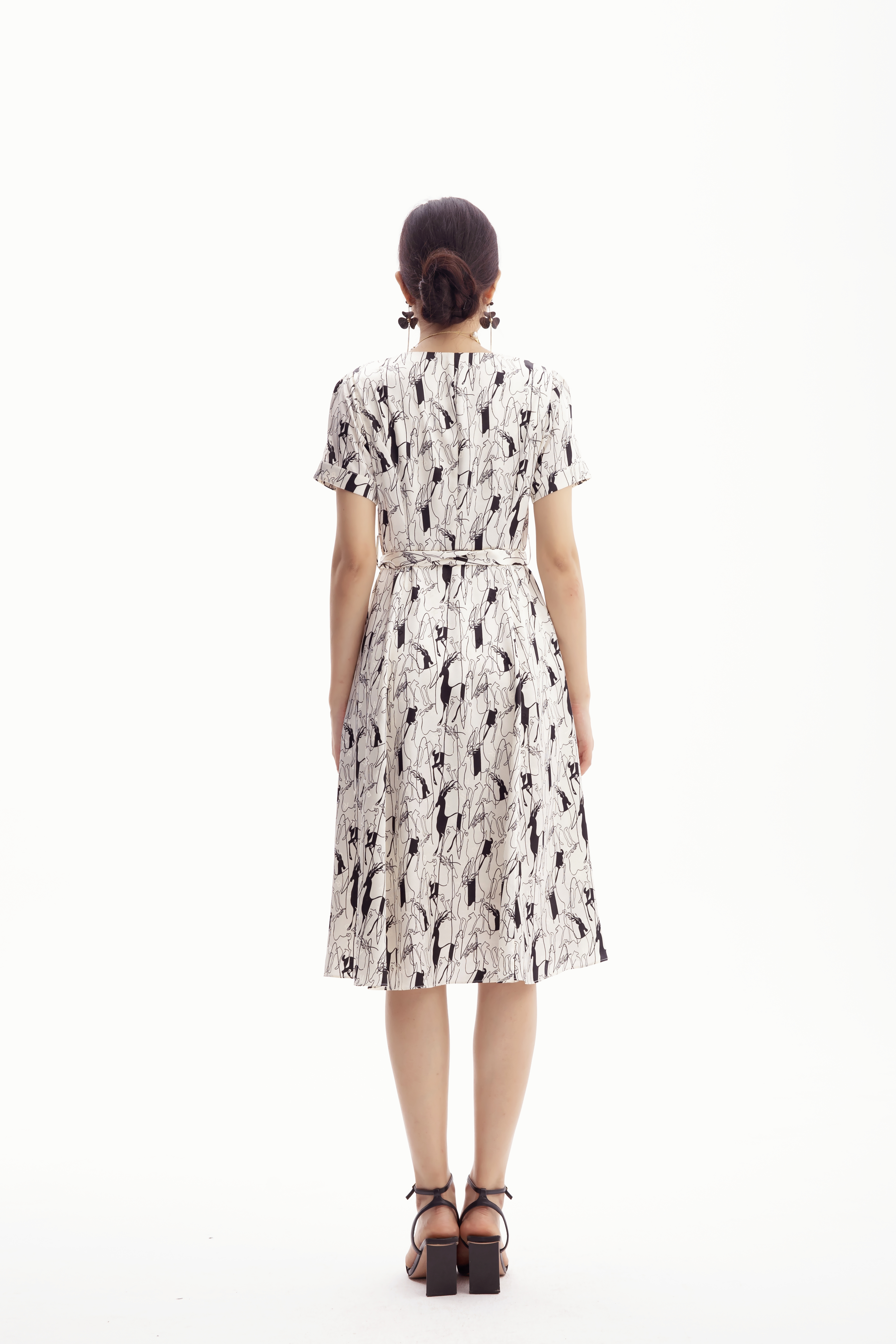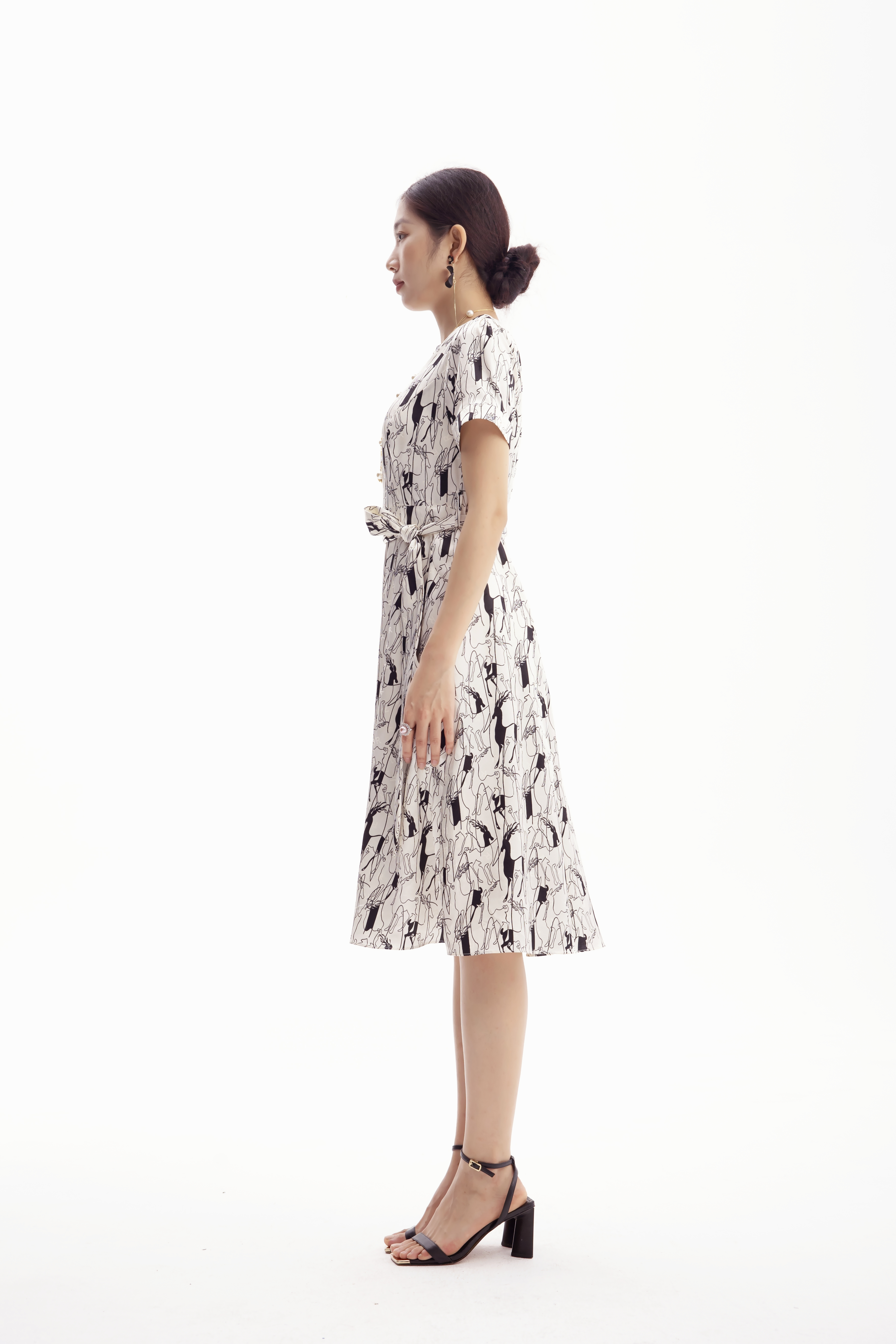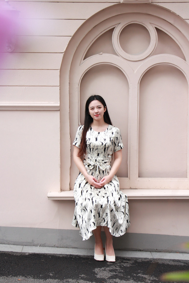 浅杏色的底调宛如夏日清晨的柔和阳光,为整体氛围增添了一份温暖与宁静。而黑色的动物印花图案,则以艺术线条的形式呈现,仿佛在裙身上舞动,充满了生机与活力。