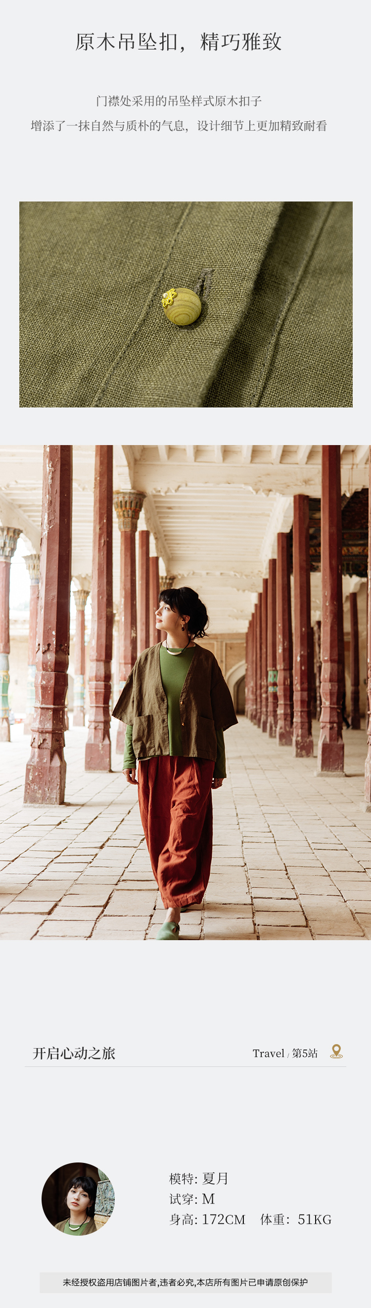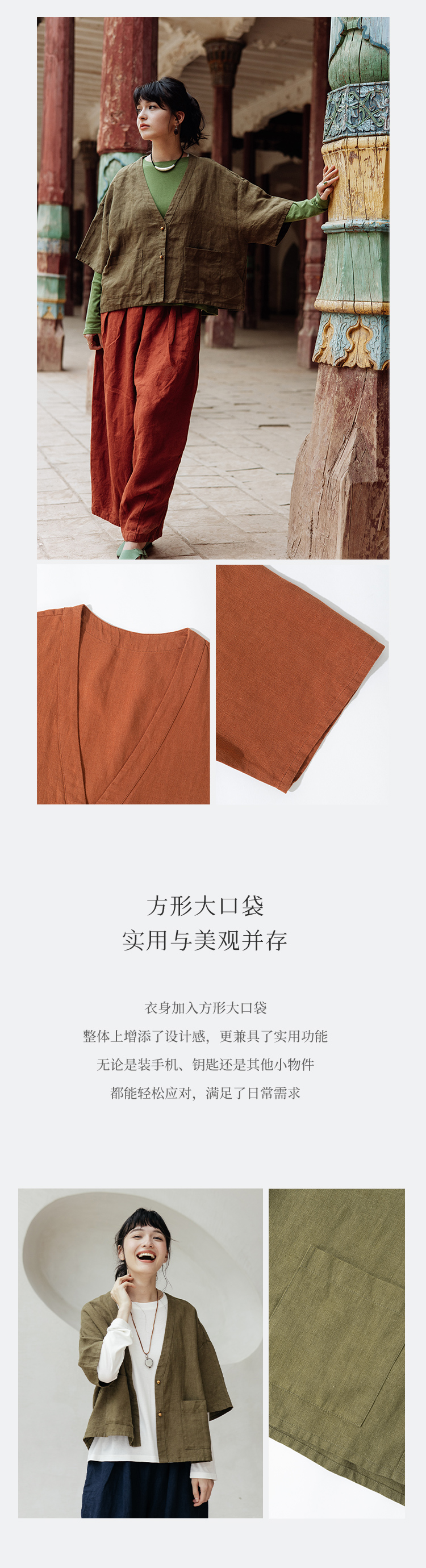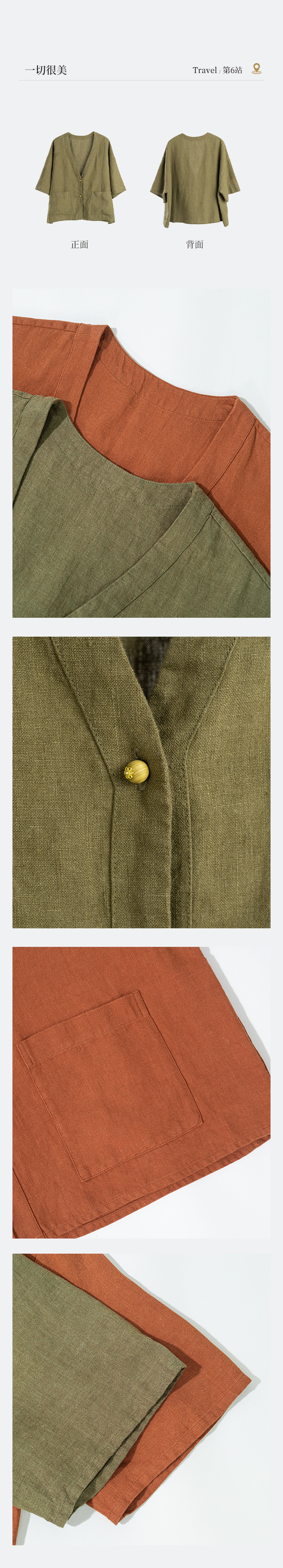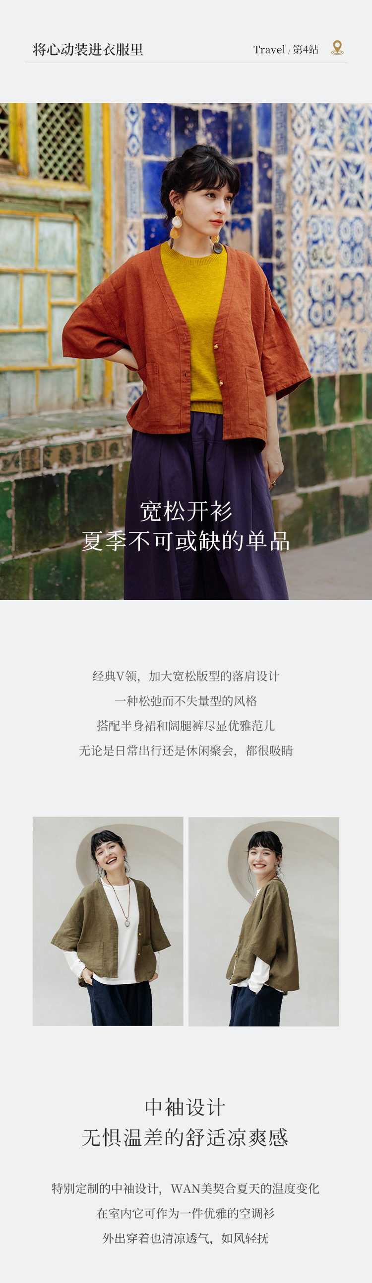 绽放旅行女装529朵/汉麻原木吊坠扣开襟v领小衫宽松落肩中袖开衫