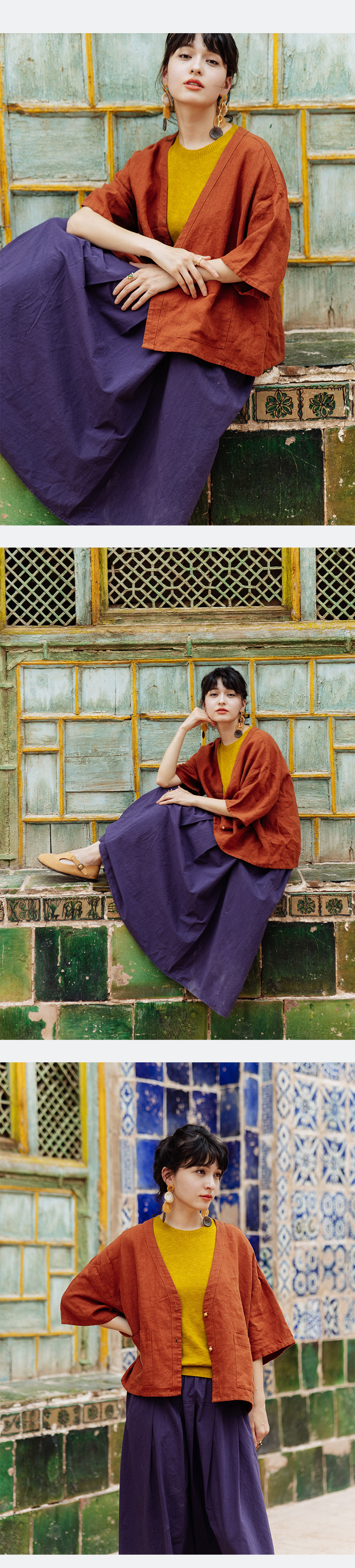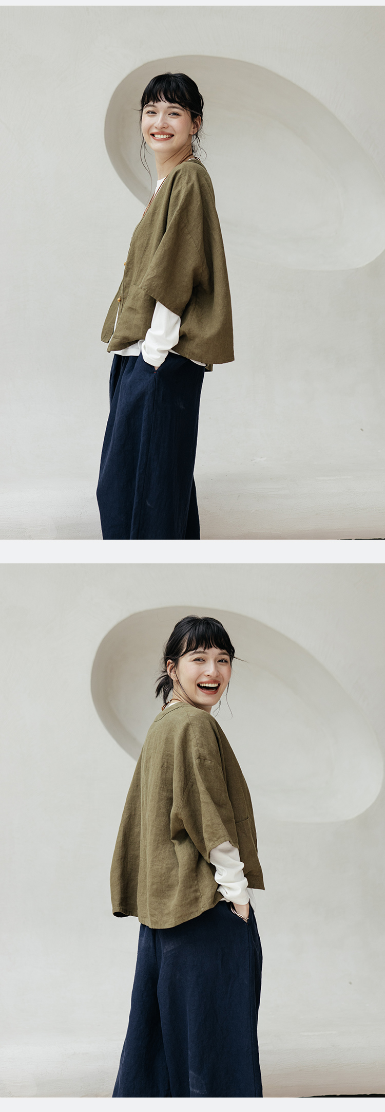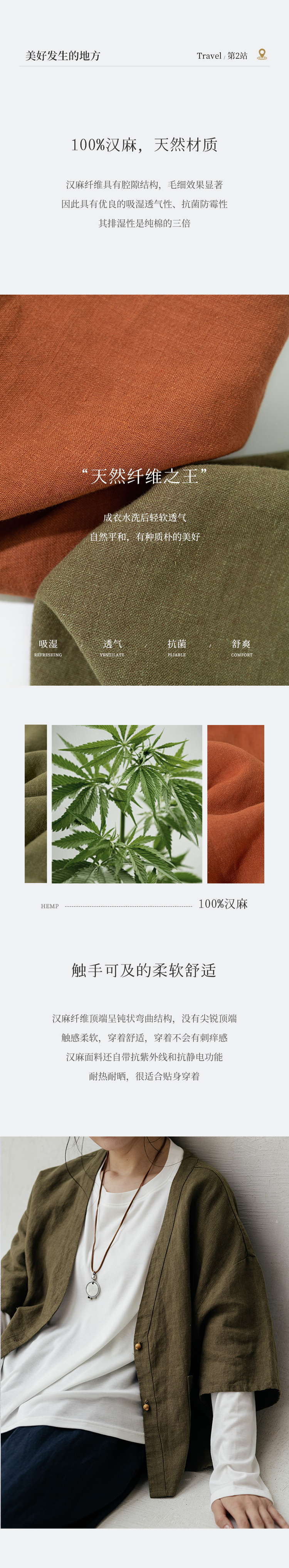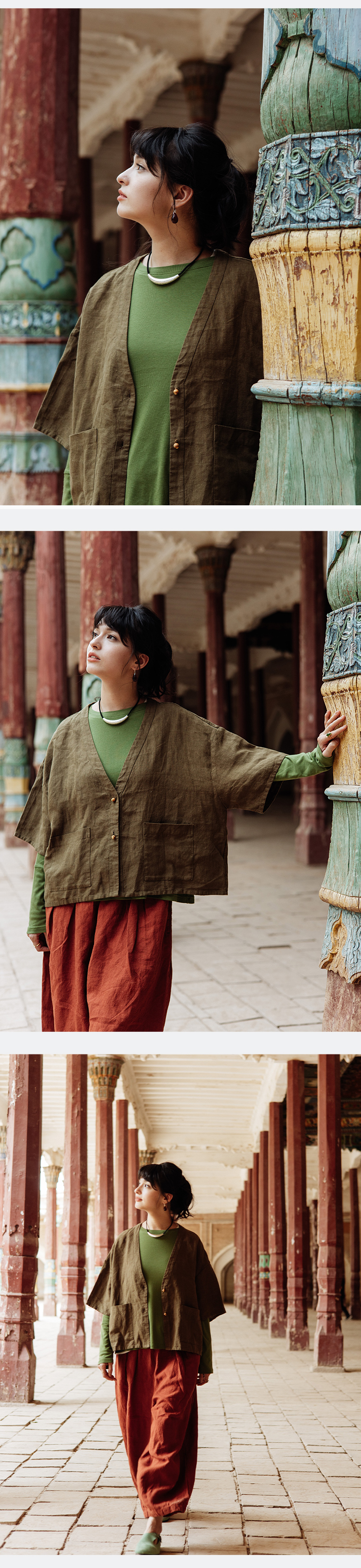 绽放旅行女装529朵/汉麻原木吊坠扣开襟v领小衫宽松落肩中袖开衫