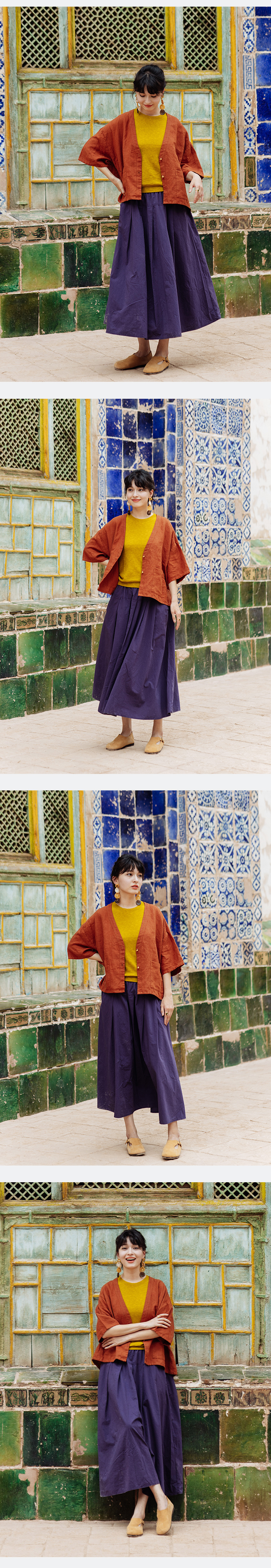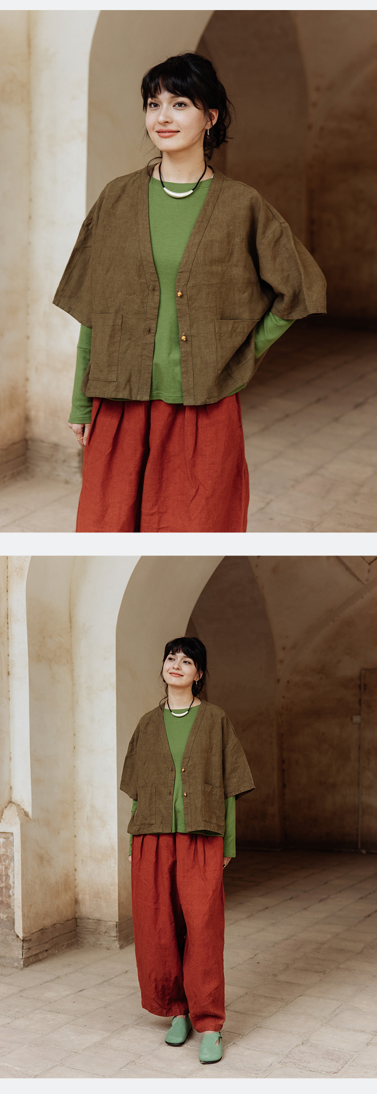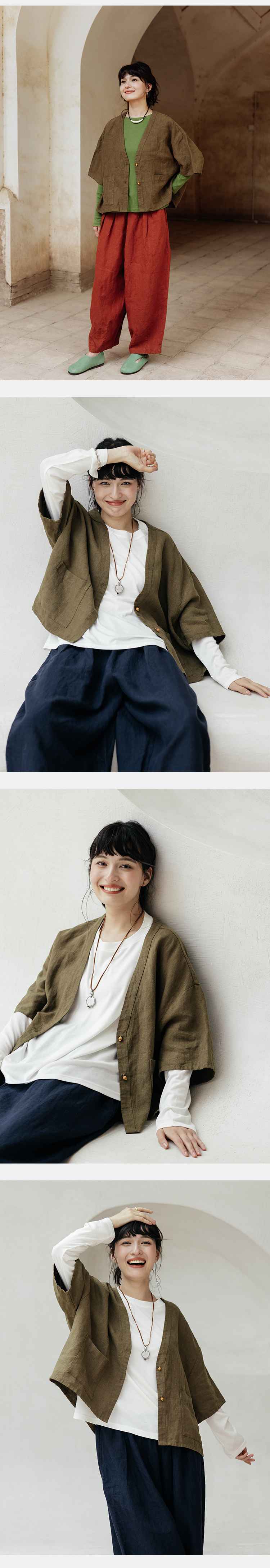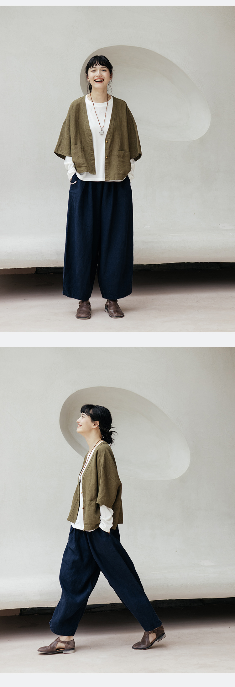 绽放旅行女装529朵/汉麻原木吊坠扣开襟v领小衫宽松落肩中袖开衫