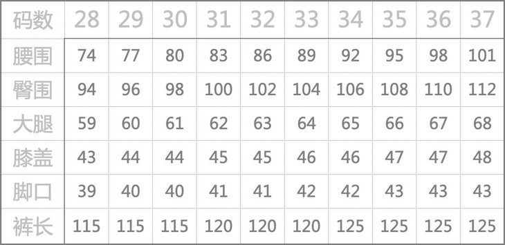 西裤尺码:28~37(尺码表见末尾)