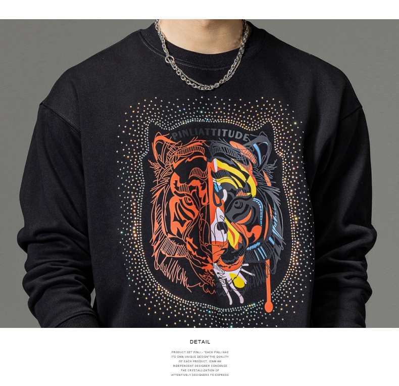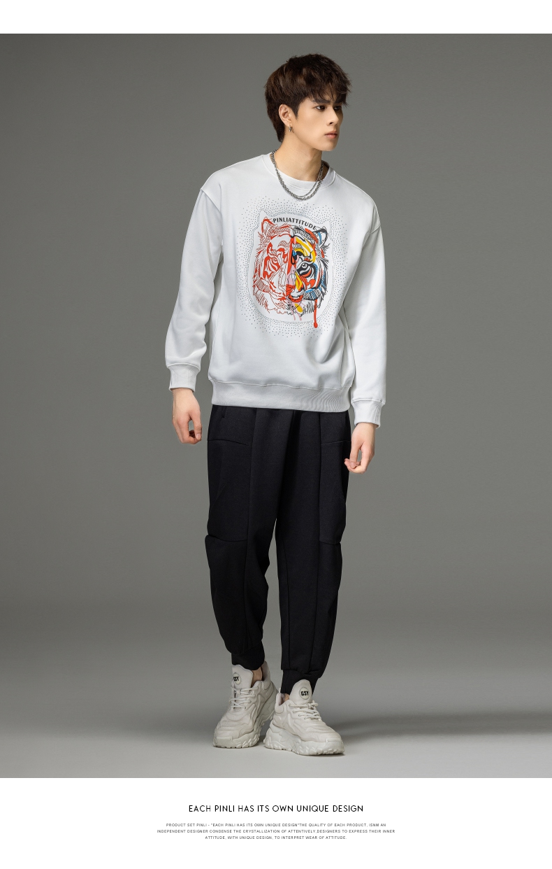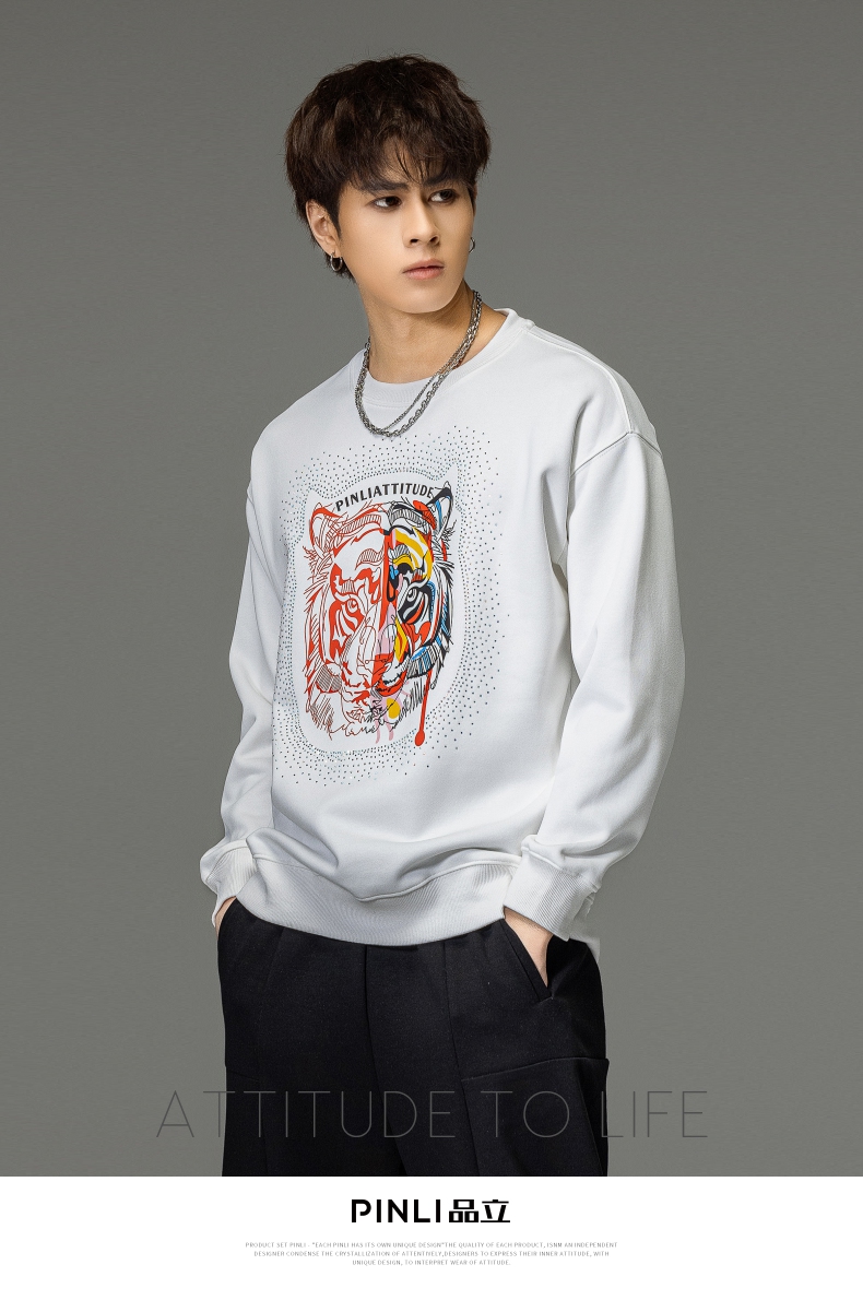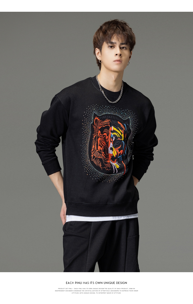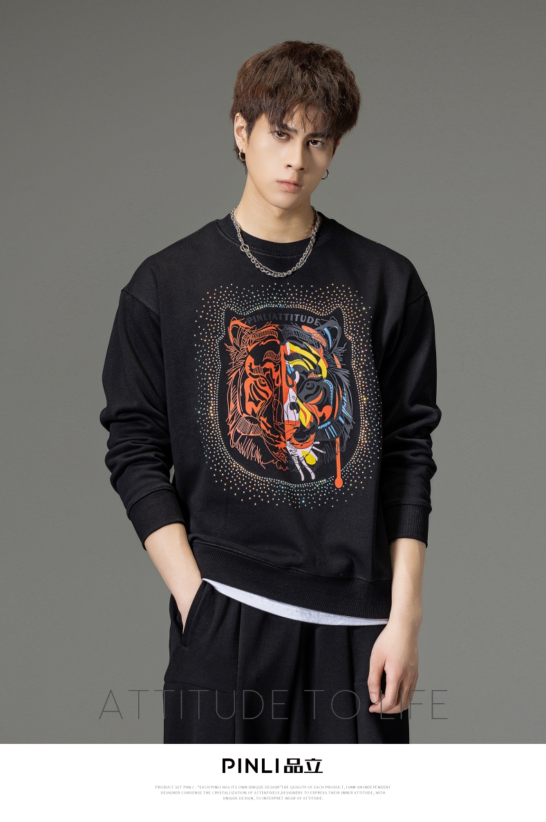PINLI品立秋季新品烫钻圆领卫衣男士潮牌老虎头宽松长袖上衣BV233109029