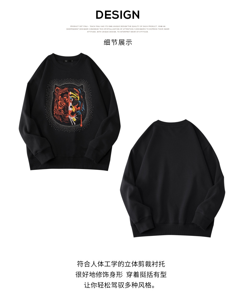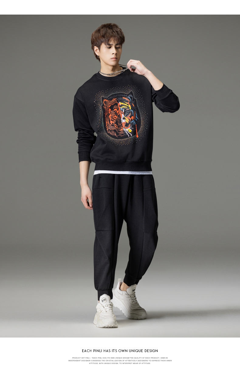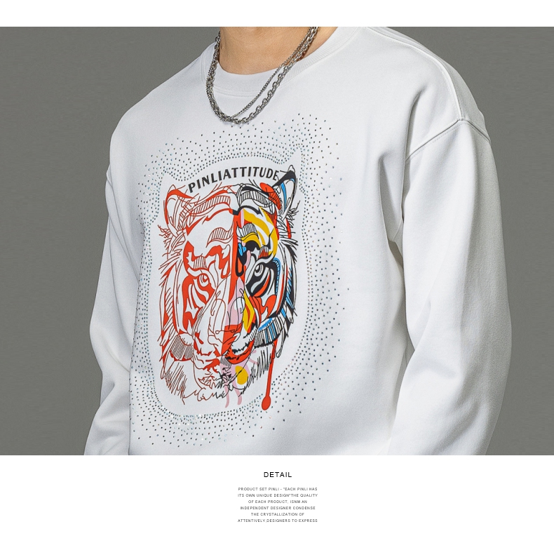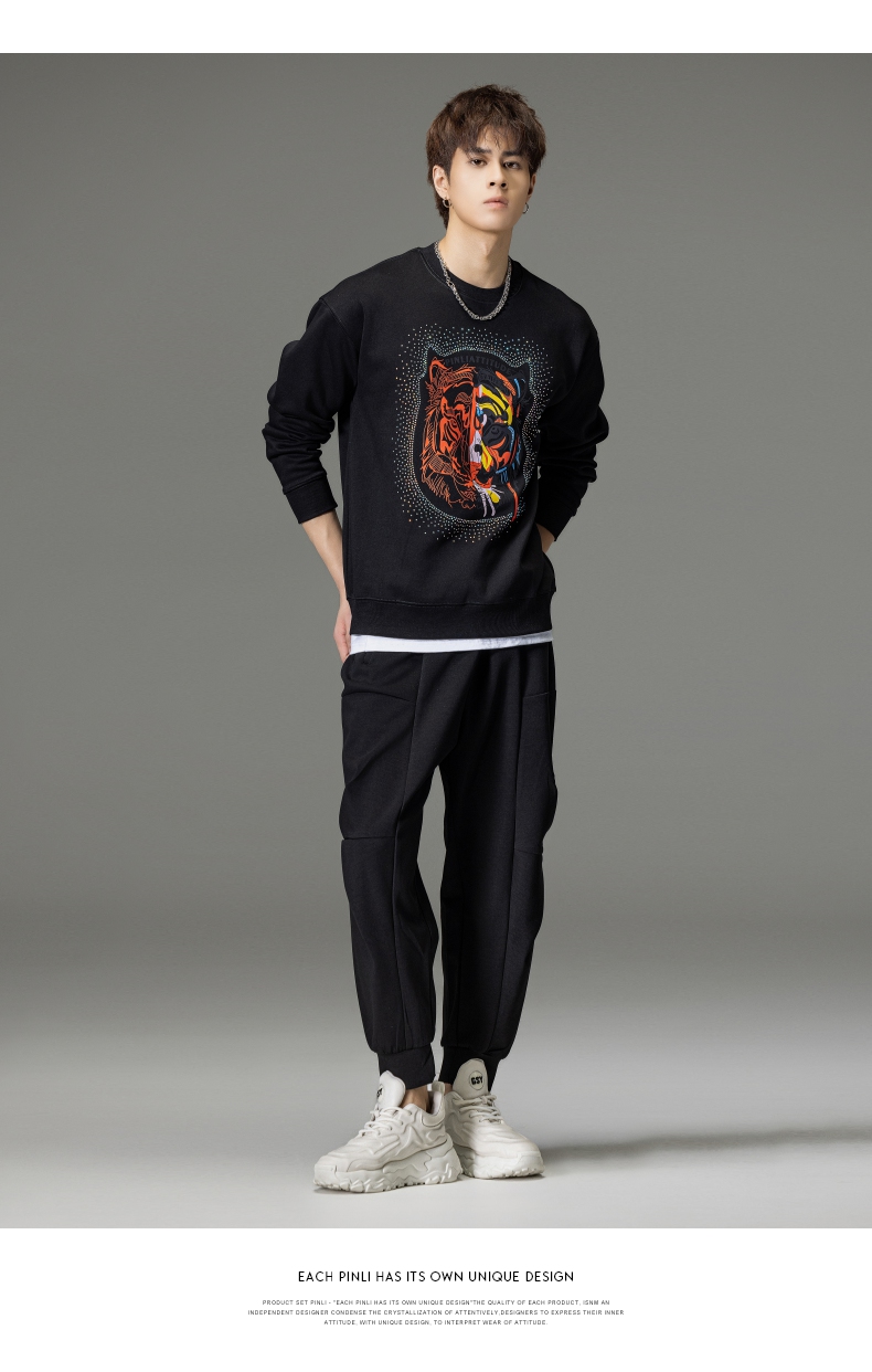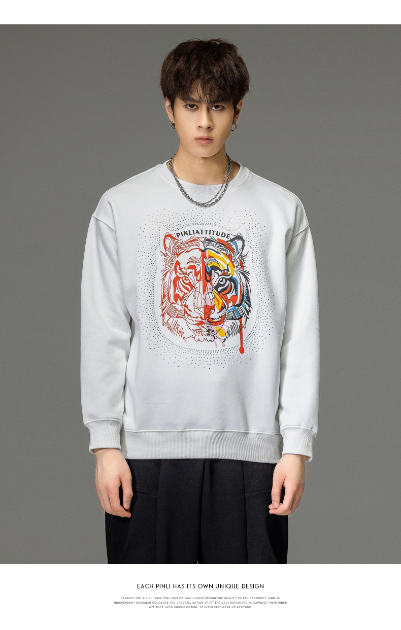 PINLI品立秋季新品烫钻圆领卫衣男士潮牌老虎头宽松长袖上衣BV233109029