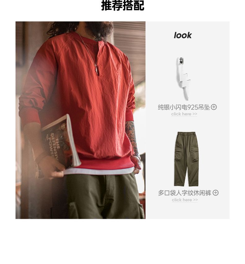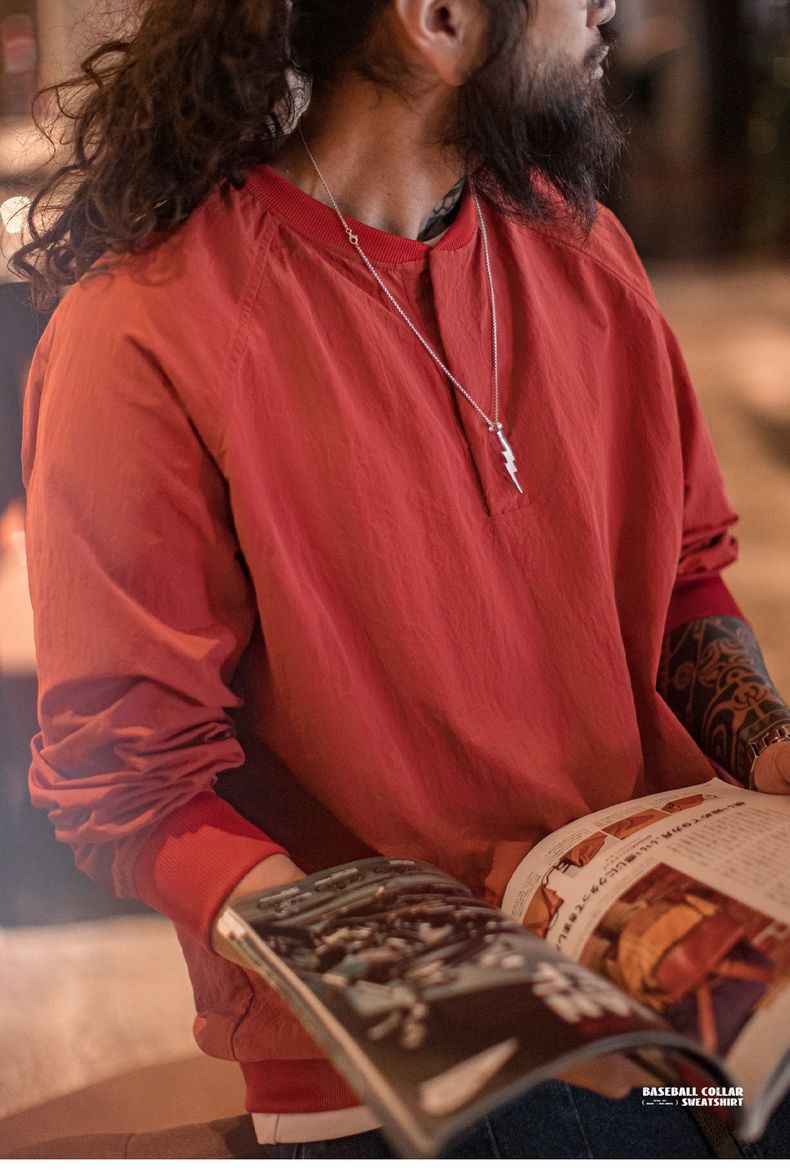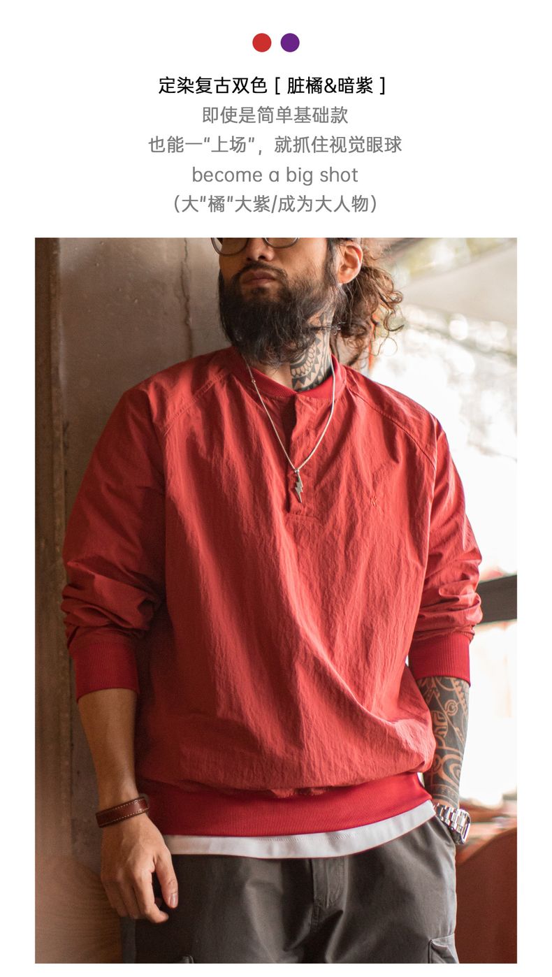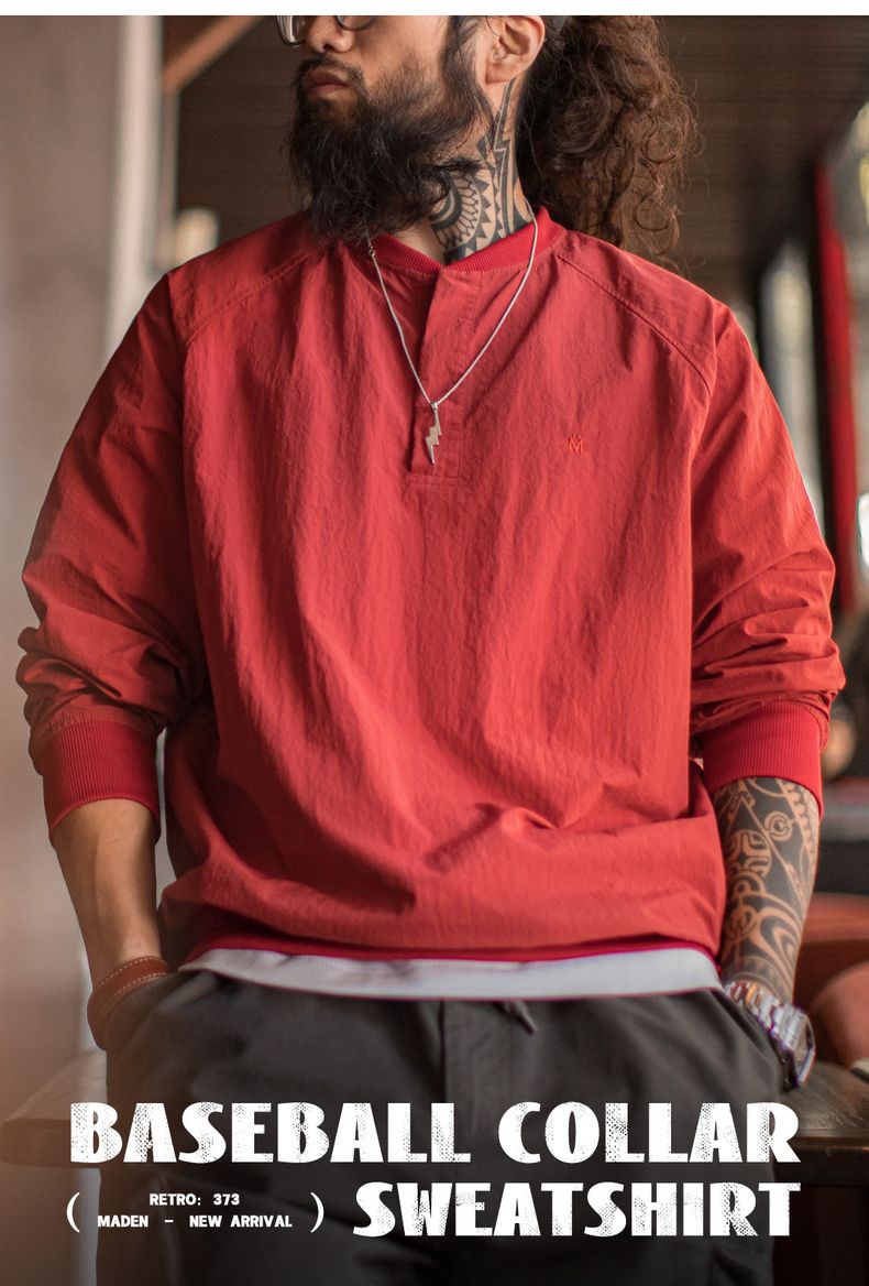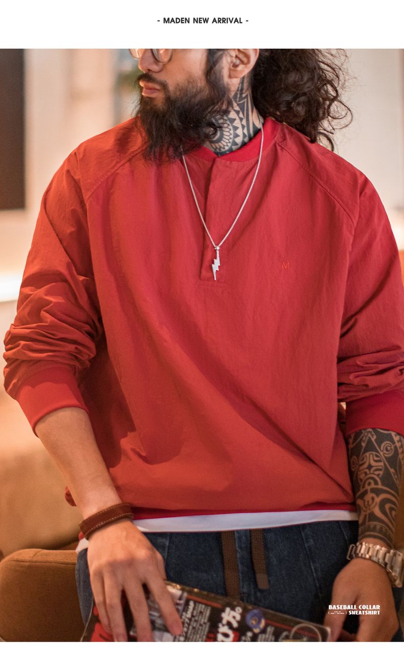 工装优选 美式复古棒球领卫衣新年红色上衣宽松套头衫圆领T恤男春