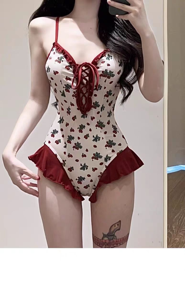 【樱桃印花❗️绑带裙式泳衣】显瘦遮肉不挑身材,度假拍照氛围感拉满!樱桃印花甜美吸睛,连体裙式更显身材曲线,连体吊带两件套装纯欲风显瘦遮肉温泉泳衣L
