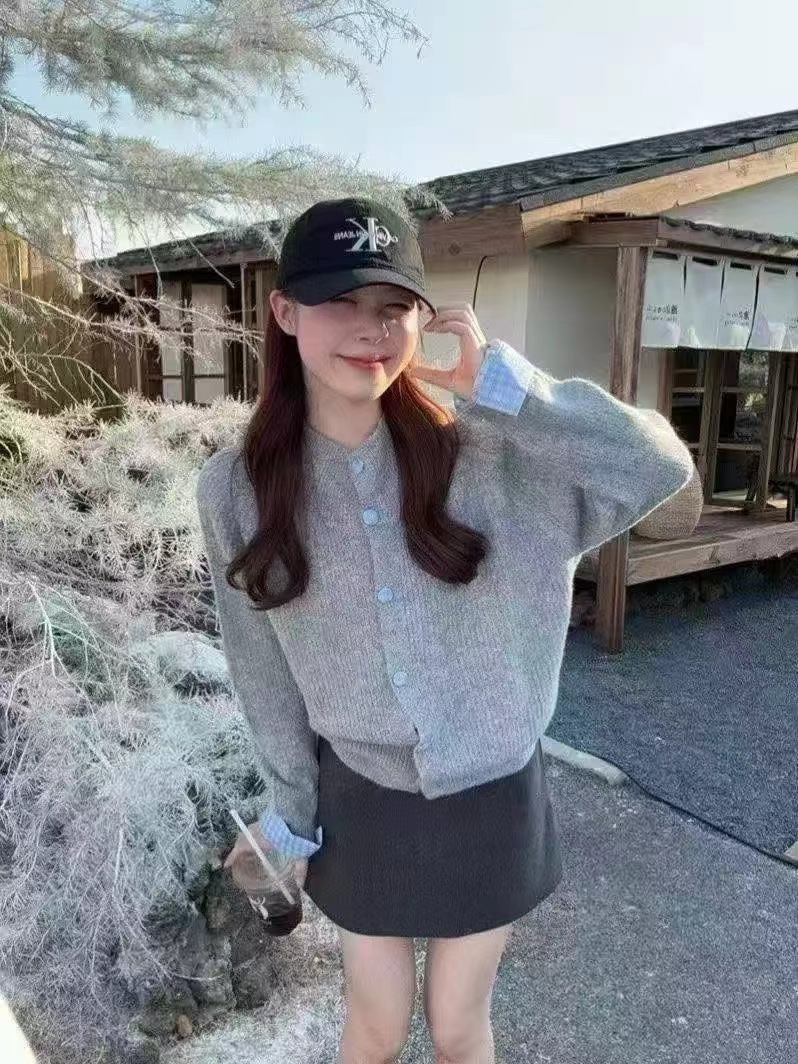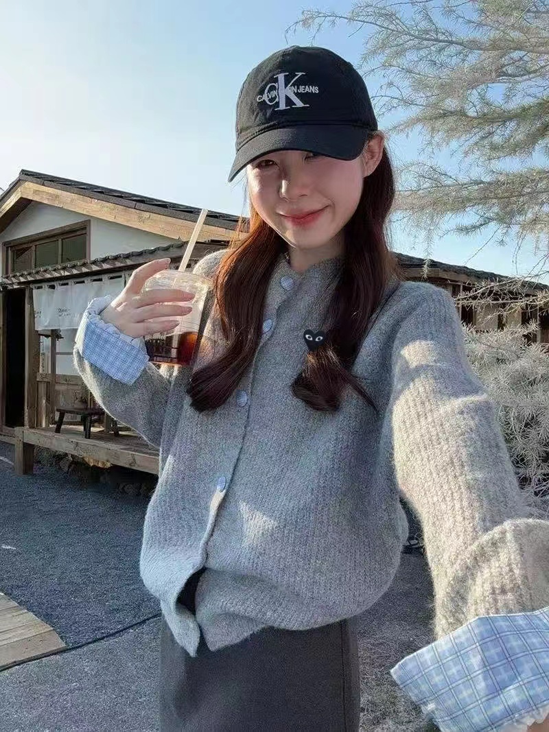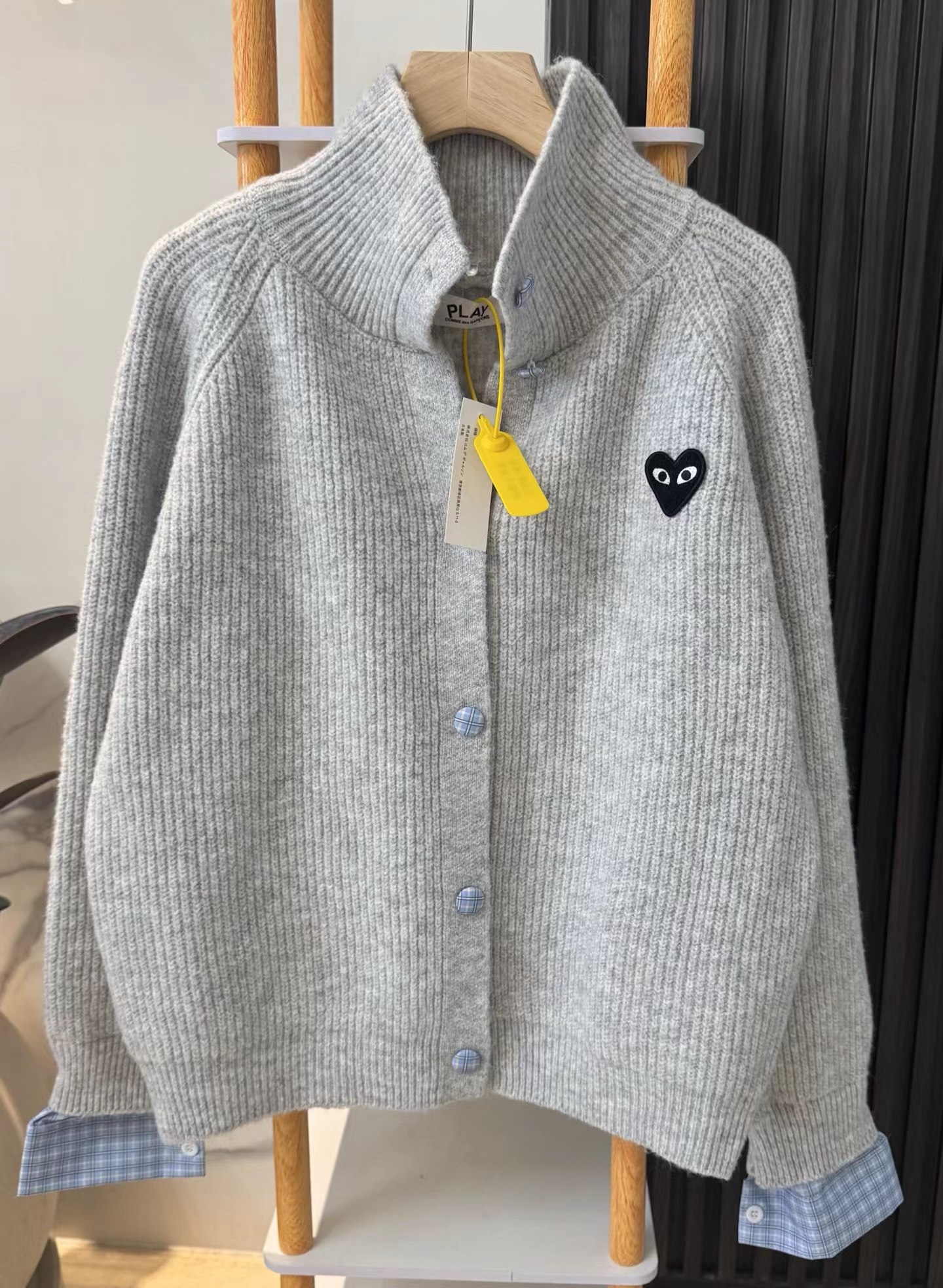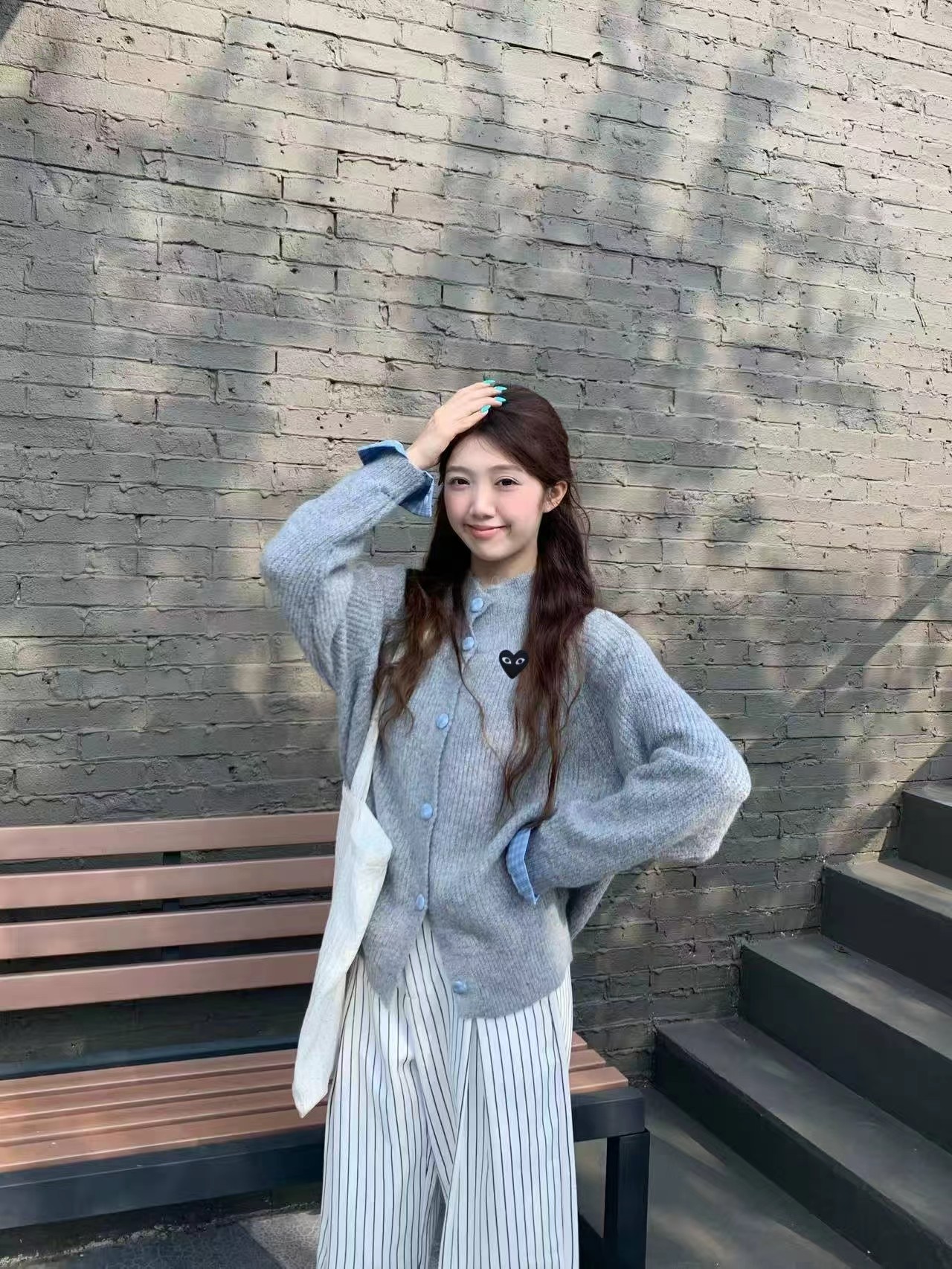 灰色立领针织开衫采用立领设计,领口利落;整体为宽松的落肩版型,搭配插肩袖设计,穿着舒适且有休闲感。选用粗针织纹理的粉色纱线,质感软糯,自带温柔的肌理感;袖口拼接蓝白格纹布料,增添了细节层次门襟处是浅蓝色圆形纽扣,左胸位置有标志性的红心情趣刺绣(爱心内嵌白色眼睛图案),成为视觉亮点。甜酷风结合学院风,灰色调营造甜美感,立领与纽扣设计又带点干练,搭配百褶裙等下装适配度高。
