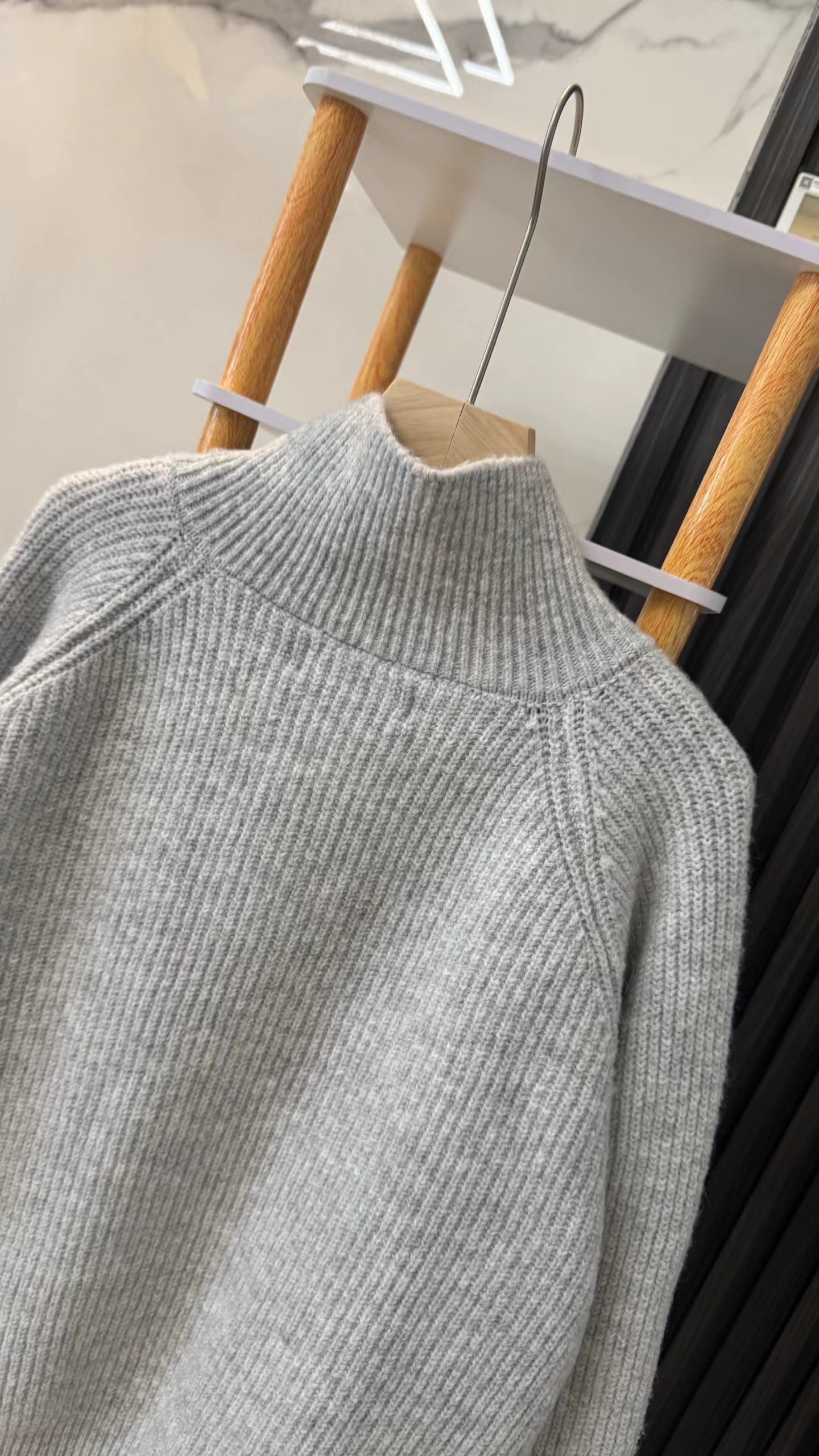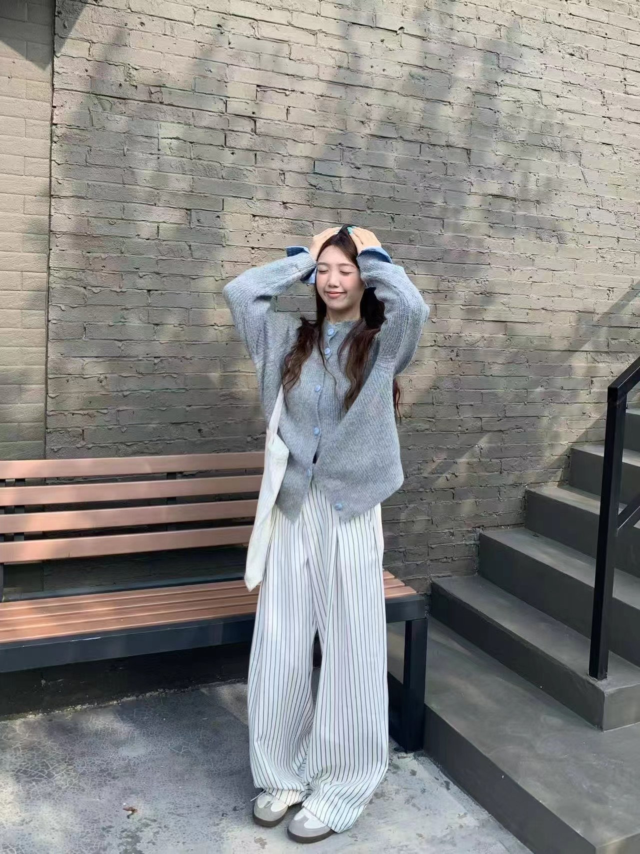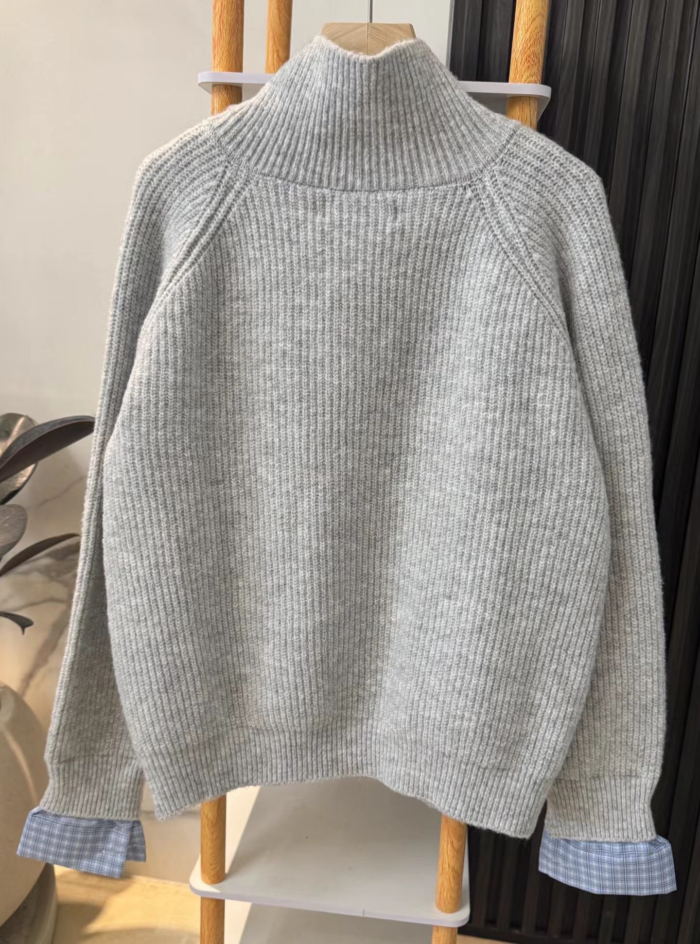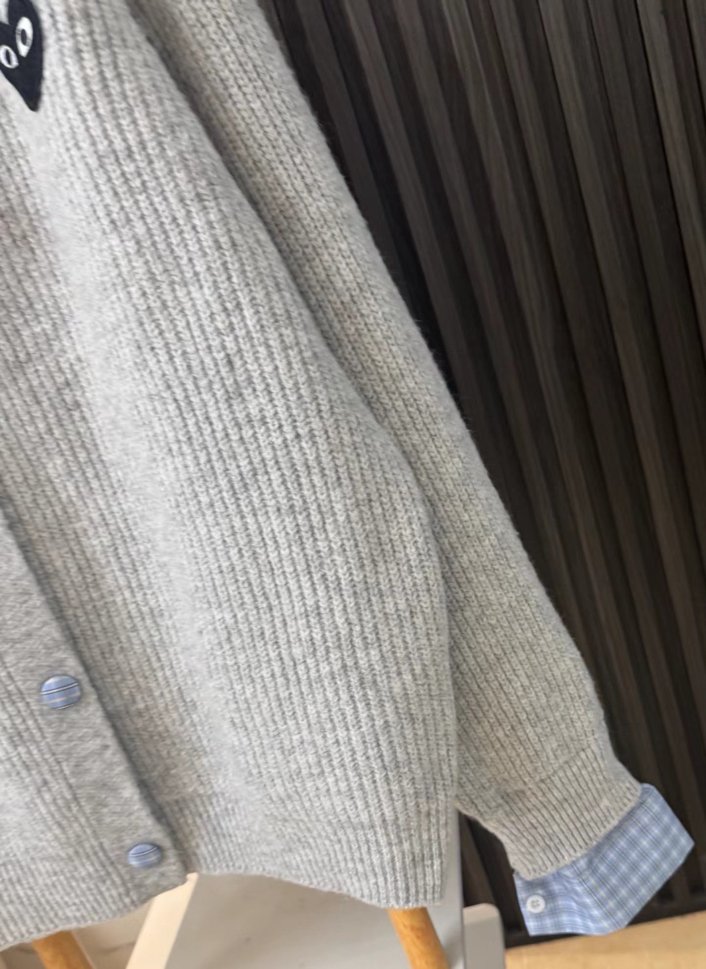 灰色立领针织开衫采用立领设计,领口利落;整体为宽松的落肩版型,搭配插肩袖设计,穿着舒适且有休闲感。选用粗针织纹理的粉色纱线,质感软糯,自带温柔的肌理感;袖口拼接蓝白格纹布料,增添了细节层次门襟处是浅蓝色圆形纽扣,左胸位置有标志性的红心情趣刺绣(爱心内嵌白色眼睛图案),成为视觉亮点。甜酷风结合学院风,灰色调营造甜美感,立领与纽扣设计又带点干练,搭配百褶裙等下装适配度高。