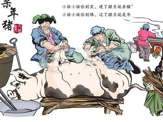 注:杀年猪是汉族和少数民族的传统年俗。平时杀猪家里人一时半会吃不完,一般都是卖了换钱花。惟独过年(春节)是个例外,进了腊月,大部分人家都要杀猪,为过年包饺子、做菜准备肉料,民间谓之“杀年猪”。东北童谣中说“小孩小孩你别哭,进了腊月就杀猪”,“小孩小孩你别馋,过了腊月就是年”,从一定程度上反映了人们盼望杀年猪吃肉的心情。