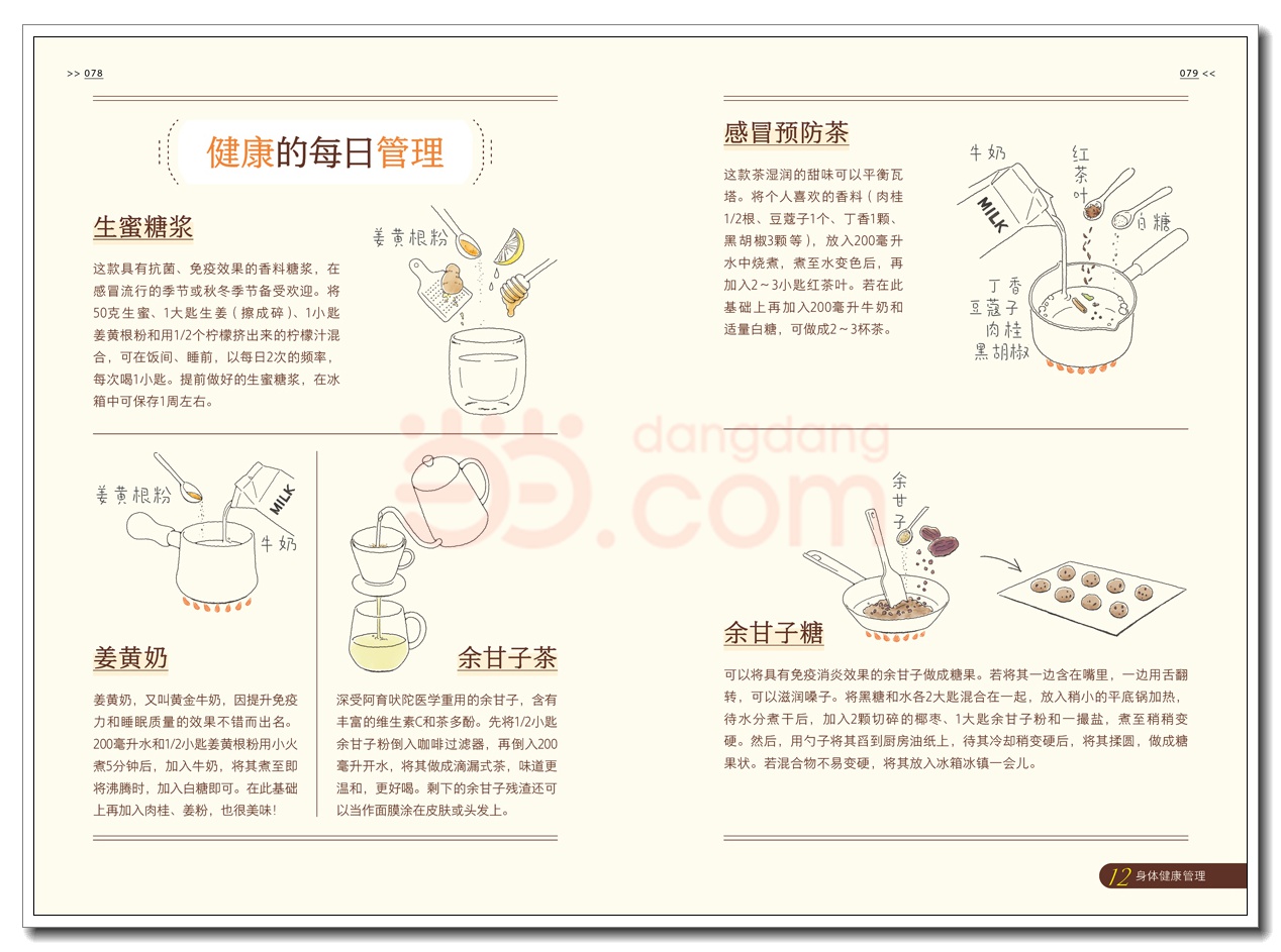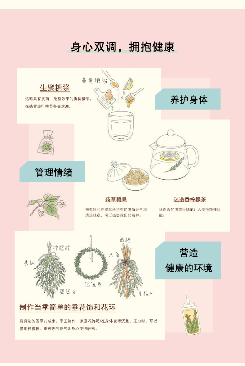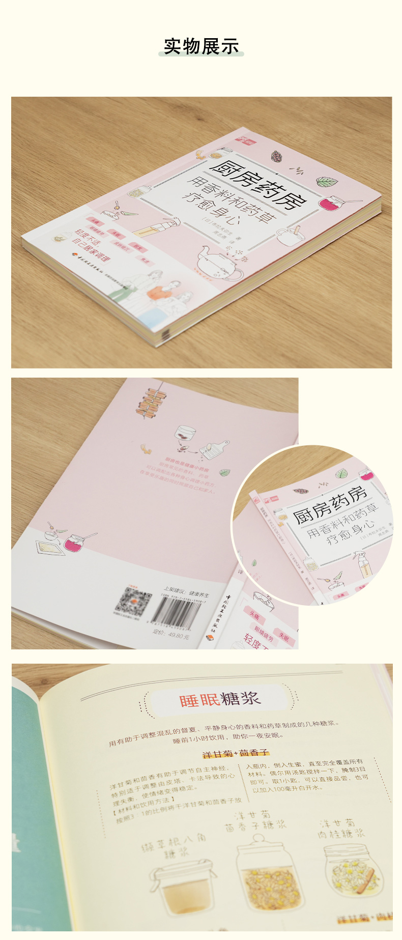 《厨房药房:用香料、药草疗愈身心》是一本基于印度传统医学理论阿育吠陀的自我调理疗愈指南。该书运用通俗易懂的语言和温馨可爱的插图,引导读者辨析自身体质,学会使用家庭厨房中常见的原材料来调理身心,缓解日常身体和心理的各种不适。书中包含180多种自然护理方法,原料易得、方法易行、一学就会。一本身体护理全书。无论是头、眼、鼻、关节等器官,还是消化、内分泌、睡眠等功能,常见的各种不适症状,都能在书中找到适宜的护理方法。一本家庭健康指南。指导你辨析家人体质,在不同的季节,使用厨房中的香料和药草,改善家庭环境,调理身体和情绪出现的各种轻微不适,管理身体健康。及时有效的自然调理,有助于防微杜渐,减少去医院的频次。一本送给自己和闺蜜的最佳健康礼物。全彩印刷、设计精良,插图精美、色调温馨,非常有品位的一本小书,既适合精致女性自己翻阅,也适合作为健康礼物送给关爱的人。