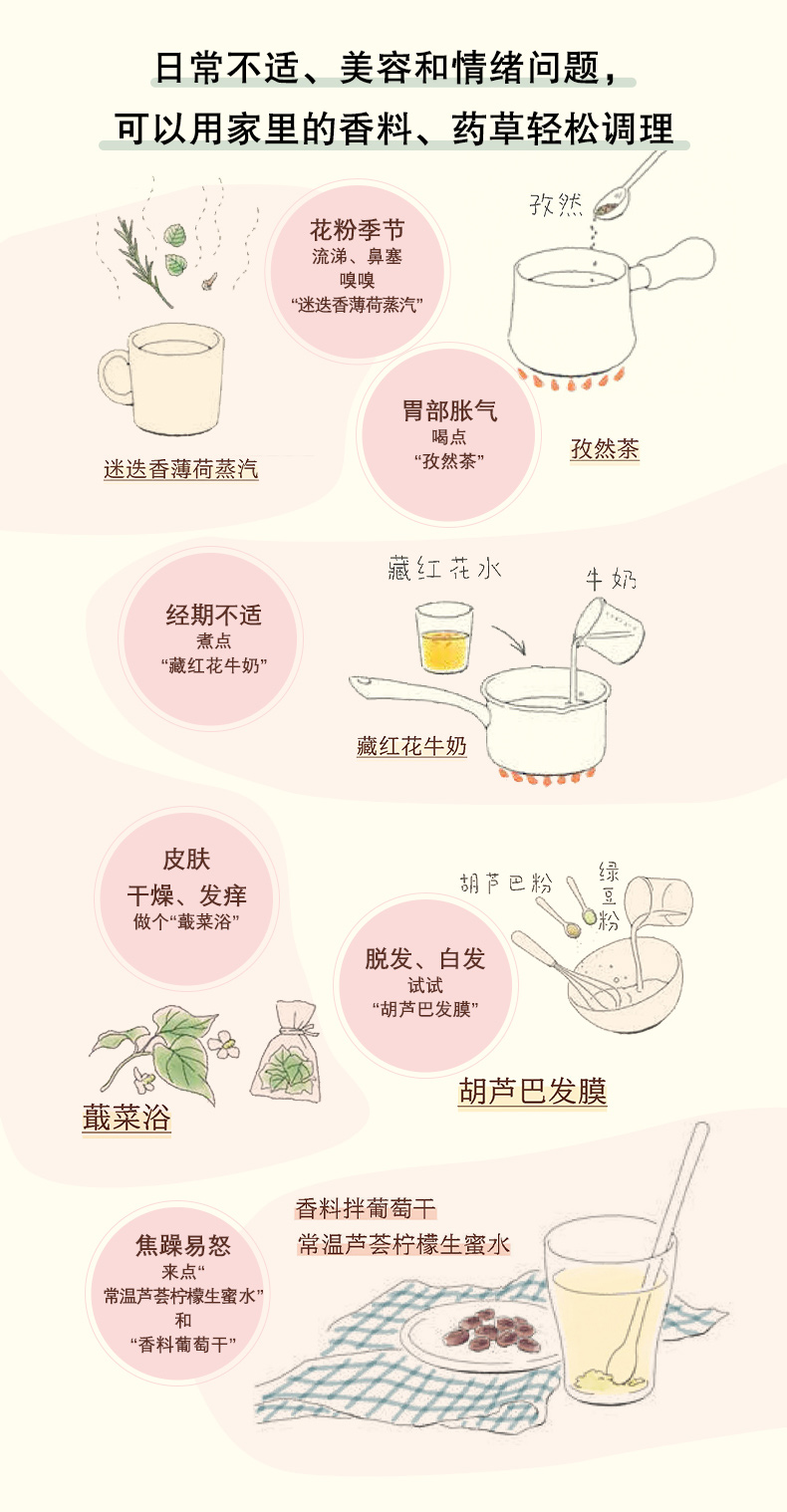 前言厨房是守护自己和家人健康的地方。这句话道出了;身心皆可由己保养;世上没有不能入药的植物等阿育吠陀的精髓。我本人在35岁之前经常便秘、腹泻,胃痛和头疼更是家常便饭,以致那些年若不随身携带若干药品,我都会心慌意乱。但自从遇到阿育吠陀,并开始掌握利于调整身心平衡的;厨房药房的知识,我便摇身一变,成了;只要稍稍注意,便无须吃药的人现在不仅身体不适消失殆尽,感觉还比20多岁时更健康。每当我站在阿育吠陀的视角细品我在用了香料和药草之后的身心变化,;身体被植物能量包围,变得元气满满的感觉就会油然而生。其实,随着我能辨别符合自身体质的东西、当下身体需要的东西和身体不需要的东西,很自然地,生活的各方面都逐渐变协调了。;我想把这份愉悦与更多人分享。基于这个想法,我开办了厨房药房小作坊。其受众大多是;没到上医院的程度,但总觉得哪里不舒服的人,和持有;随着年龄增长,我想用纯天然的东西调理身心等想法的人。我们实践的内容多种多样,比如,在芳香四溢的房间里,像在实验室中那样配药、捣药,或将药草泡入精油中。此外,我们还会一边学习辨别身心状态的方法,一边尝试混合匹配的药草,或观察其中的变化。虽然小作坊的持续时间并不长,但我亲眼看到很多参与者当场便变得精神饱满。他们有的说;沉重的身体变轻松了,有的说;坏心情已烟消云散。每当收到这样的积极反馈,我就会觉得,生活在现代的我们,真有必要为自己的身心腾出些时间,让自己用五官去感受浓缩在小小果实或叶片中的天然能量。尤其是对于随着年龄增长,身心变得越来越脆弱或动不动就出现问题的人而言,这种能让人直接感受到的自然能量,能给予人们一种被全方位保护的安心感。很多人都跟我说:;原先觉得很难的阿育吠陀,竟然可以在家轻松实践。其实这也是厨房药房的魅力之一。我们一旦用香料、药草调理好身心,人际关系、工作学习等各种各样的事就会很自然地进入良性循环状态。即便你只是想调理小小的身体不适或开展日常护理,也请以轻松的状态,将本书介绍的这些方法应用于日常生活中吧!