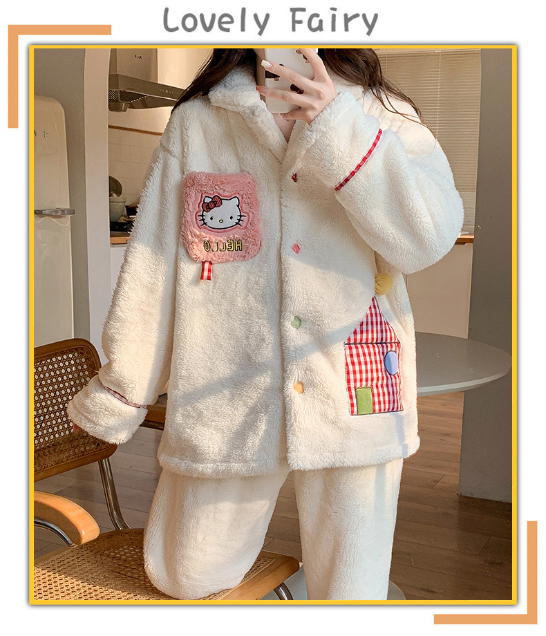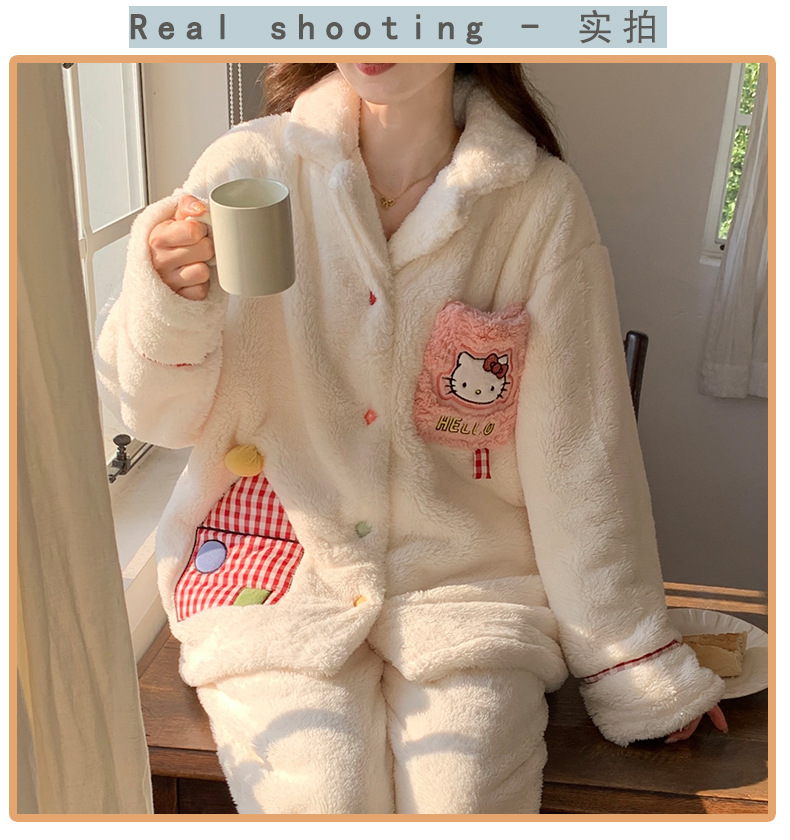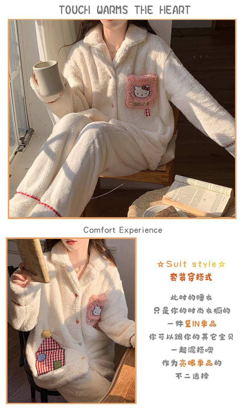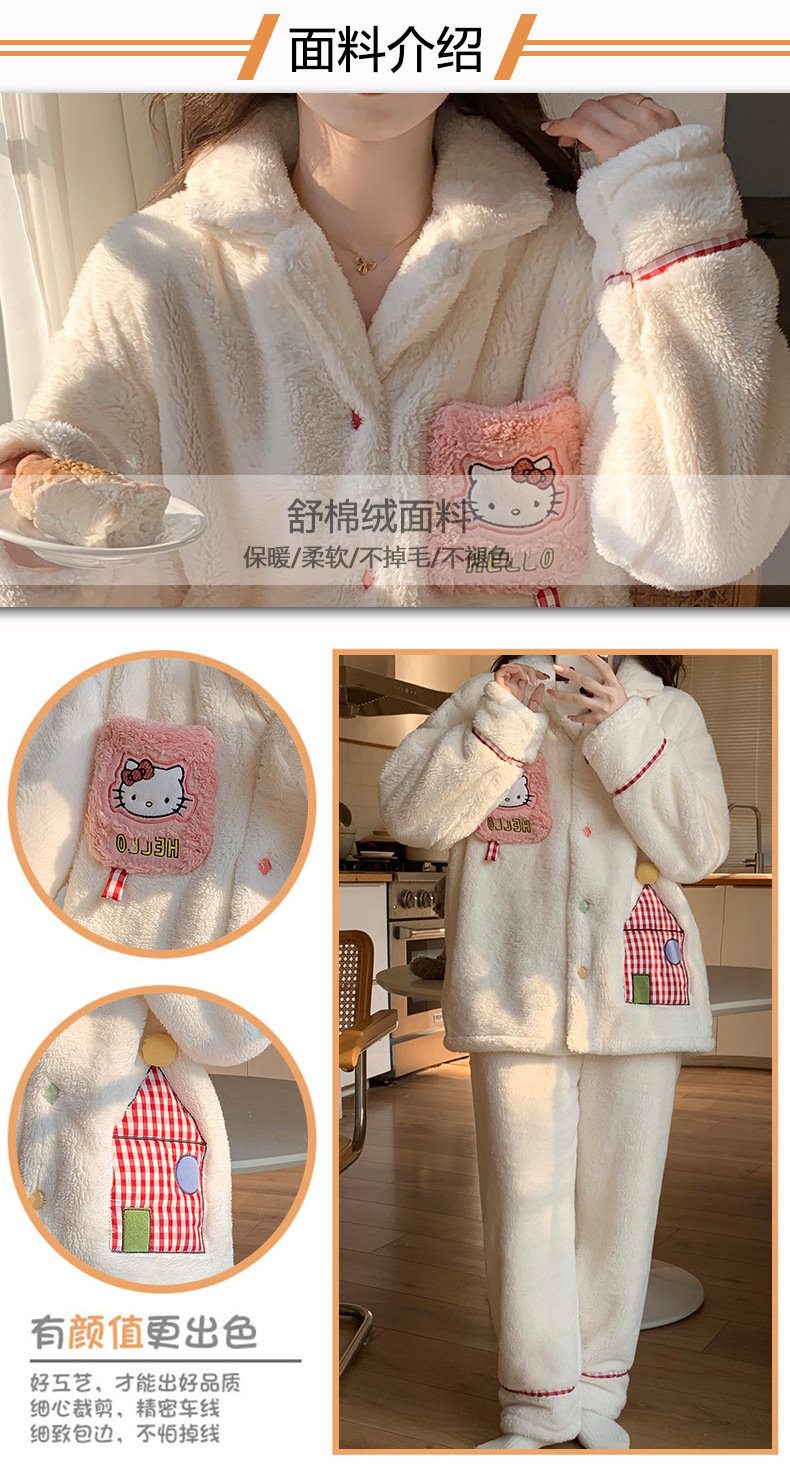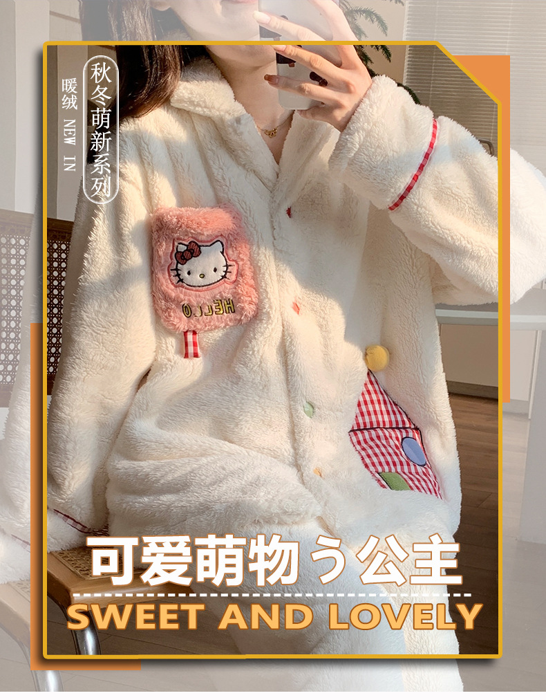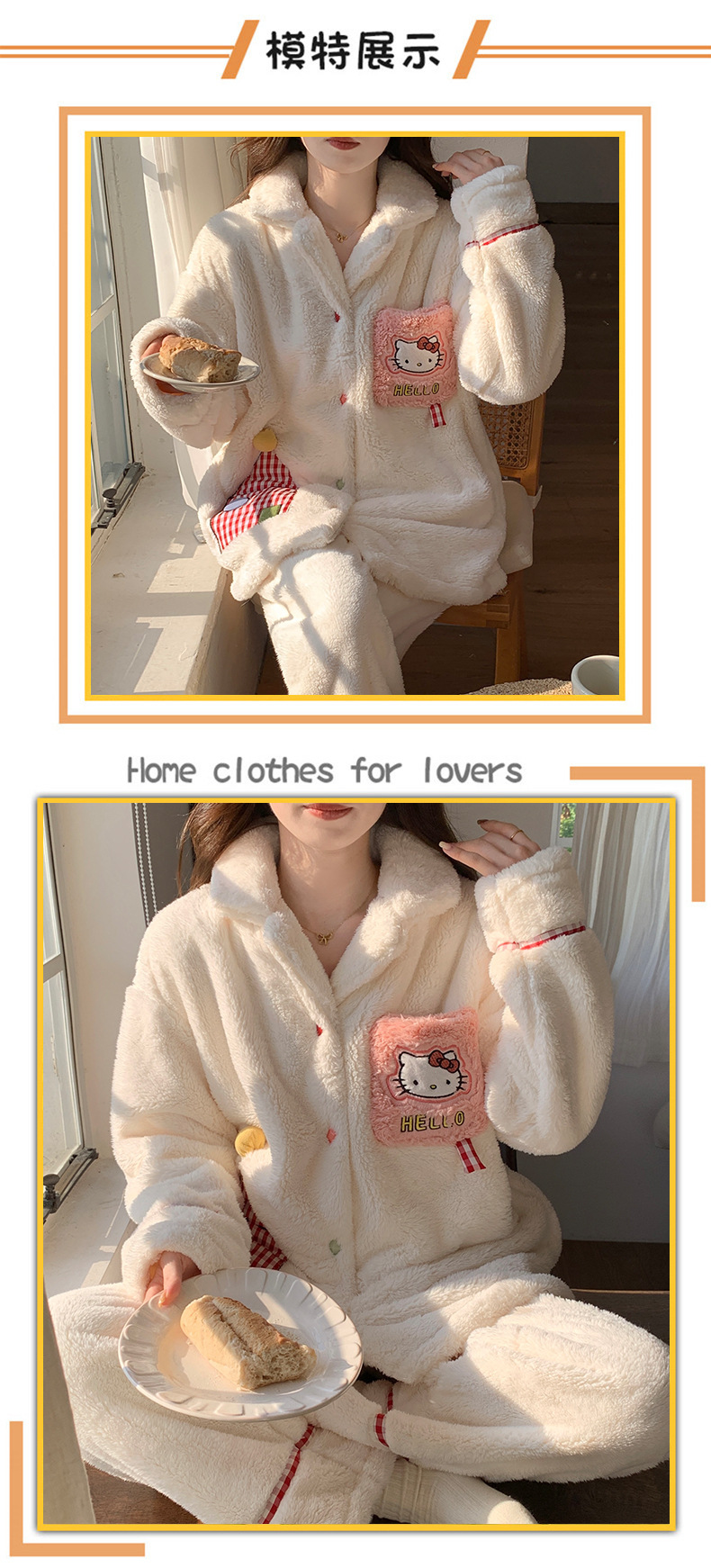 【超萌公主风❗️舒棉绒甜美家居服套装】可爱又好看,轻松御寒不臃肿,冬季睡衣女珊瑚绒翻领风加绒卡通KT猫开扣长袖长裤