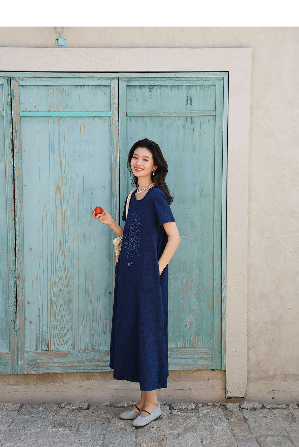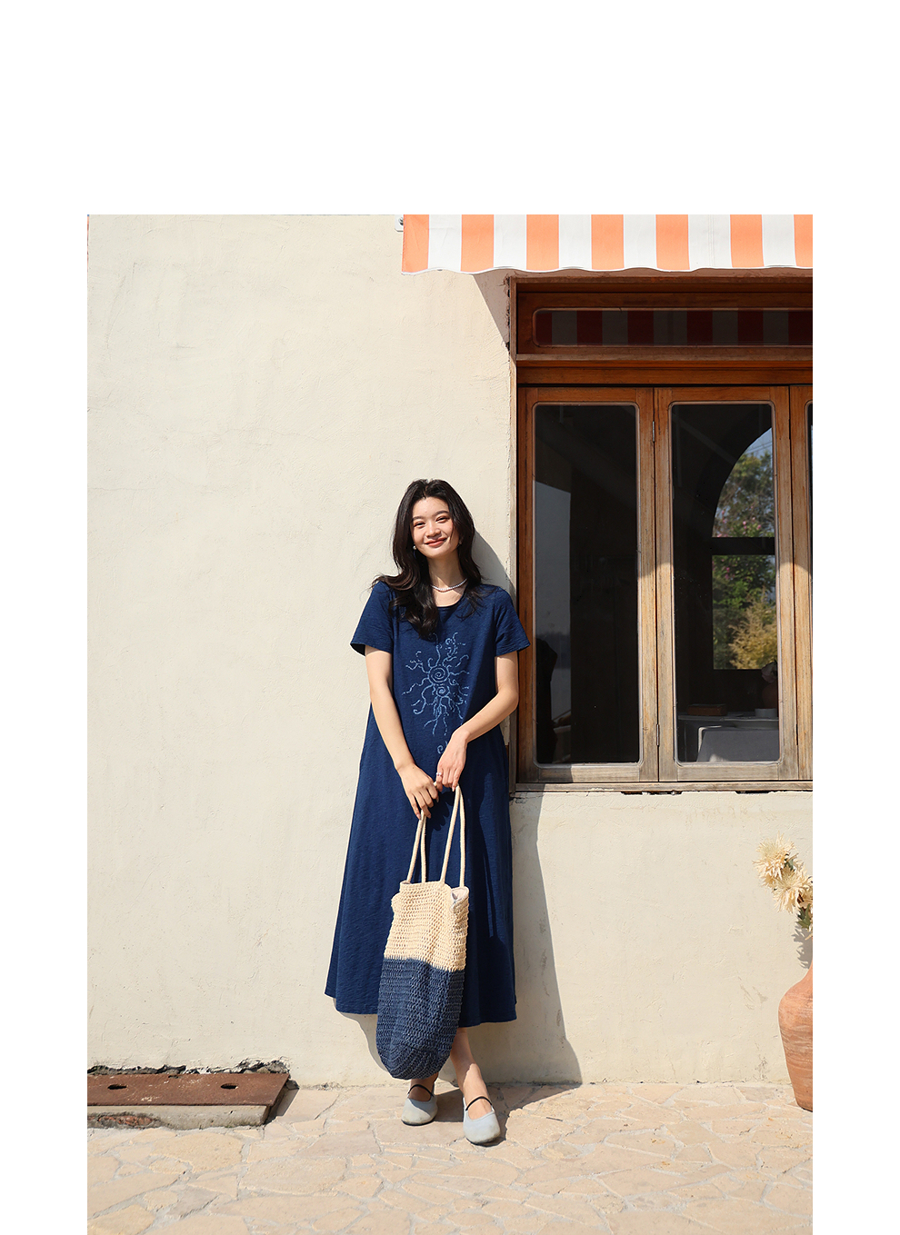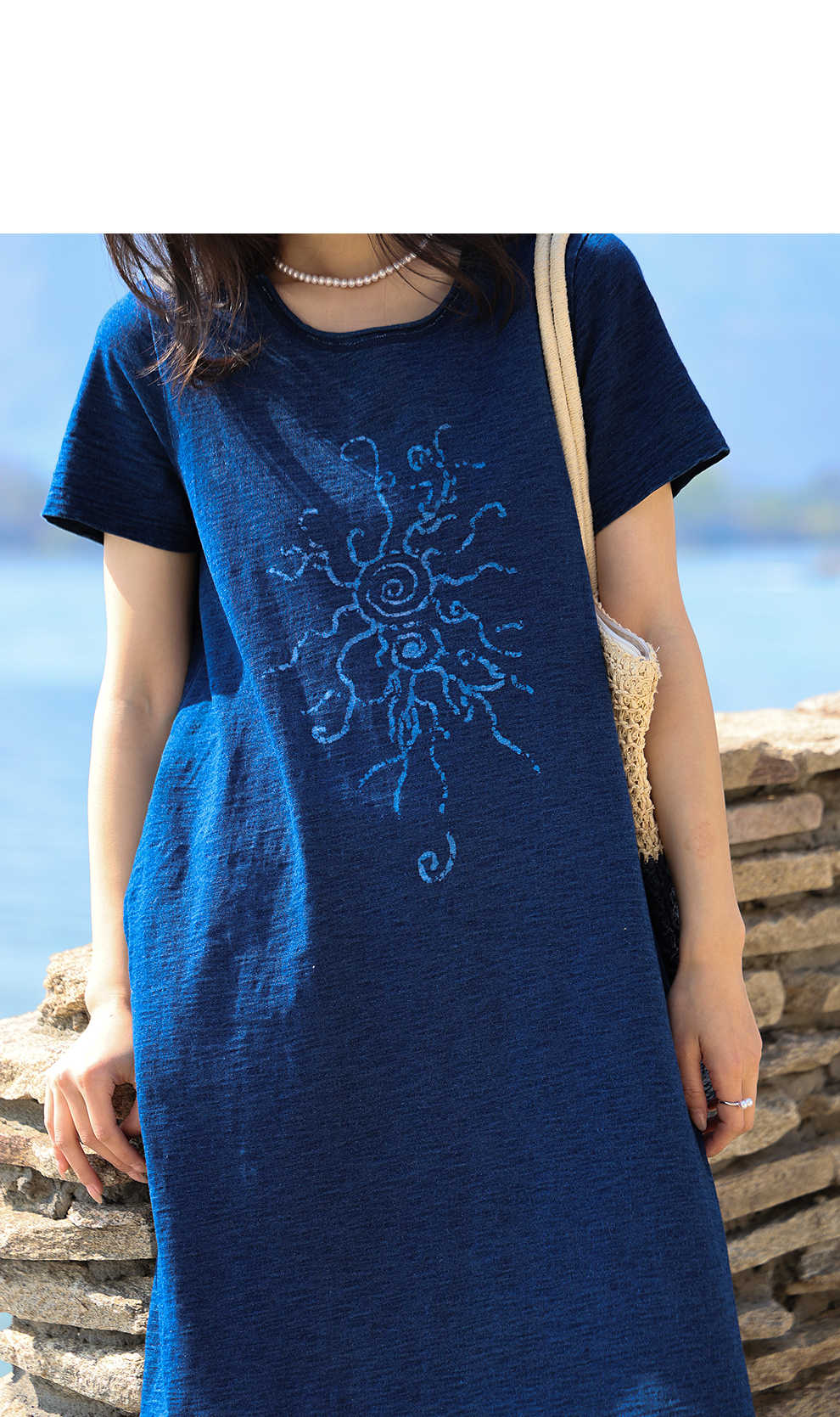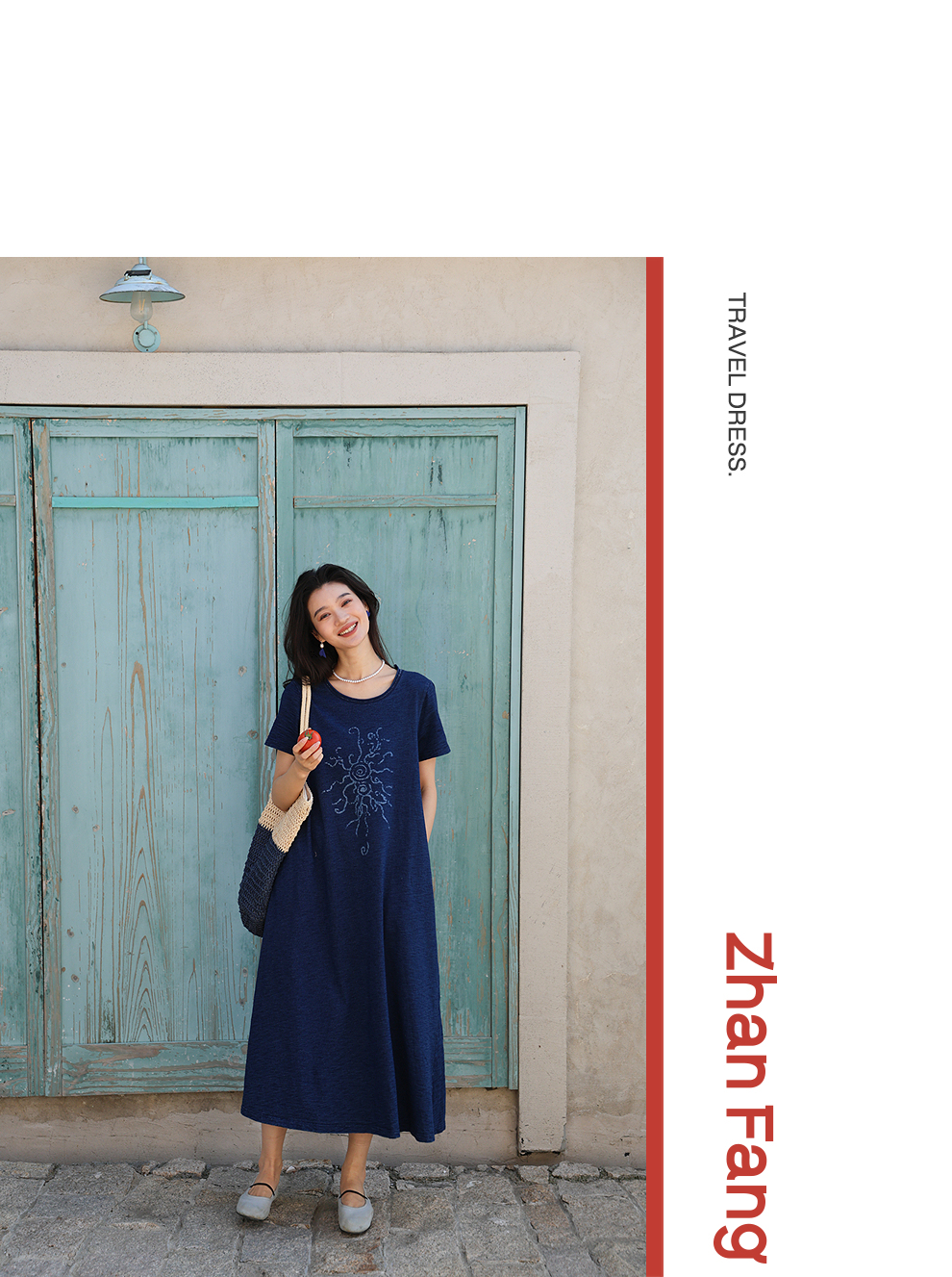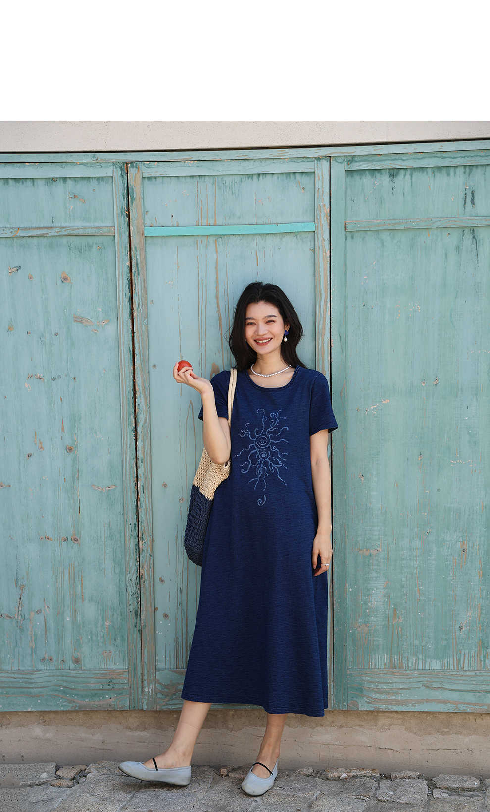 绽放旅行女装234朵/竹节棉针织手绘螺旋花短袖连衣裙舒适透气百搭