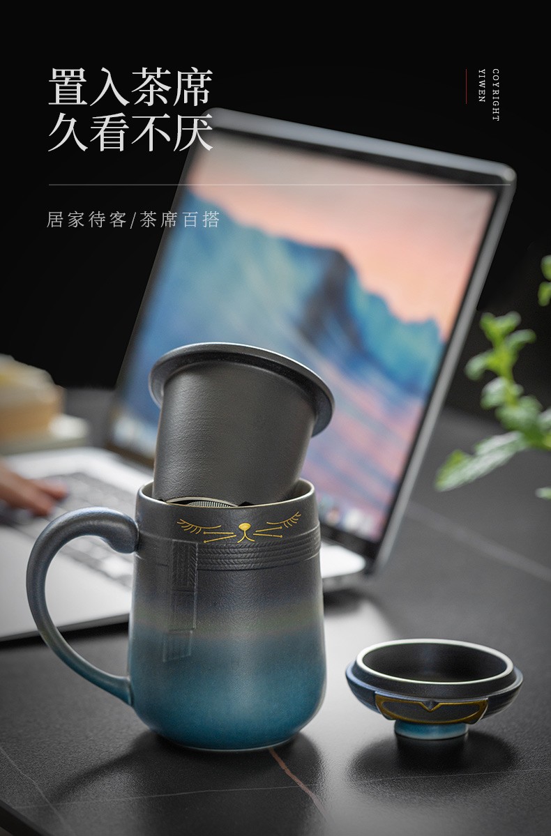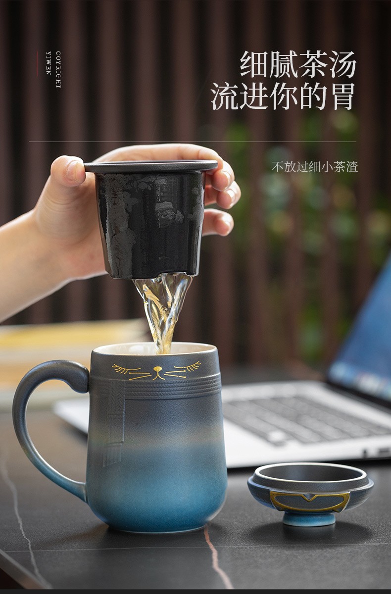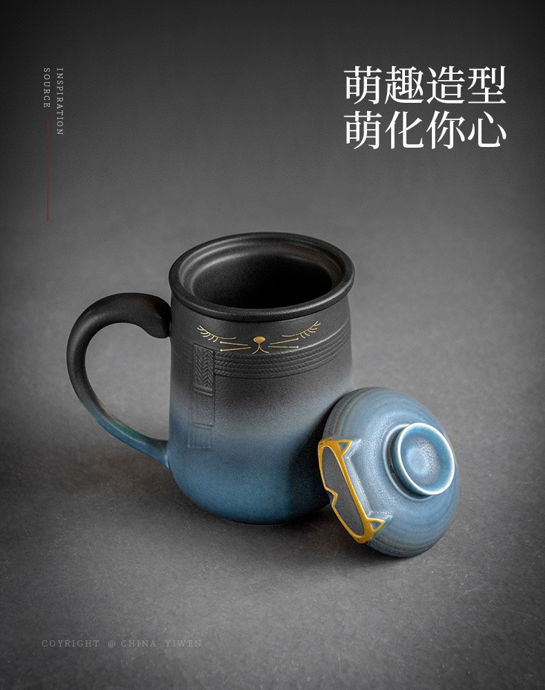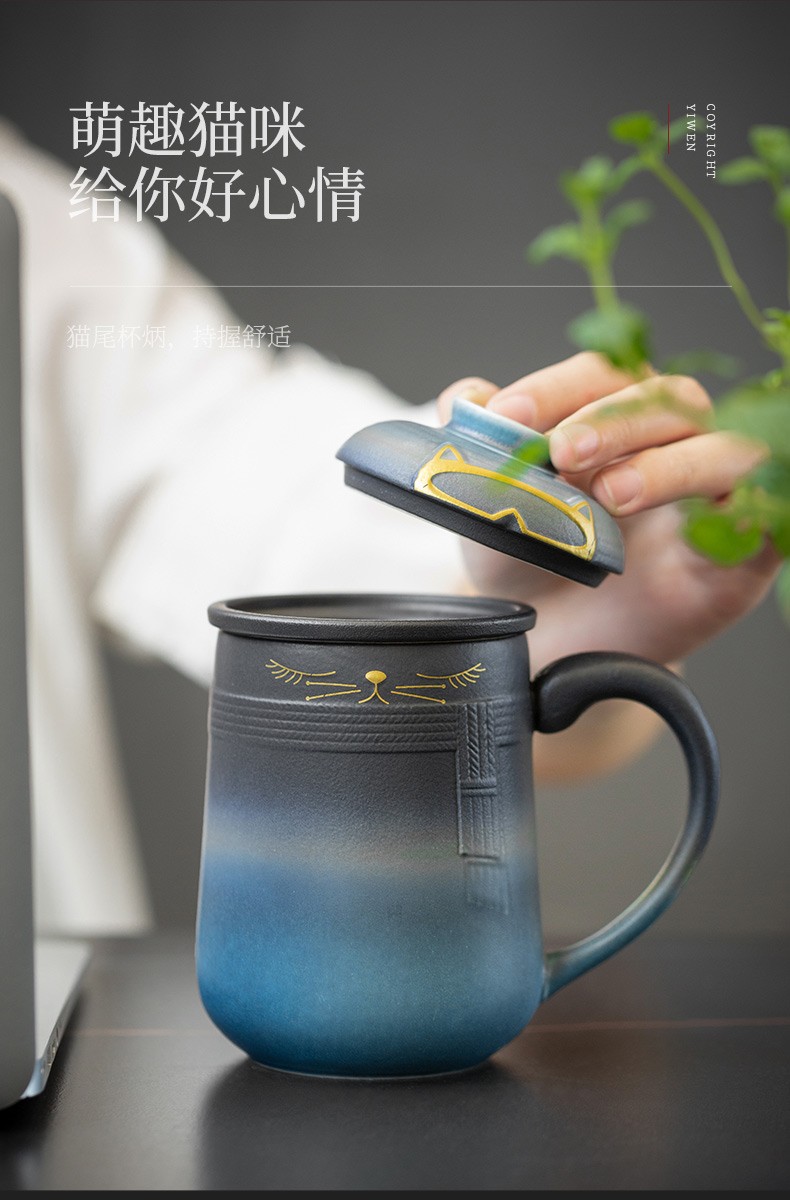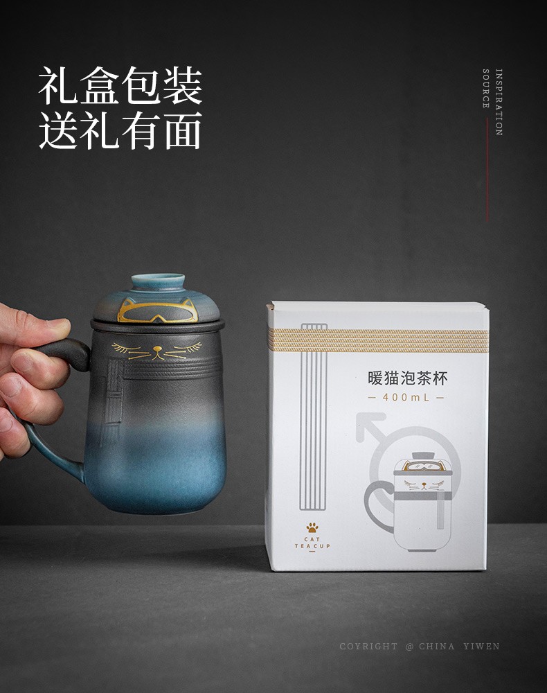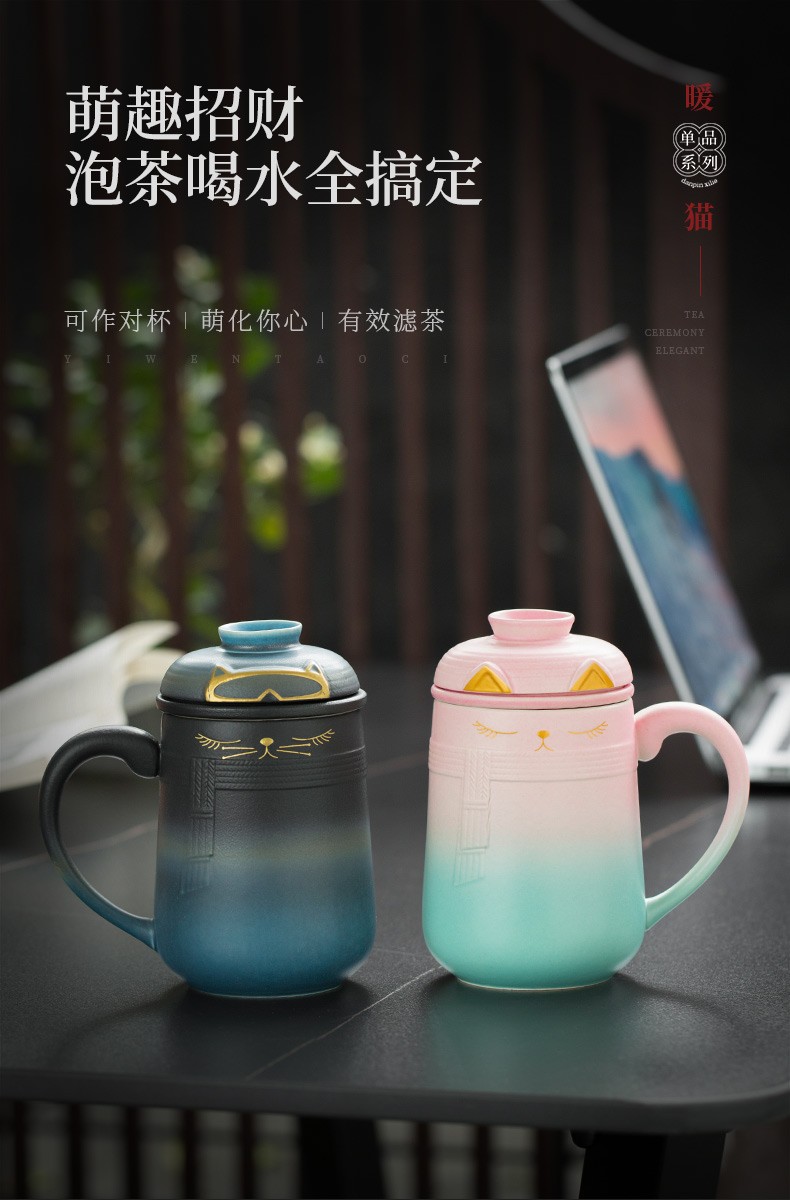 陶瓷暖猫泡茶杯创意马克杯茶杯陶瓷过滤水杯带盖情侣对杯杯子 暖猫杯 男款-渐变黑蓝E1e(言调)