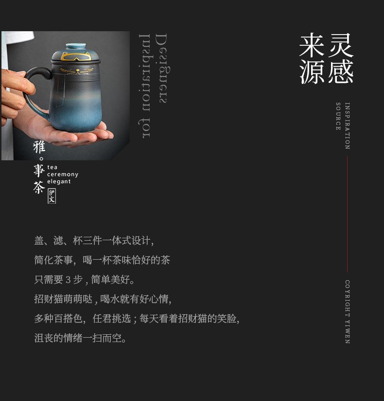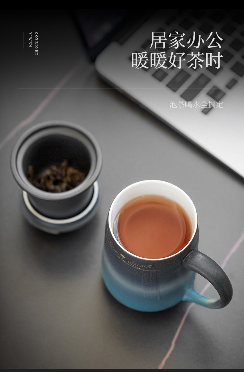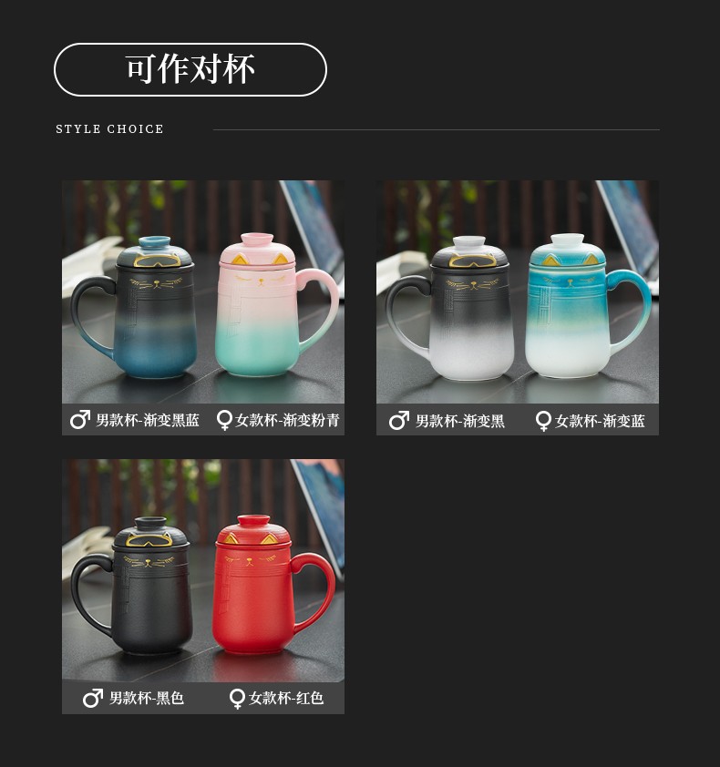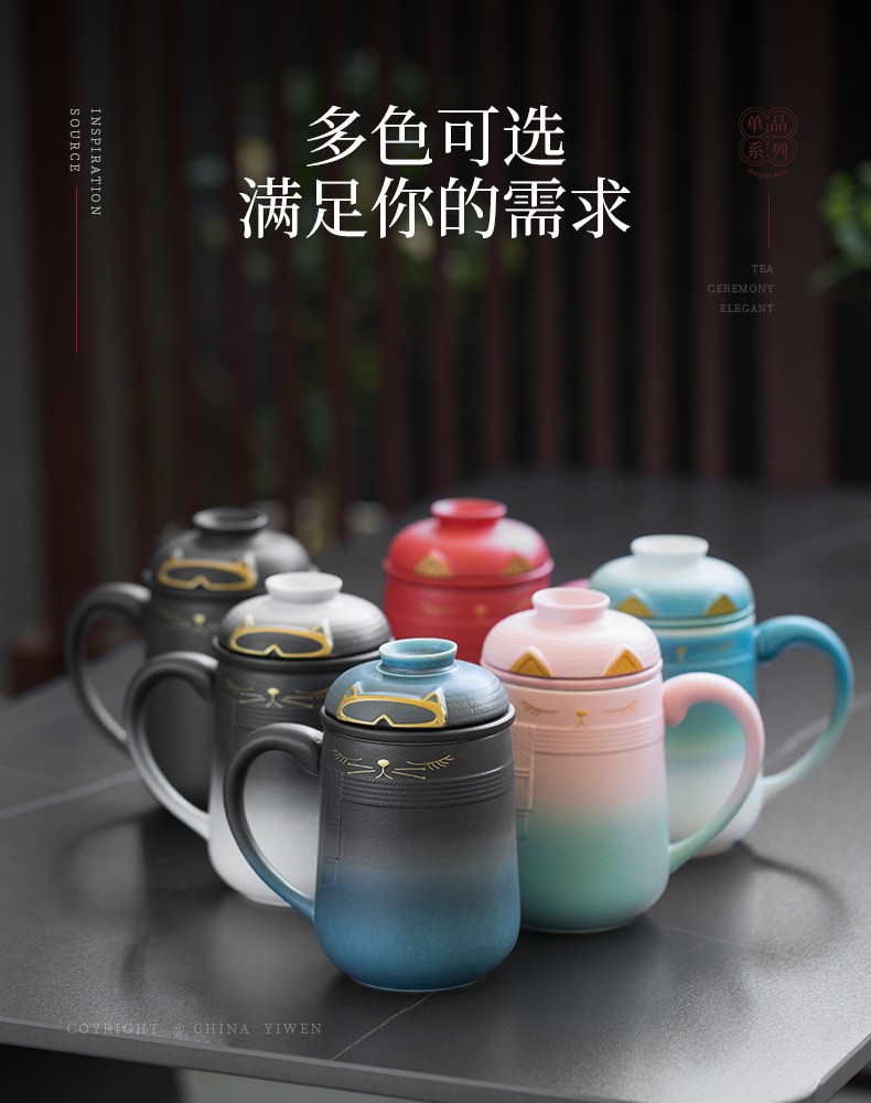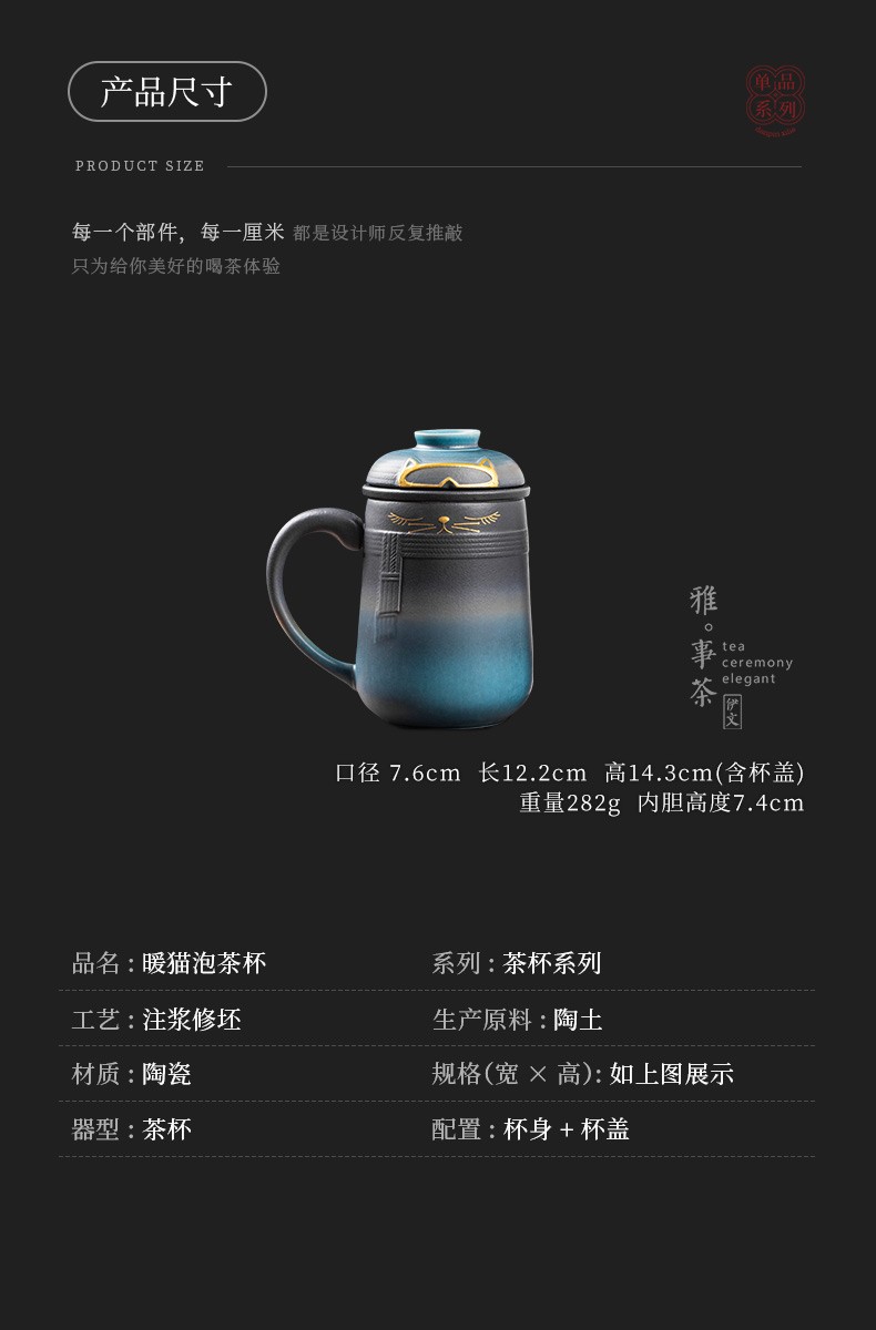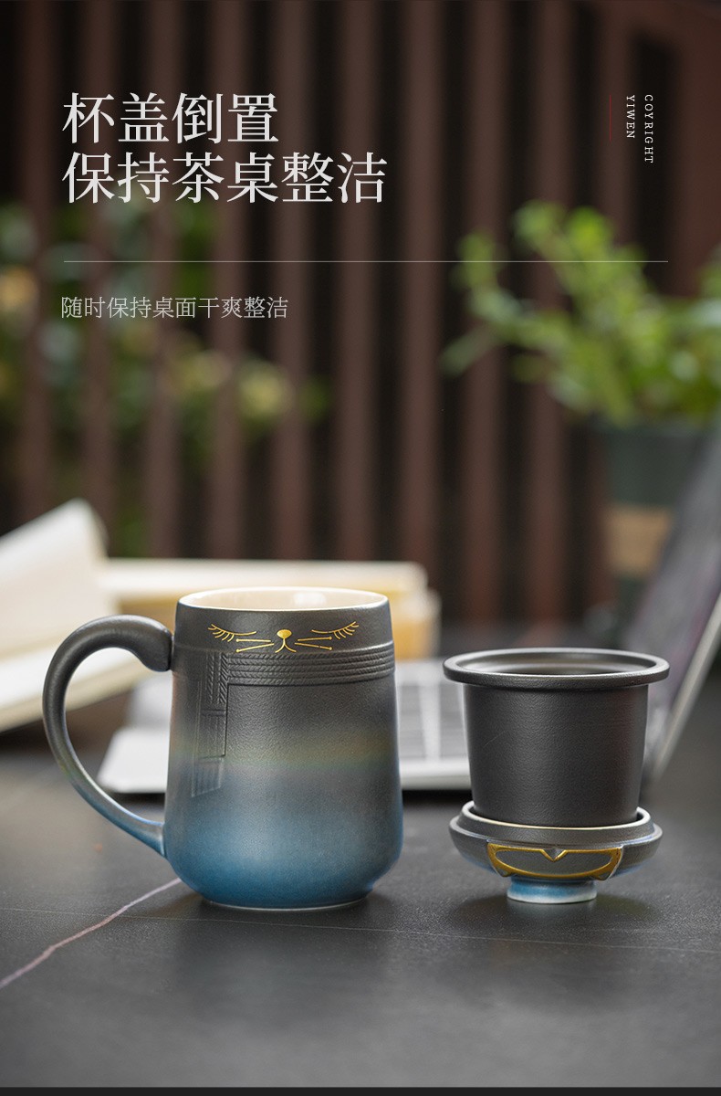 陶瓷暖猫泡茶杯创意马克杯茶杯陶瓷过滤水杯带盖情侣对杯杯子 暖猫杯 男款-渐变黑蓝E1e(言调)