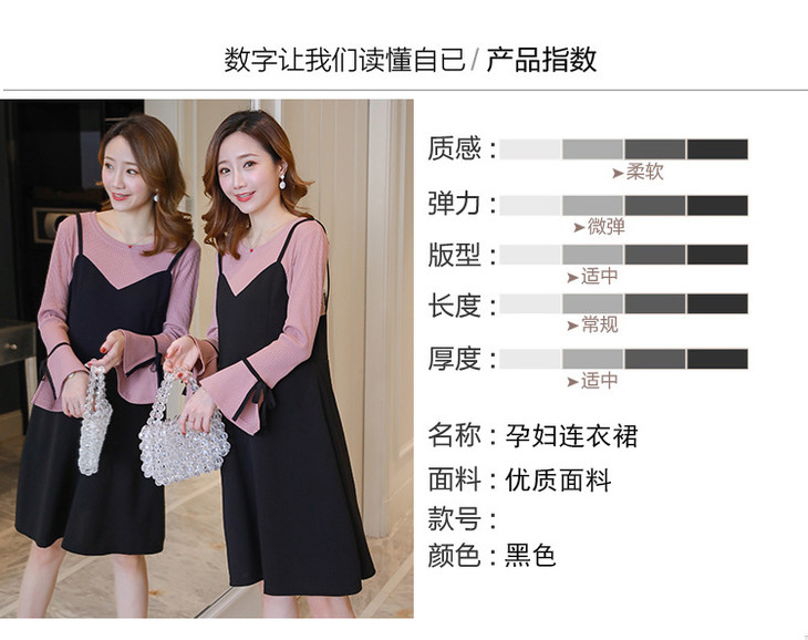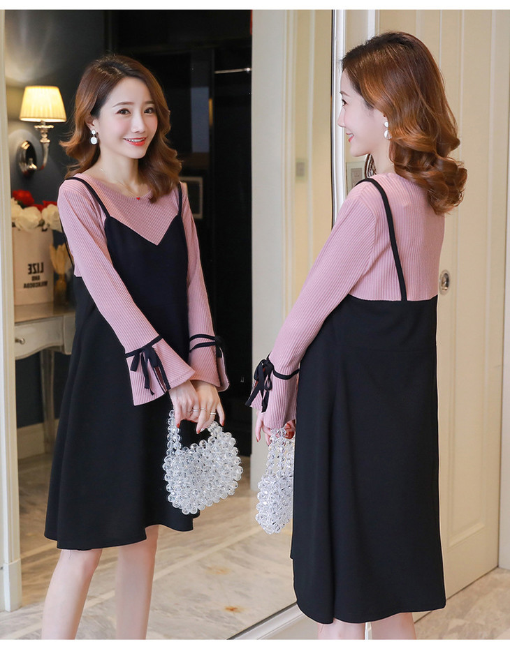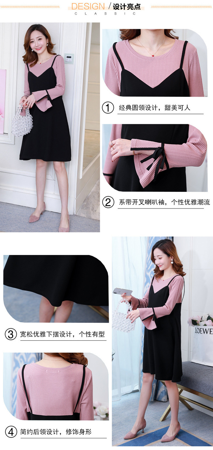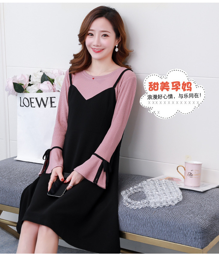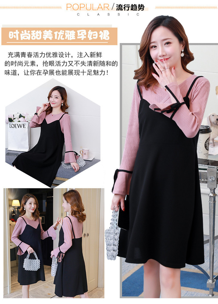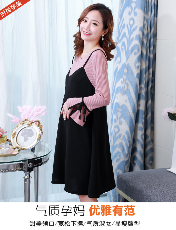 【孕妇装】春秋新款孕妇时尚长袖假两件拼接中长款孕妇连衣裙