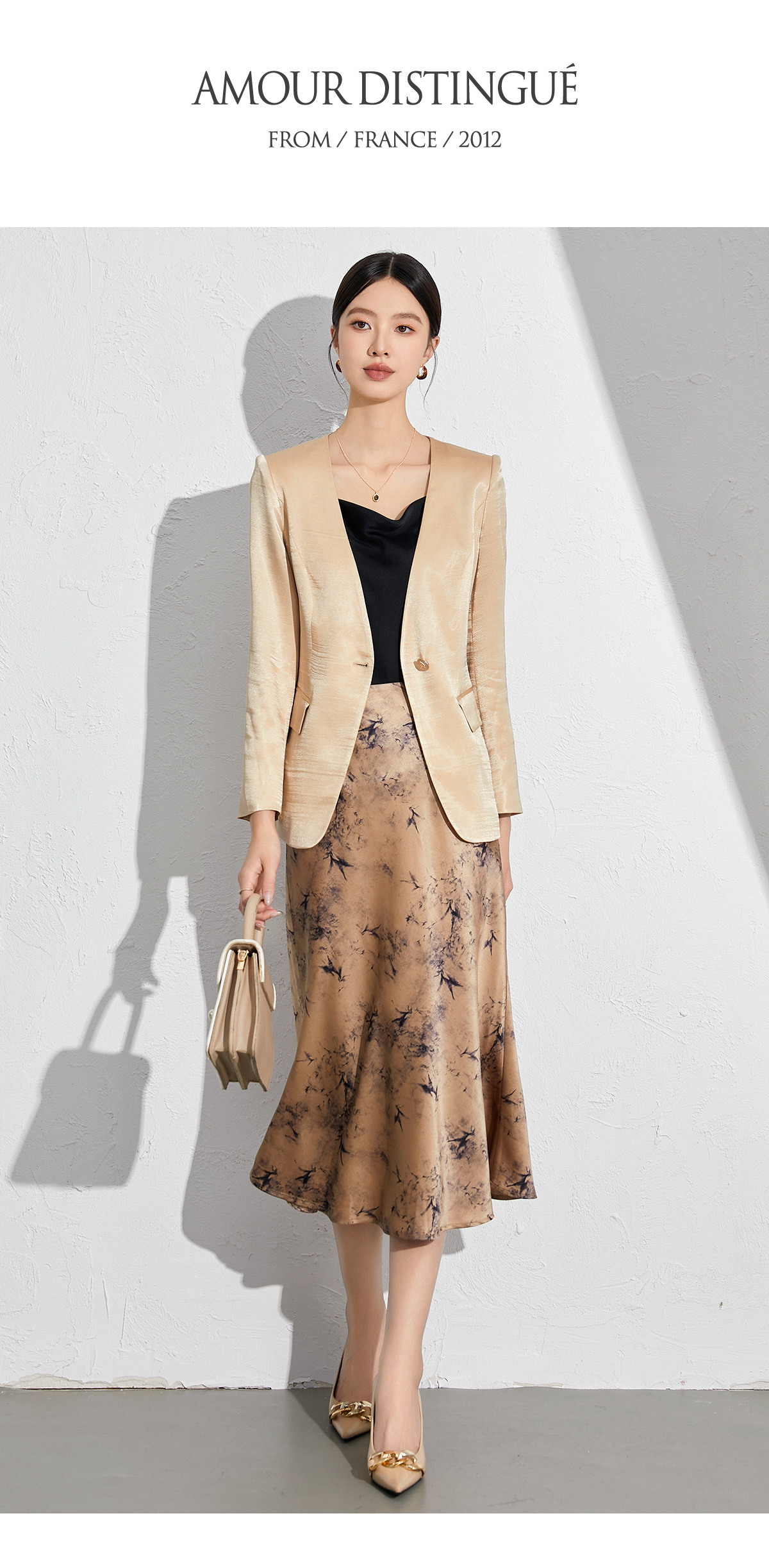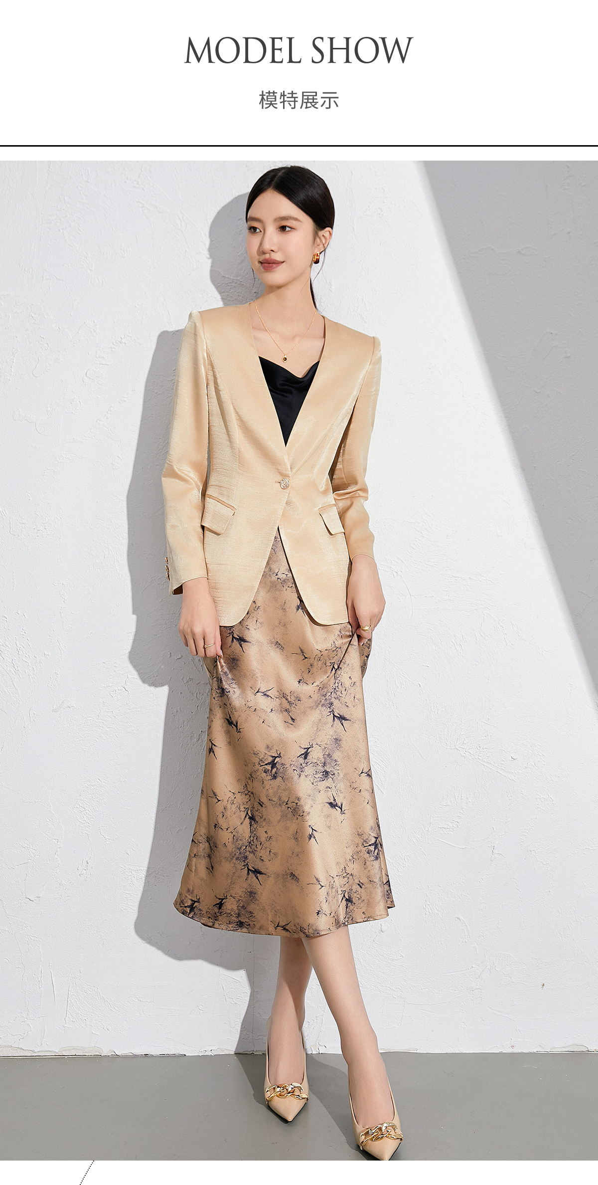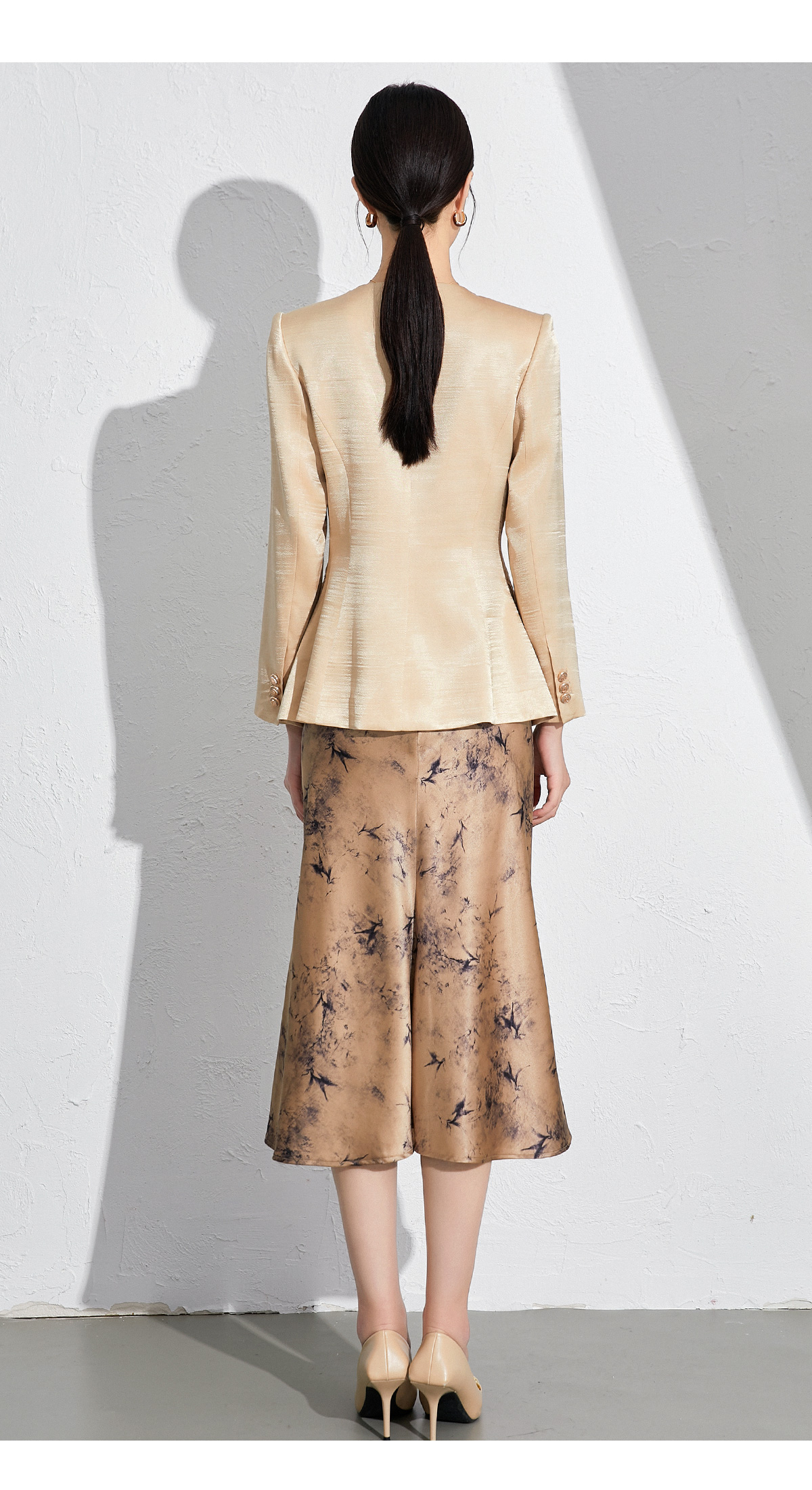 气质知性名媛卡其色天丝缎面国风印花焦糖色鱼尾裙西装套装两件套
