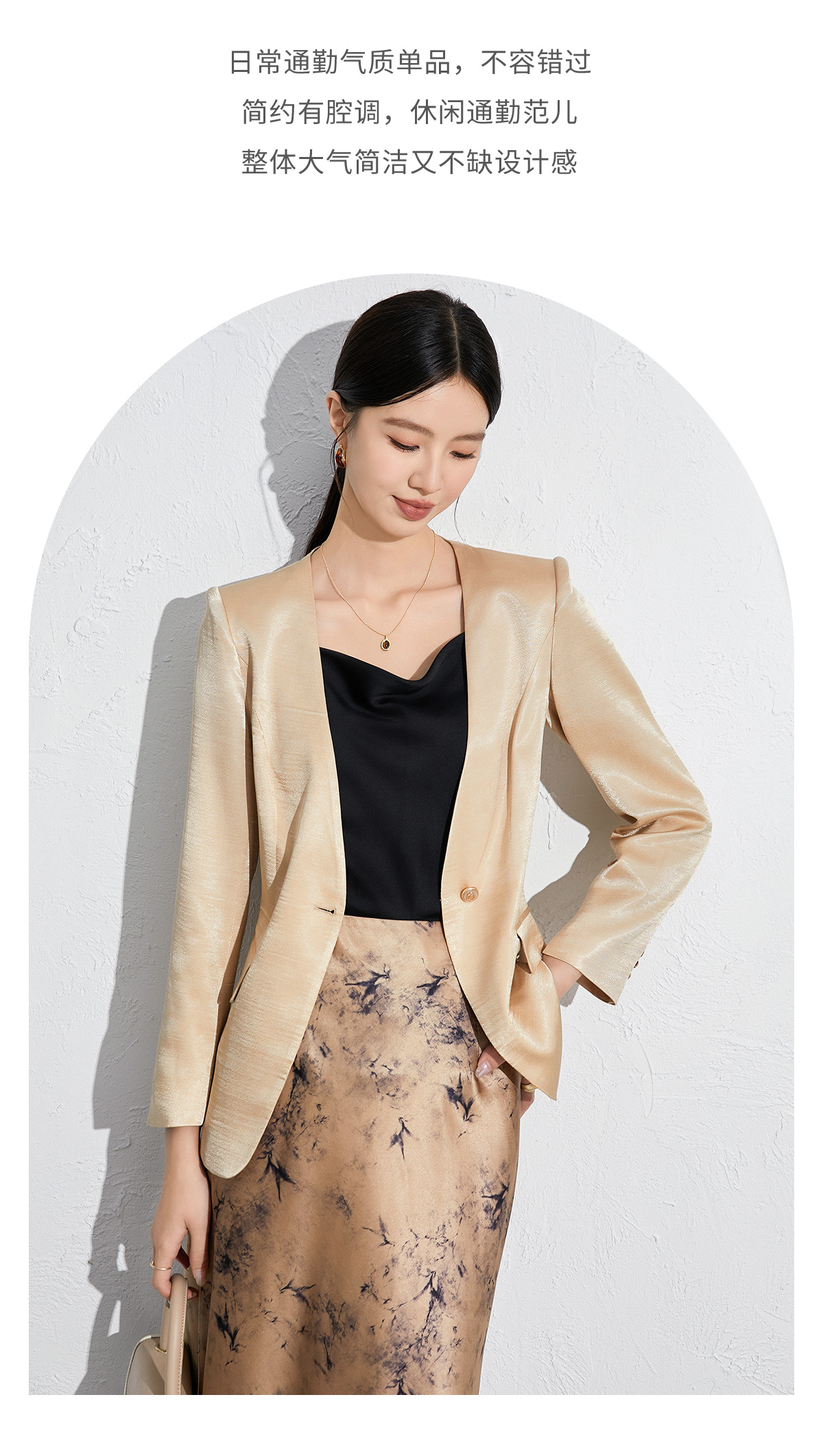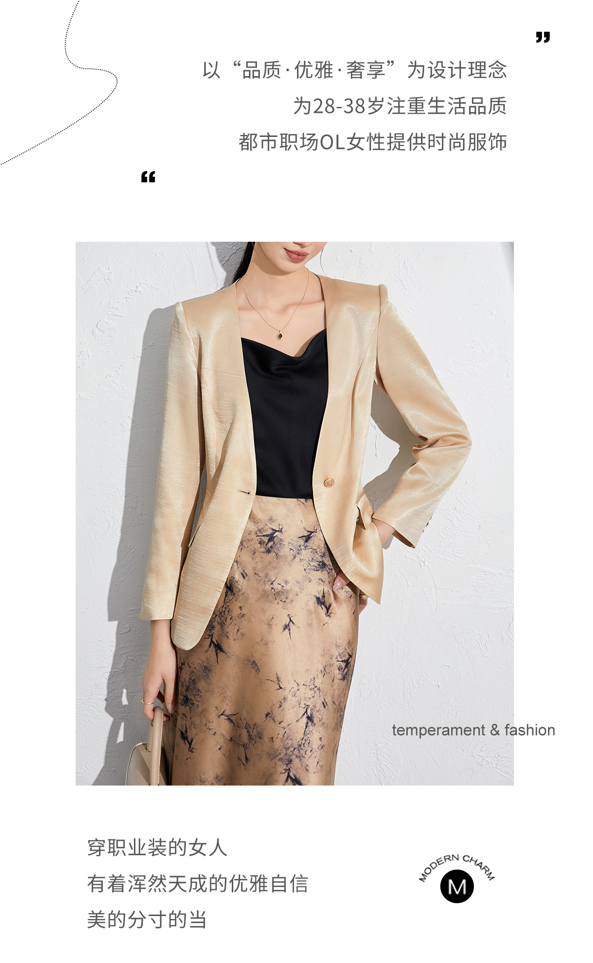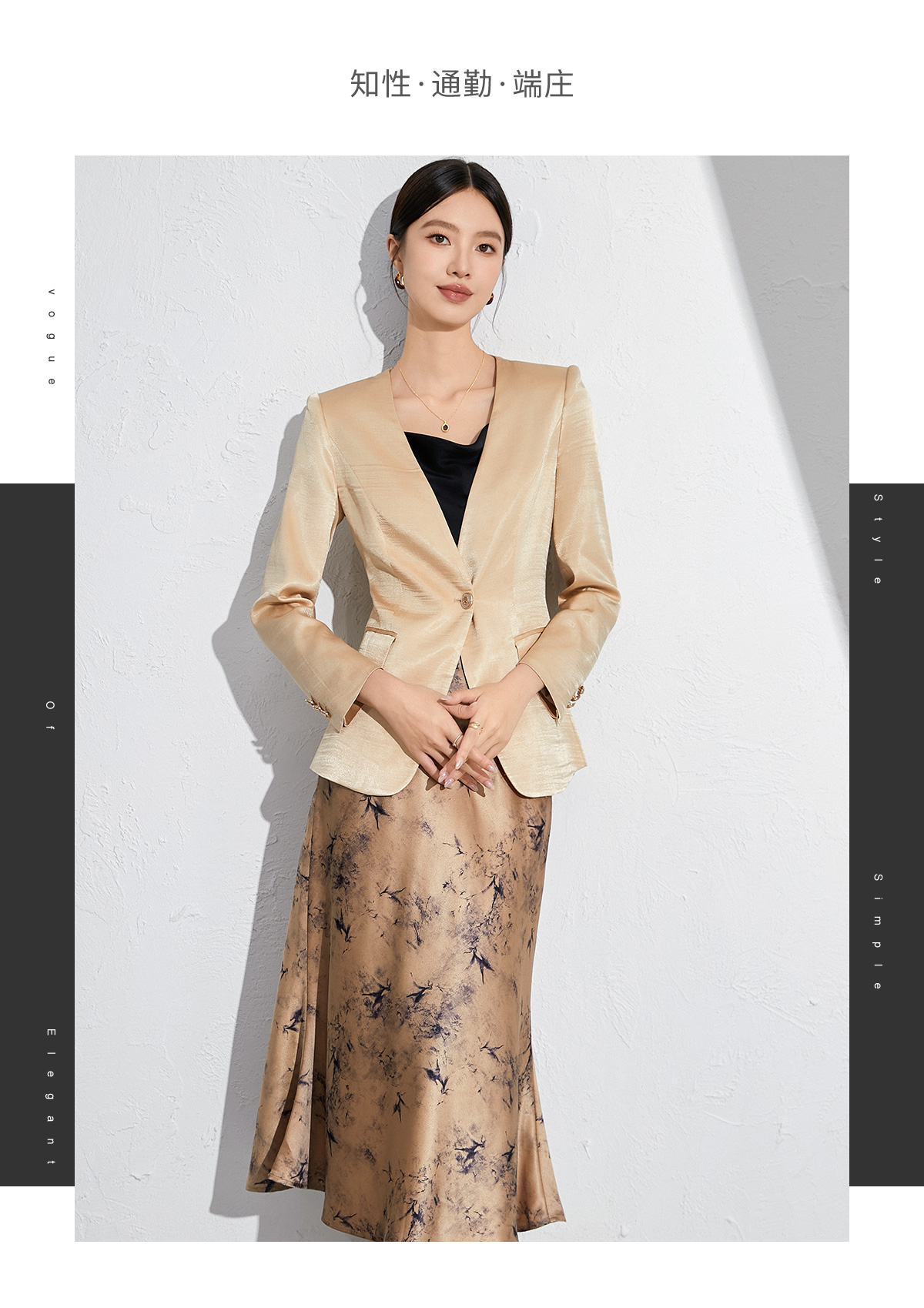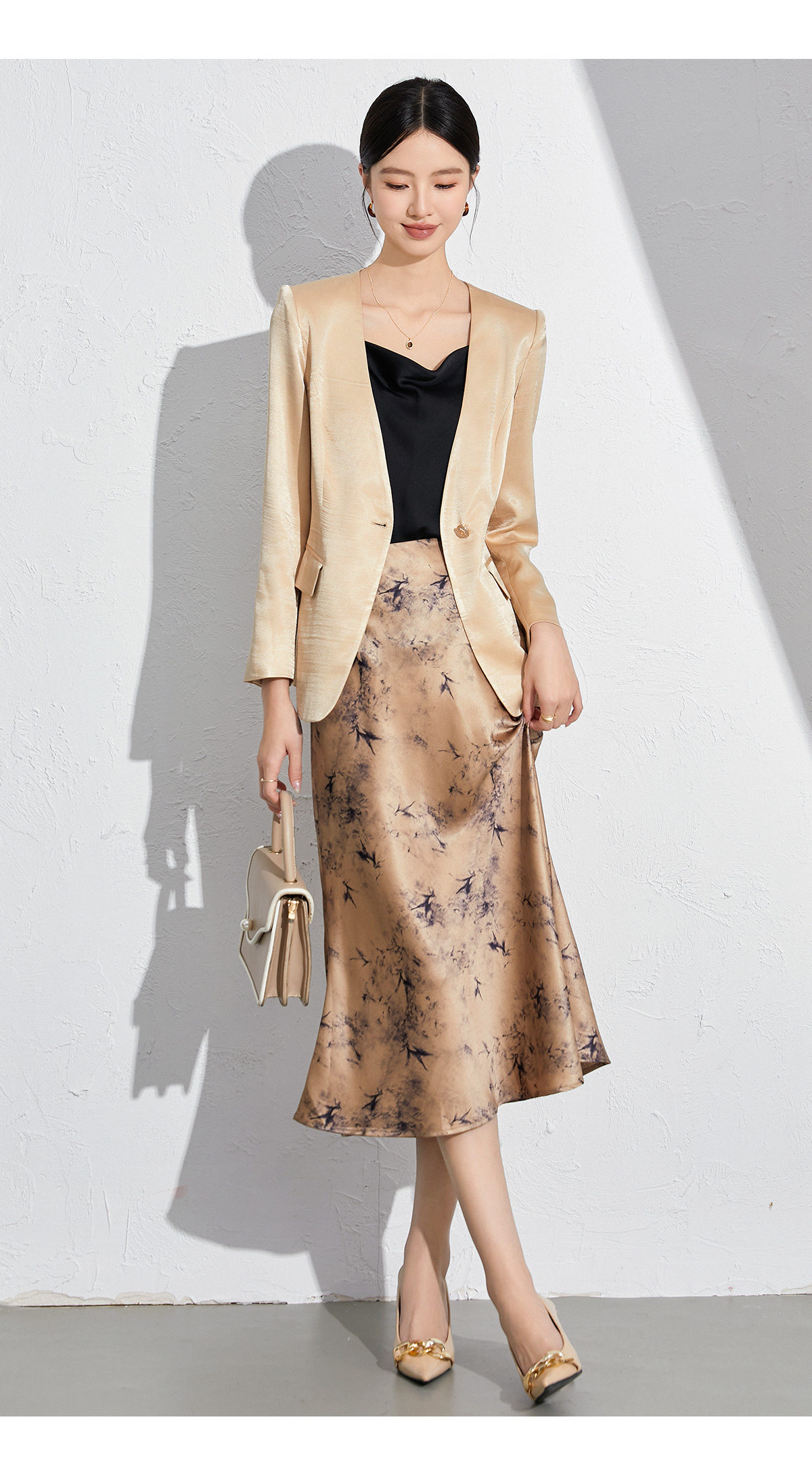 气质知性名媛卡其色天丝缎面国风印花焦糖色鱼尾裙西装套装两件套