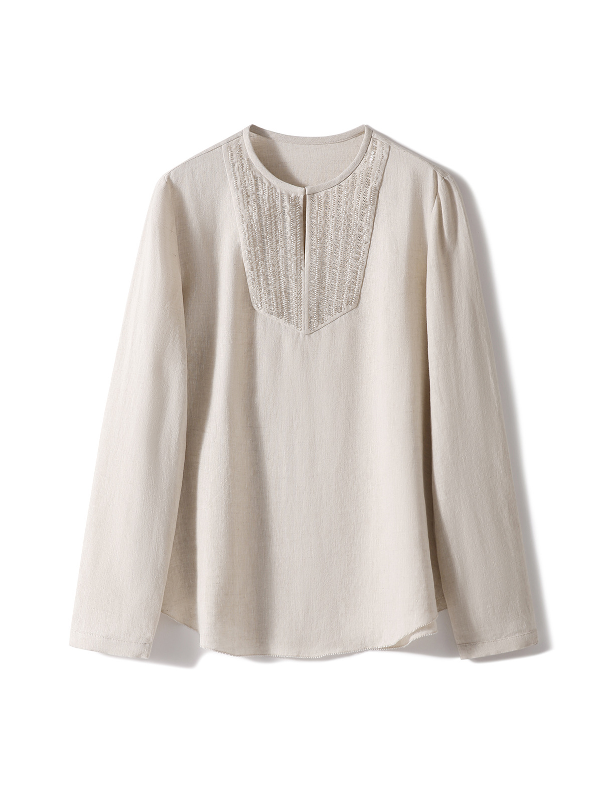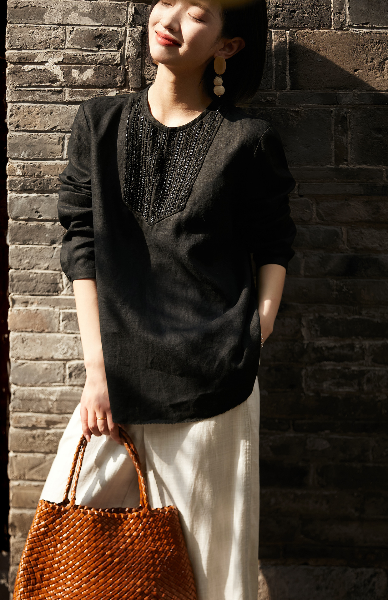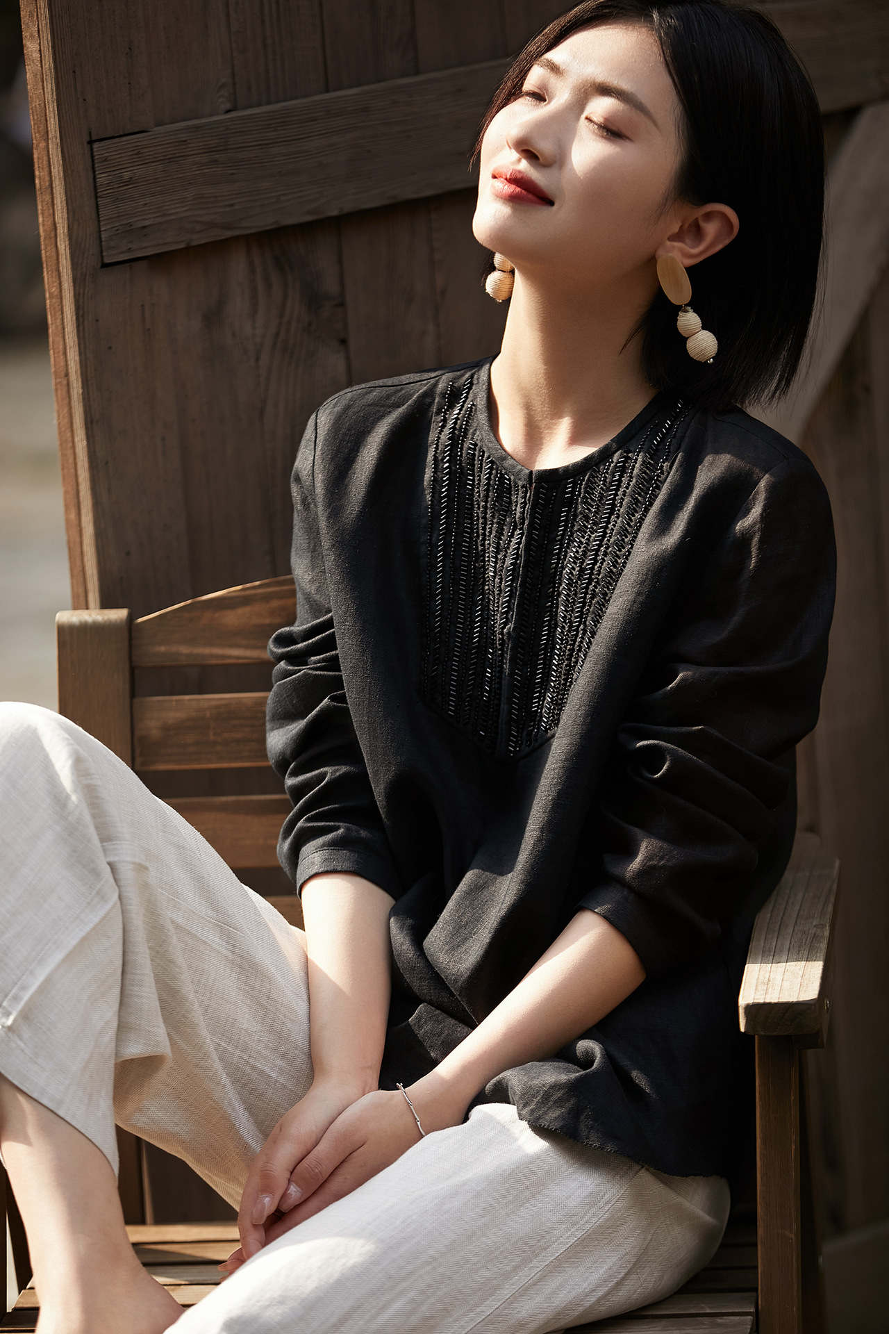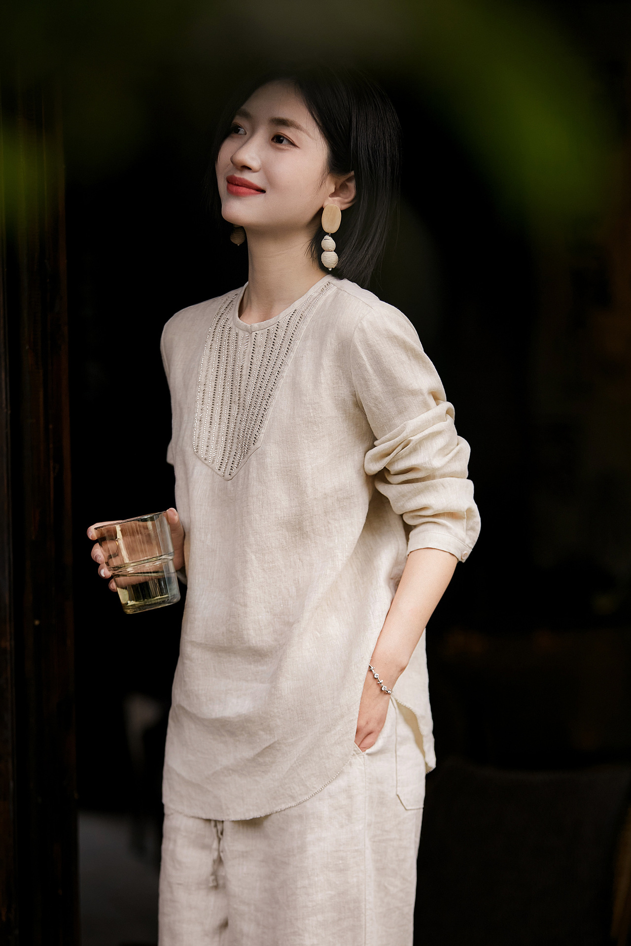 拆分绣制轨迹中间用珠链相隔,机器绣,漏珠子后期需要用手工匠人去逐寸补钉,是一项耗时耗力的工艺凸显品质,这样的一件亚麻小衫的舒'适体验,都市通勤不能少的。舒爽透气、贴肤微凉,没有那么强的正式感