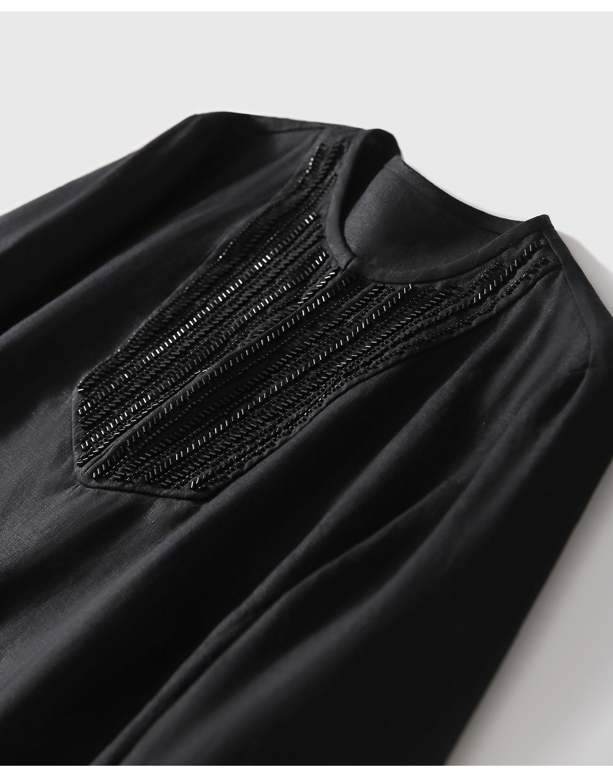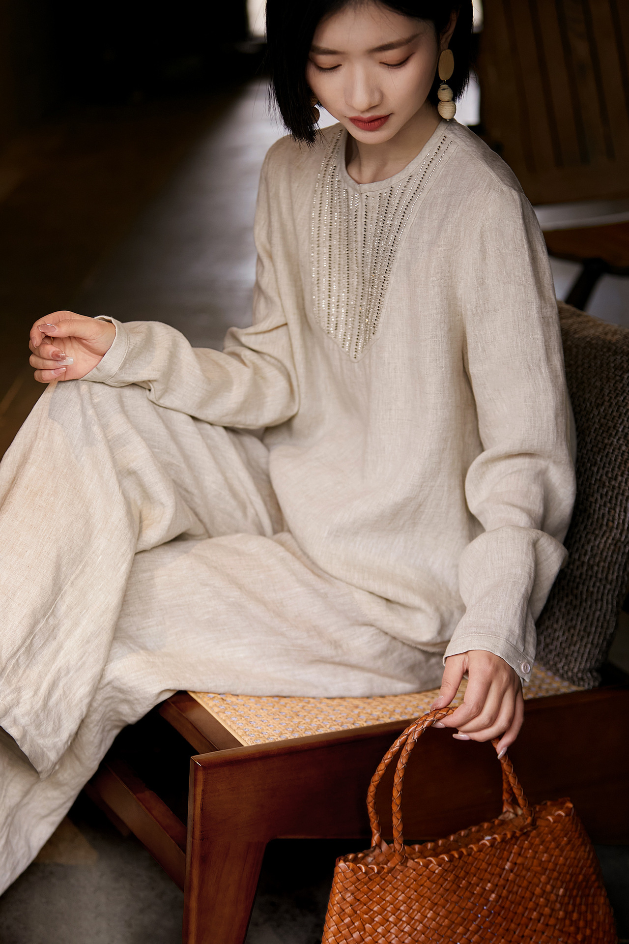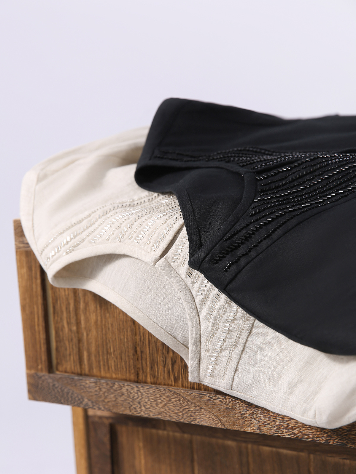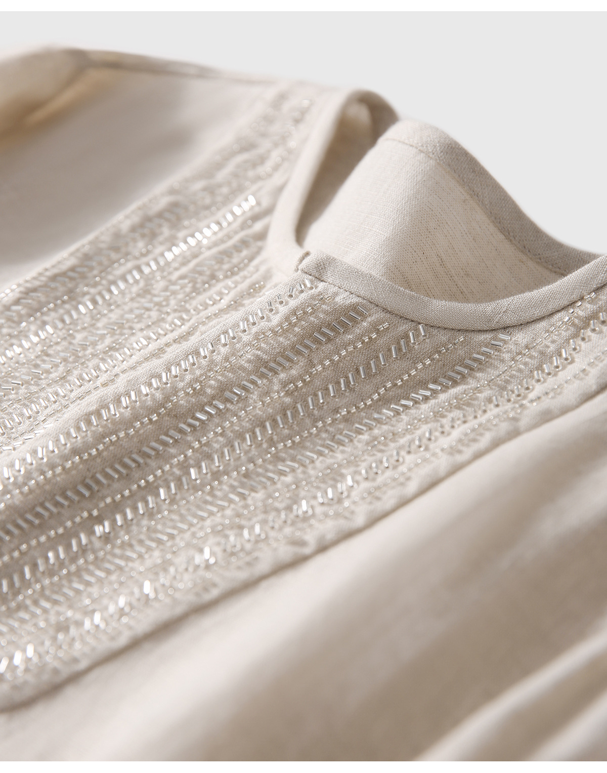 前襟珠链与亚麻配合融洽增添不一般的灵动效果!