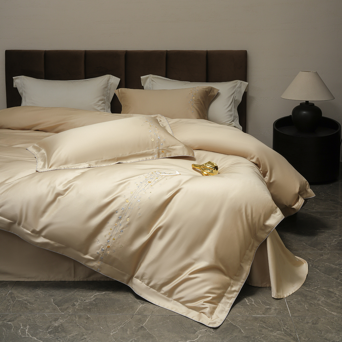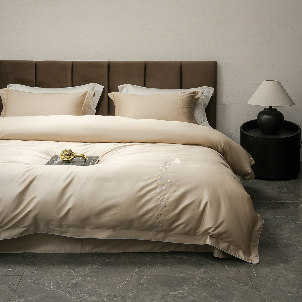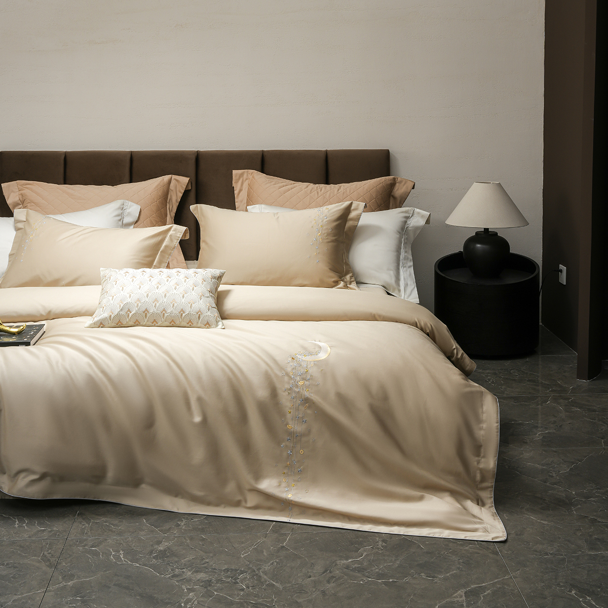 采用100%新疆长绒棉贡缎,80S双股织造,触感丝滑亲肤,睡眠如沐月光。被角与枕套缀以精致金银刺绣,灵动高贵,轻奢细节处处动人~