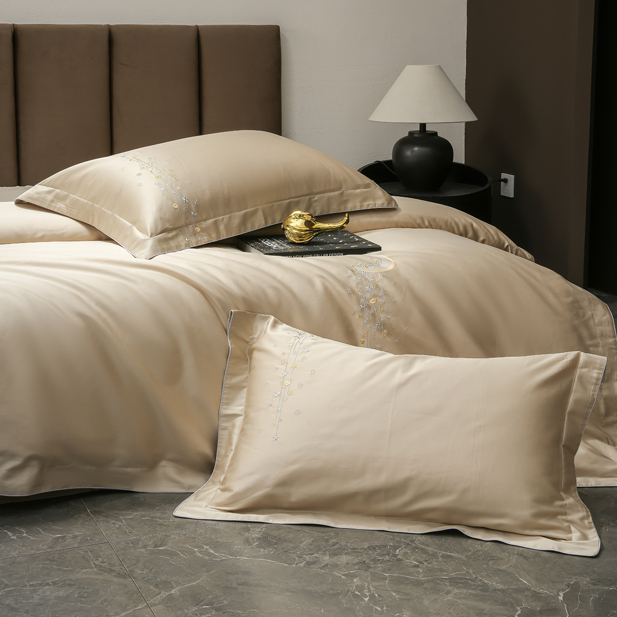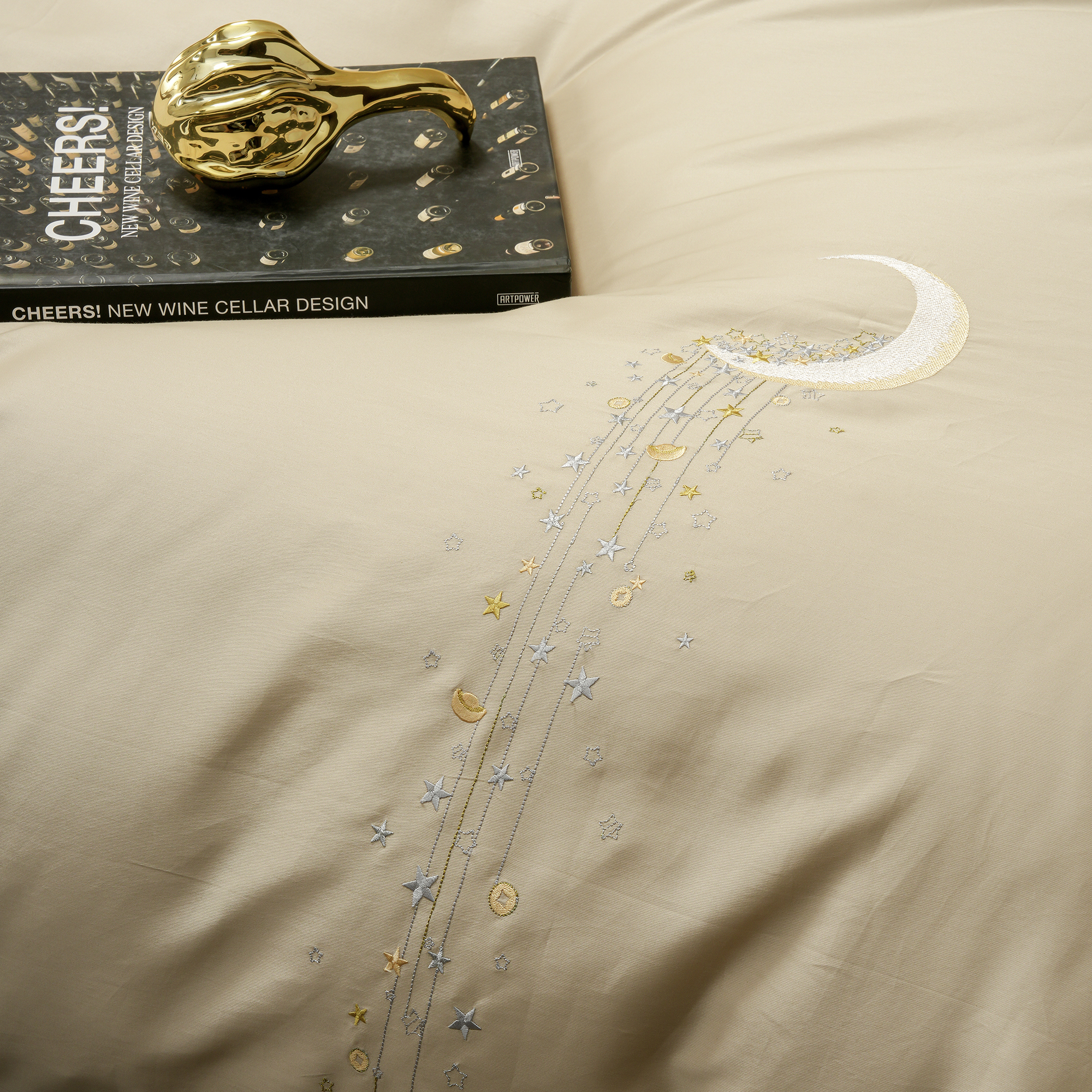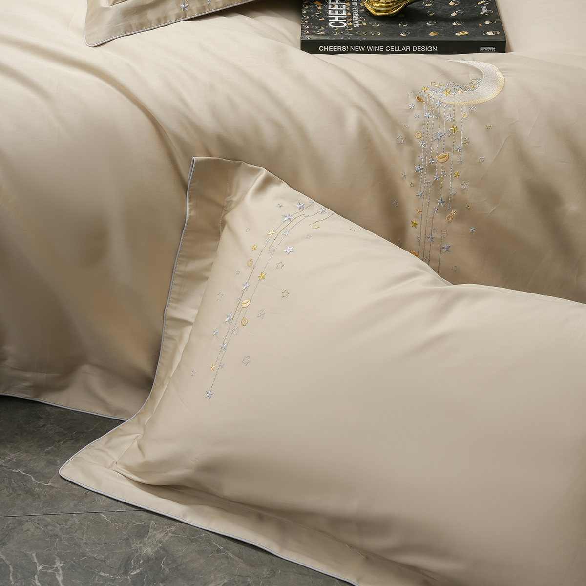 采用100%新疆长绒棉贡缎,80S双股织造,触感丝滑亲肤,睡眠如沐月光。被角与枕套缀以精致金银刺绣,灵动高贵,轻奢细节处处动人~