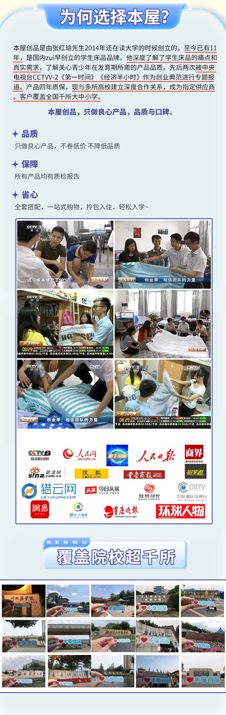 - 成立于2014年,2次被央视专题报道,从为中国大学生提供一套好床品开始,重新定义校园宿舍品质生活。以"纯棉舒适、安全环保、现代简约"为设计原点,还构建校园成长生态,为大学生提供实习机会。